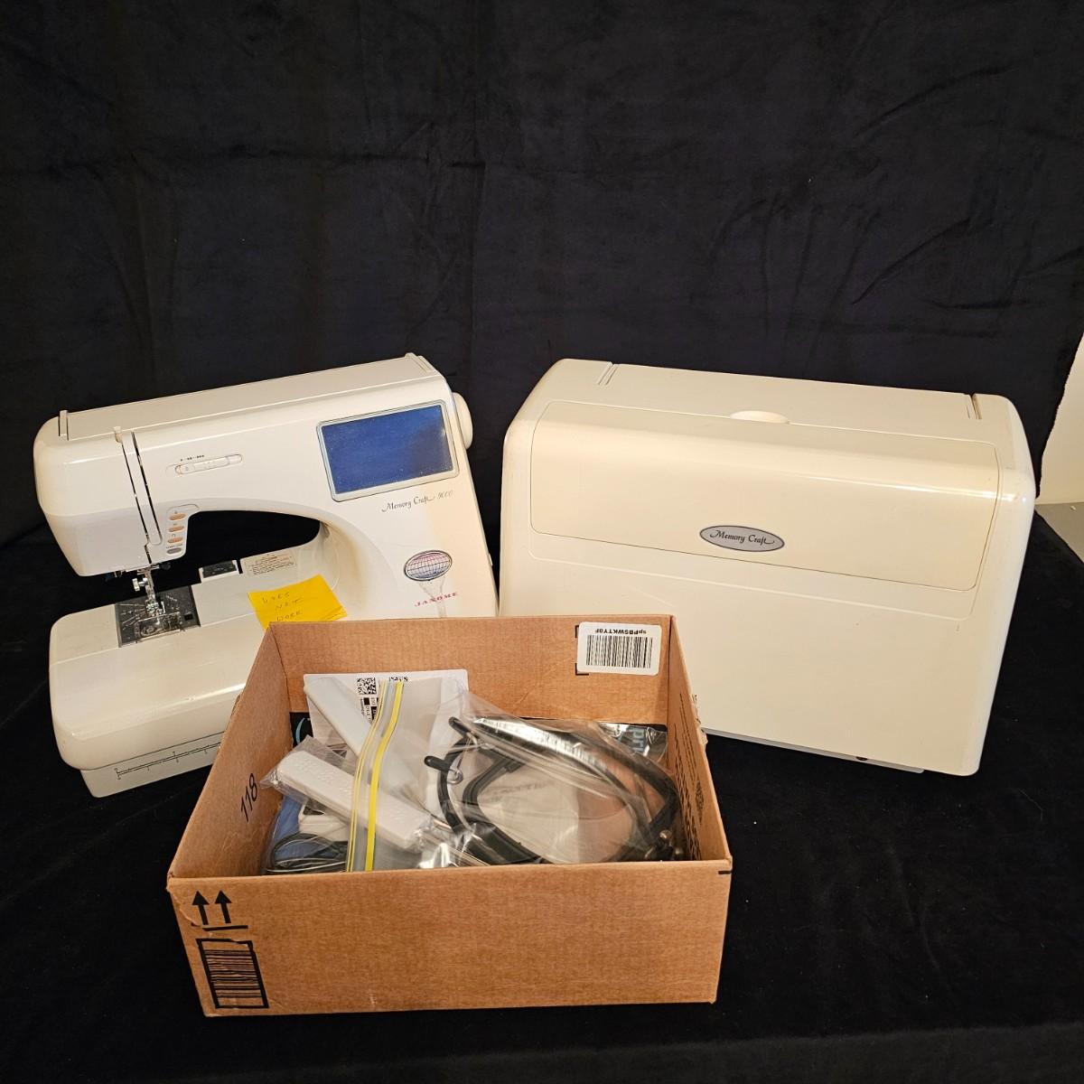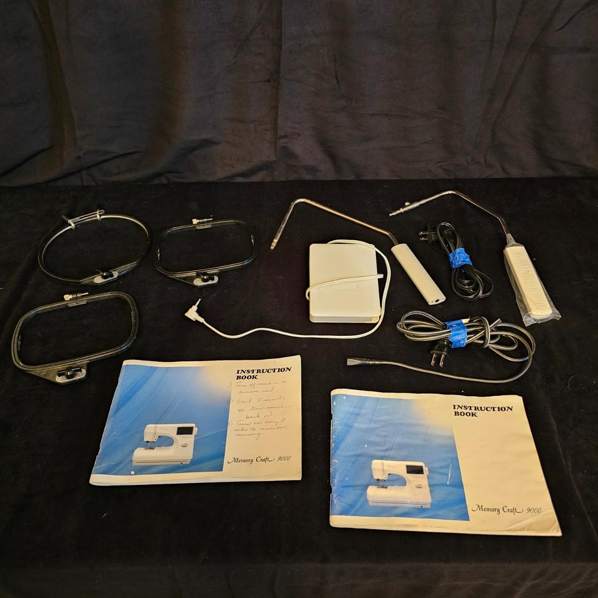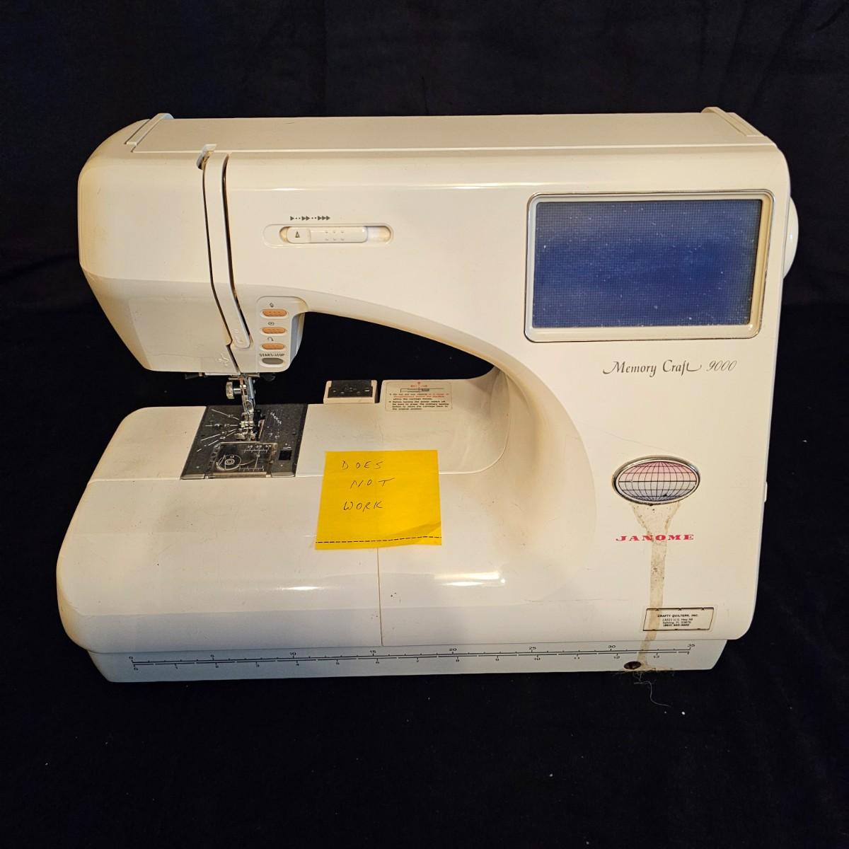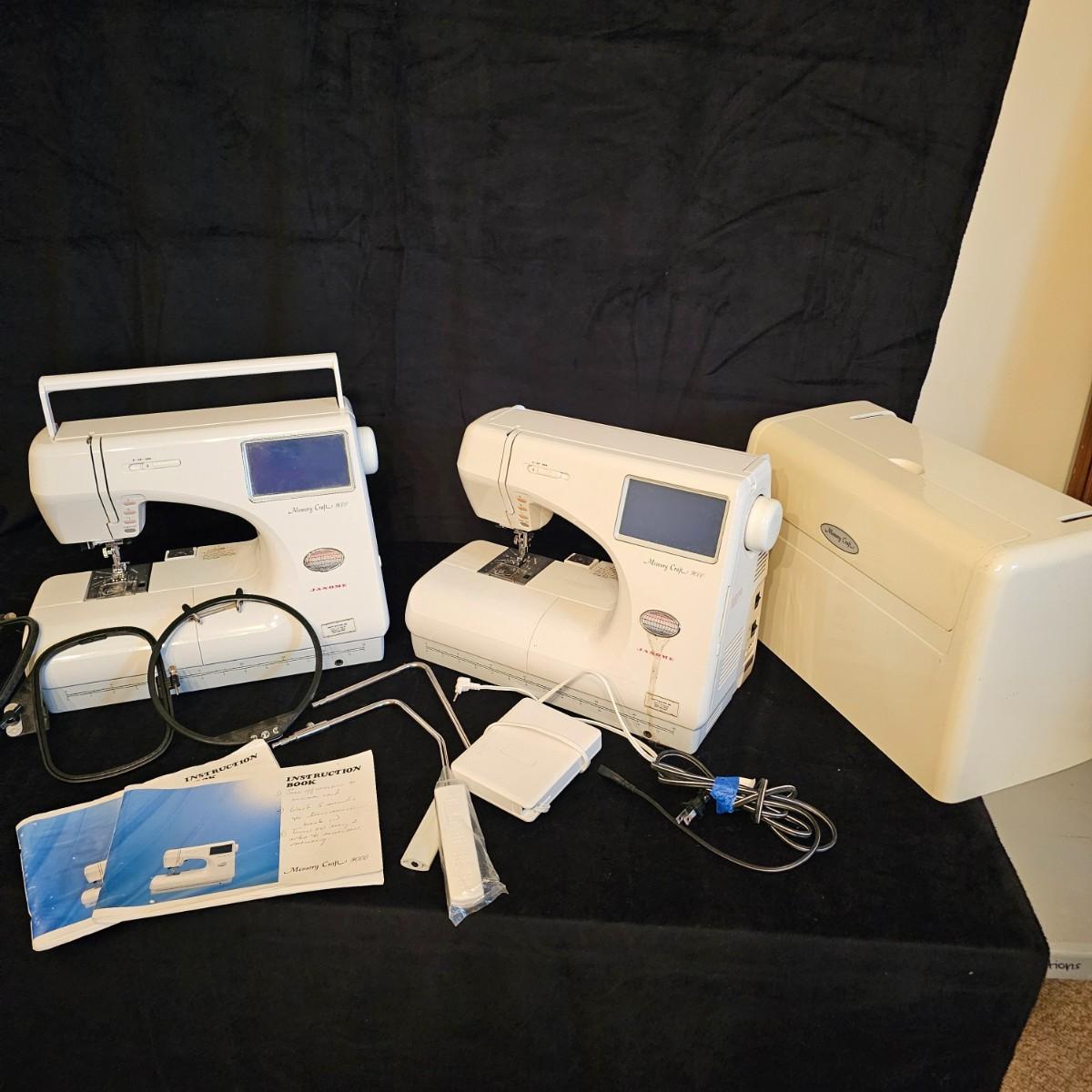 Two Janome Memory Craft 9000 sewing machines, one working, one for parts. Power cords and knee bars for both but only one foot switch. These are computer controlled machines and have some embroidery capability. Model has 326 built in stitches and 6 buttonhole options, auto needle threading. Each unit measures 17.5" x 9" x 12"H. There are three embroidery hoops included, two 5" x 6.5" and one 7" round. One machine powered on when plugged in, other did not. One hard shell cover with storage, and both units have accessory storage drawers in front. See photos for details. Local pickup only.