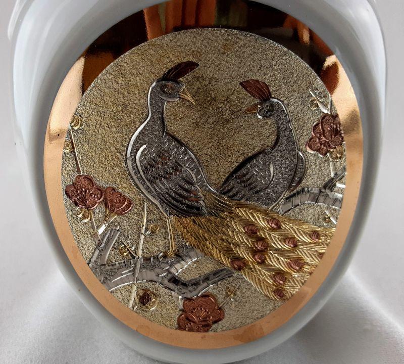 Beautiful peacock design on this porcelain vase measuring 5.5in. tall and 3in. wide.