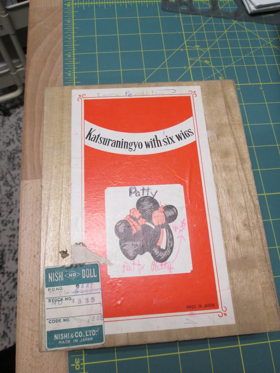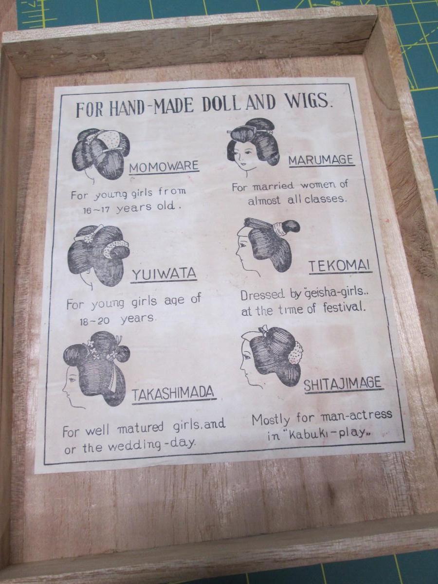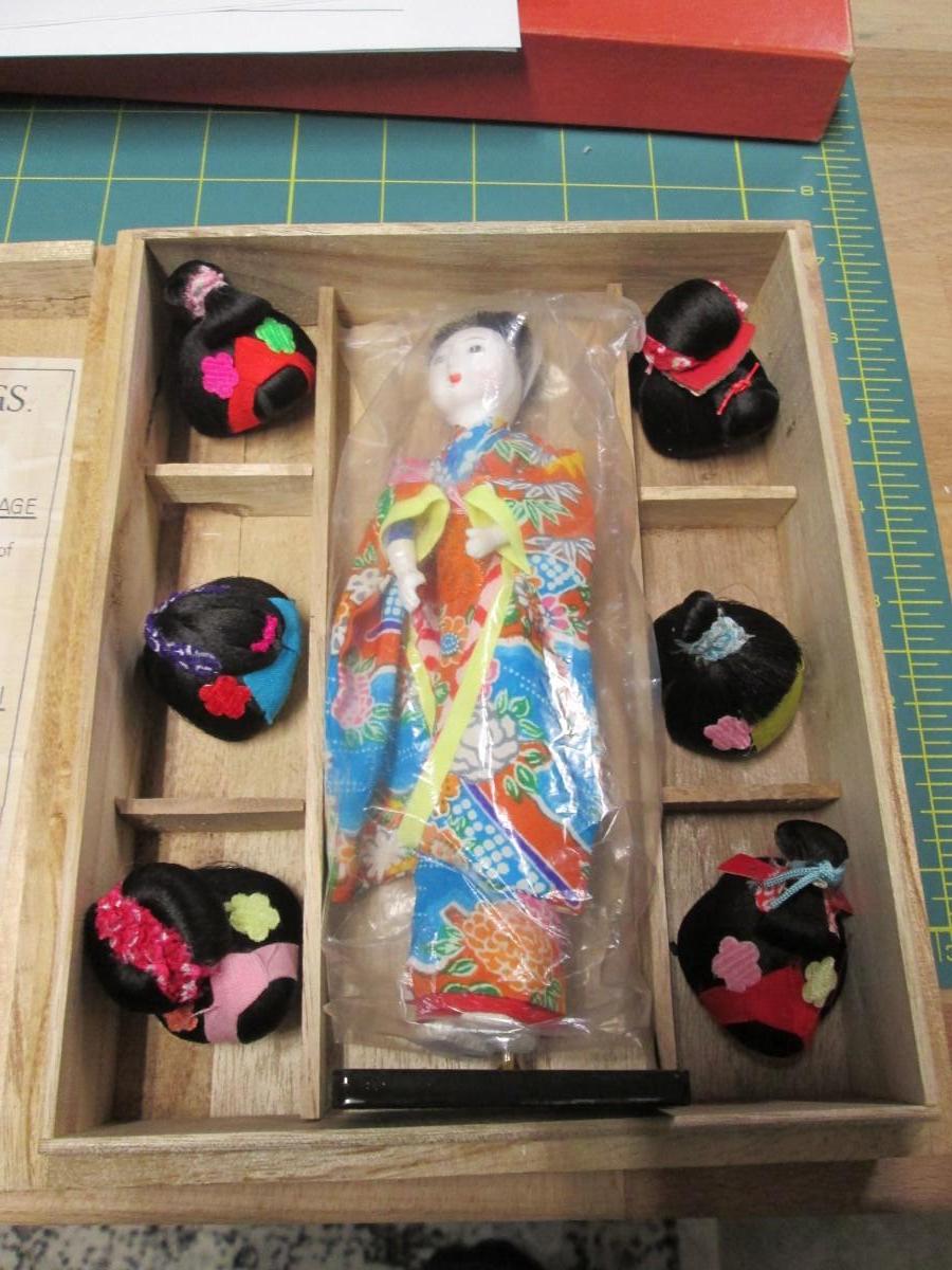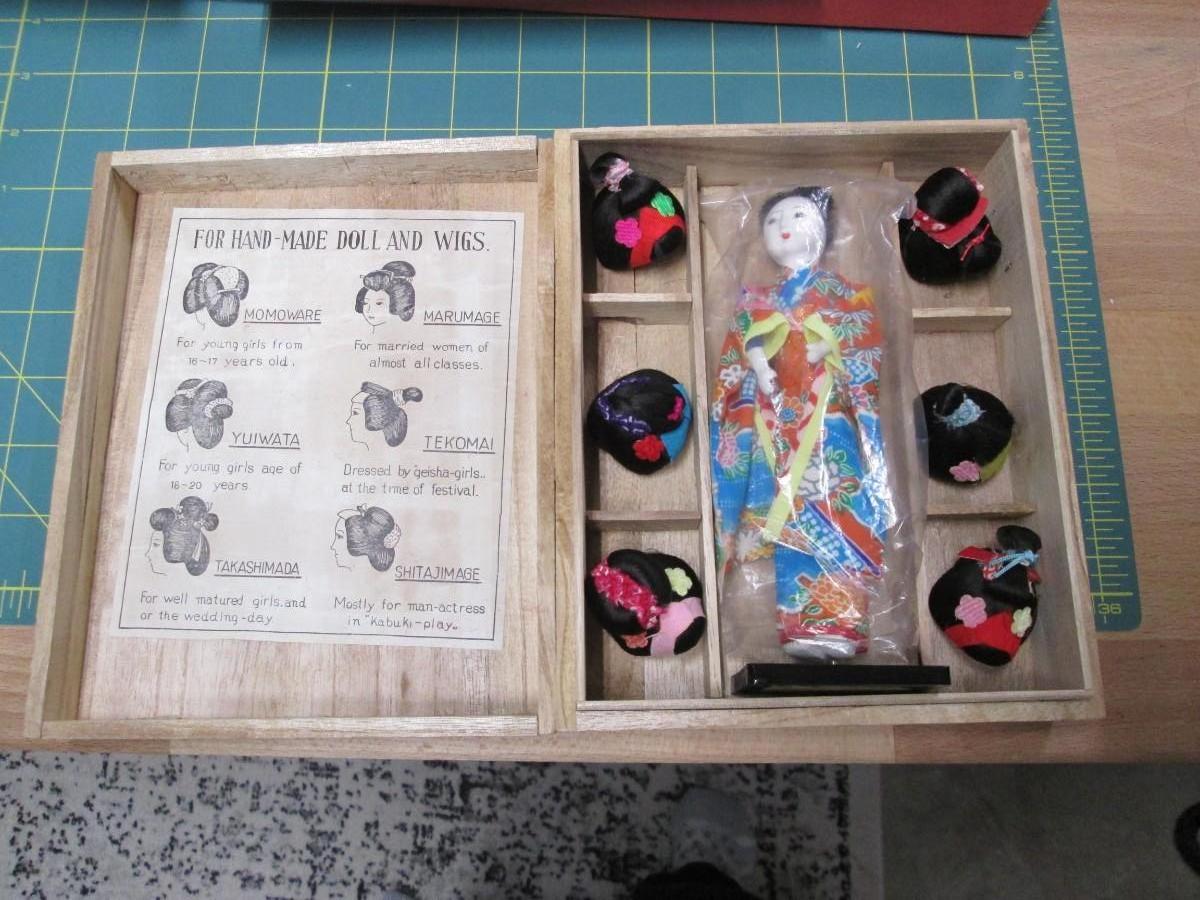 Doll and wigs are in very good condition. There is some writing on the outside of the wood box.