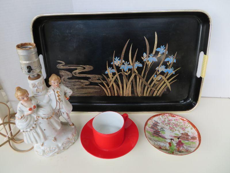 Vintage JAPAN Taitu Uno Porcelain Cup lipstick Red Saucer, Gold Gilt Asian Plate Serving Tray & Lamp LOT
