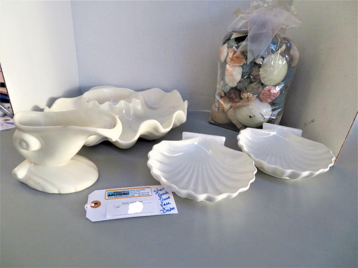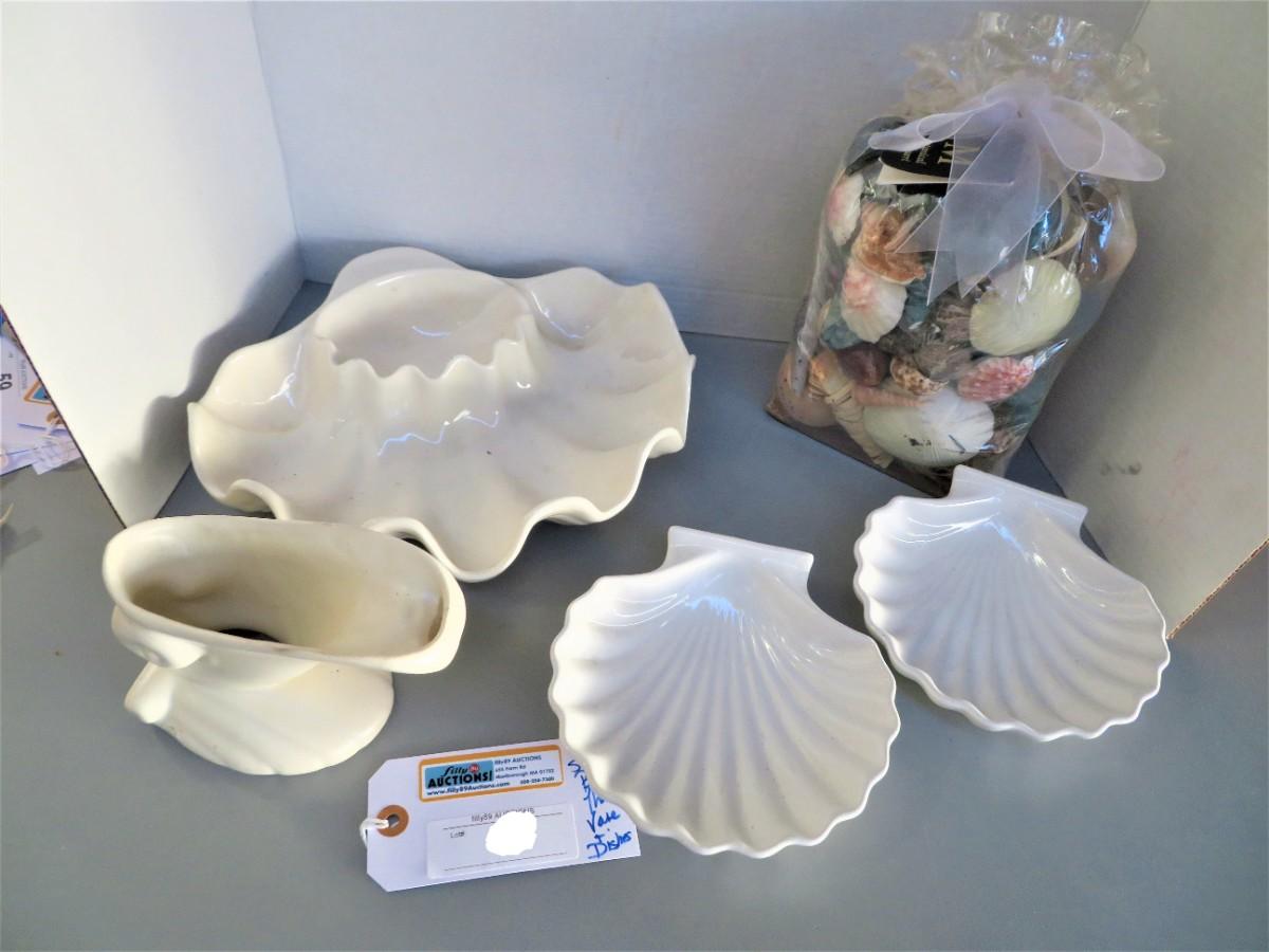 Shell Beach Theme Dishes. with 2 White Japan Oven ware dishes, Small Ceramic Floral Vase, Bag of Shells for Crafts, Appetizer Veggie Shrimp Chip Bowl - (Note: small chip on edge - see photo).