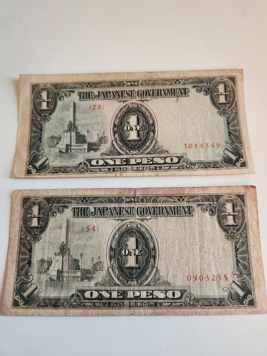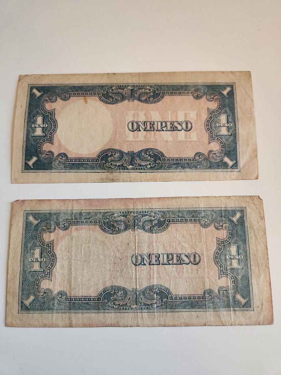 This lot is for a grouping of Japanese Invasion Money - #2. These notes were issued by the Japanese government during their occupation of the Philippines between 1942 and 1945. The Filipino's called it Mickey Mouse Money for its very low value. Worthless at the end of WW2. This lot includes two one pesos notes. This item is KY sales tax-exempt.