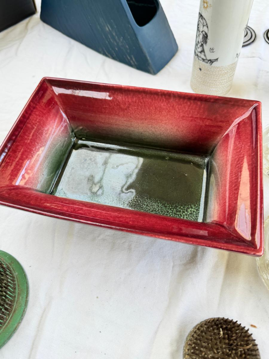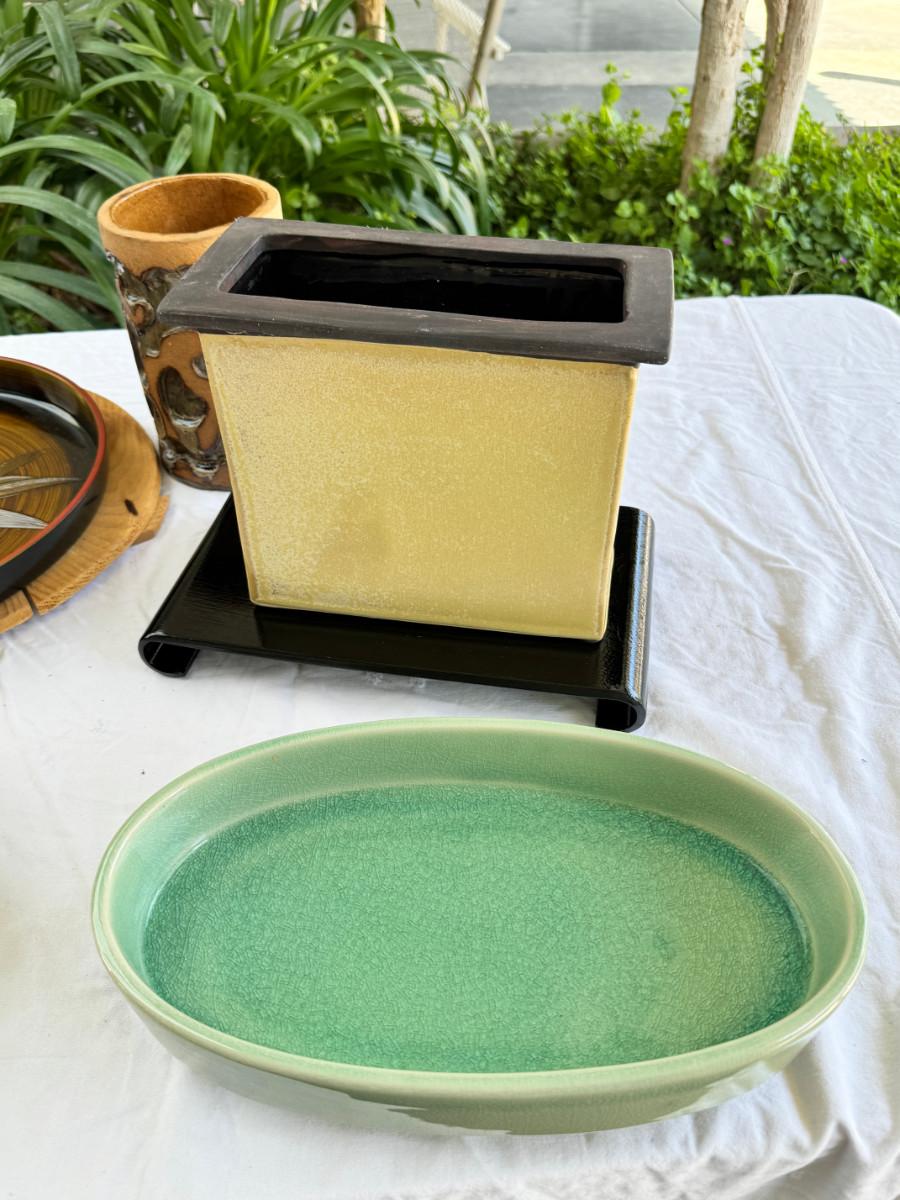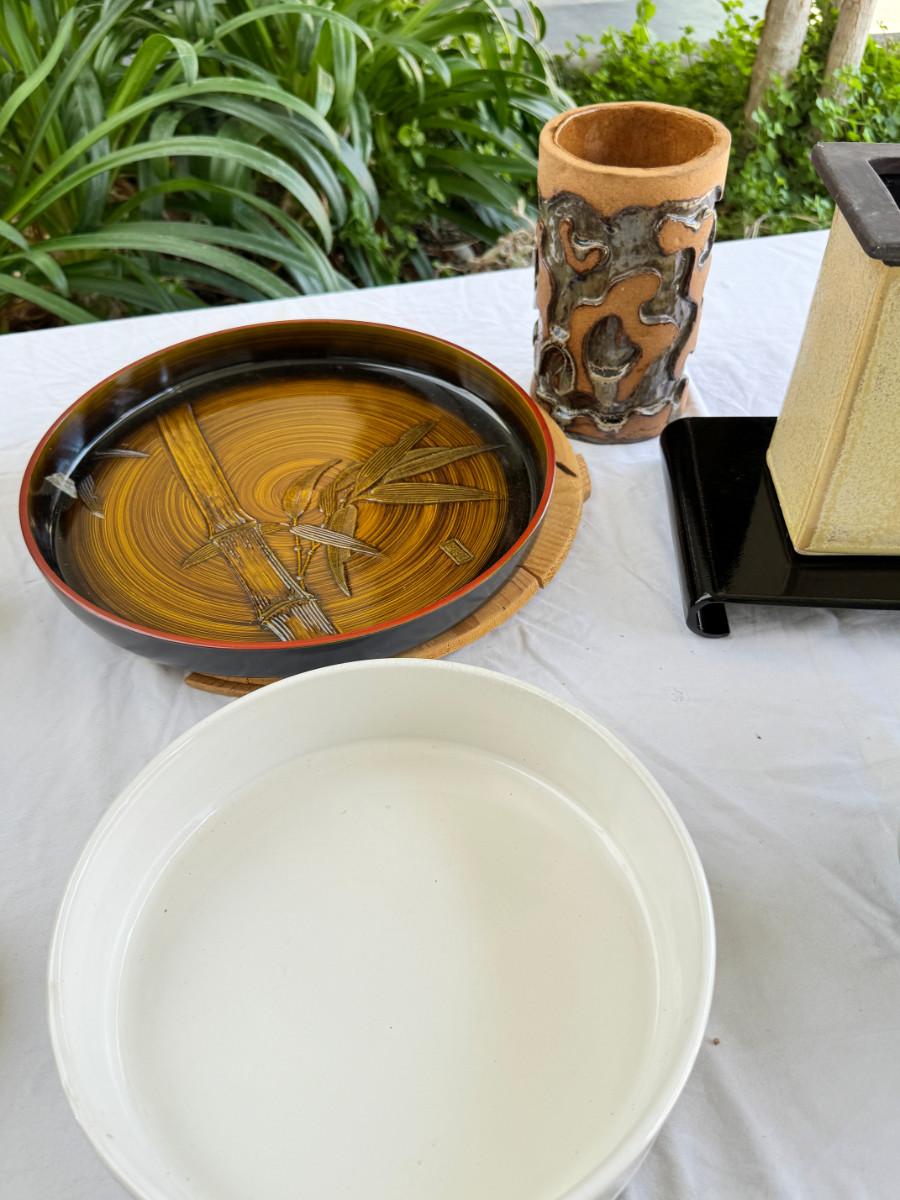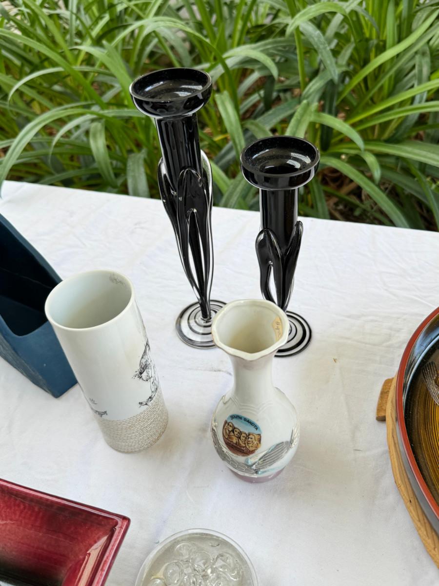 Needle plates ( with wear) Glass black Polish , Ceramic vases, Haeger Ombre , ceramic flower arranging vessels.Bamboo Japanese plate on wood tray . Sorry no shipping