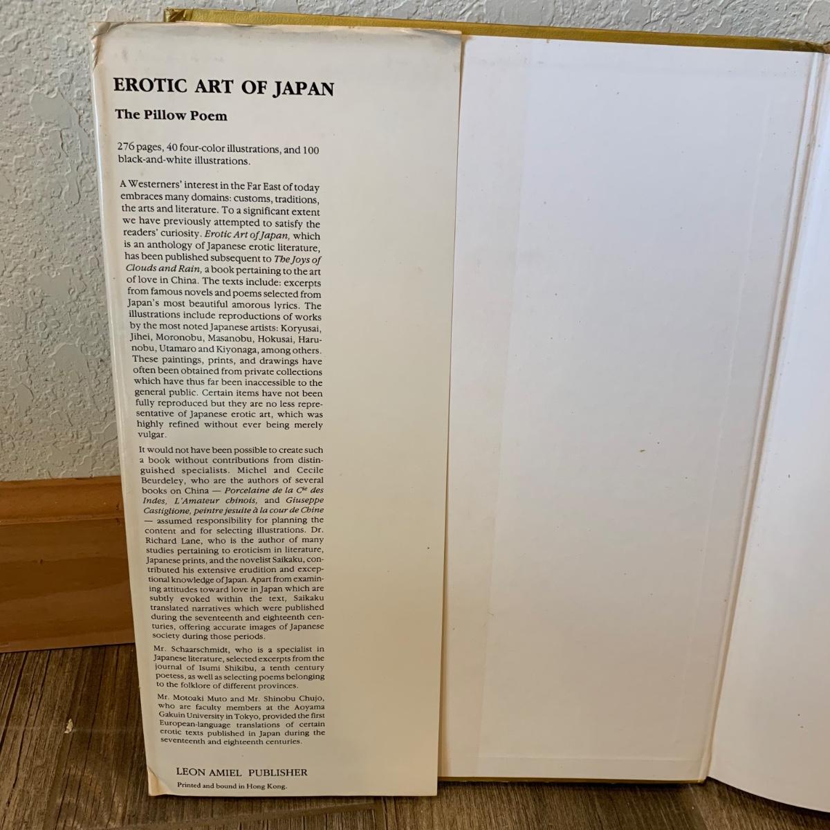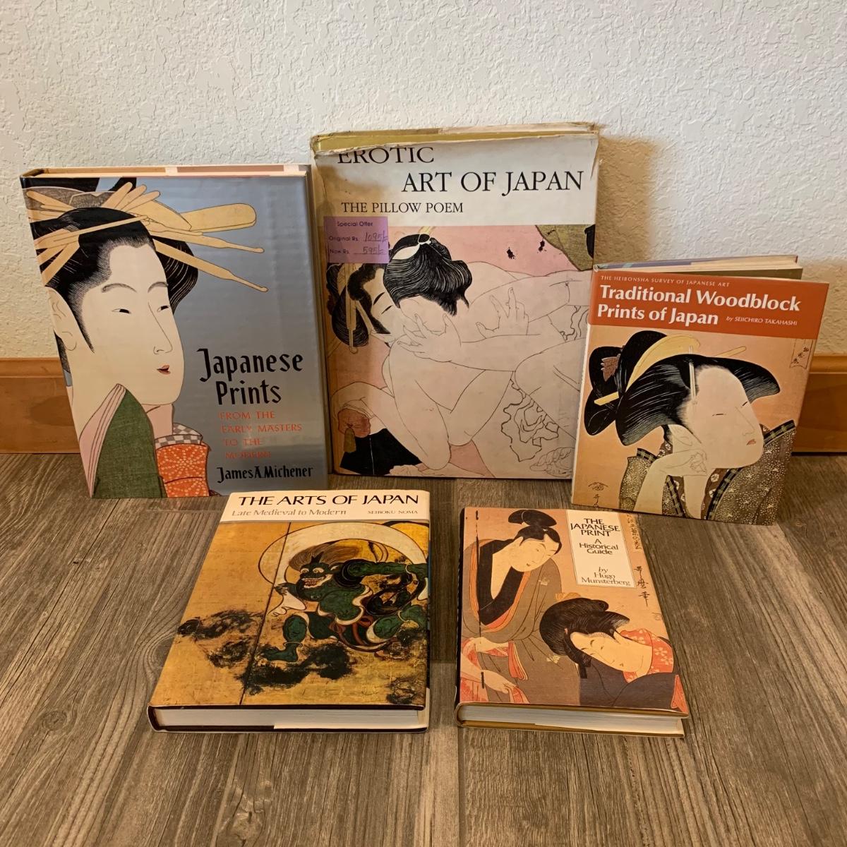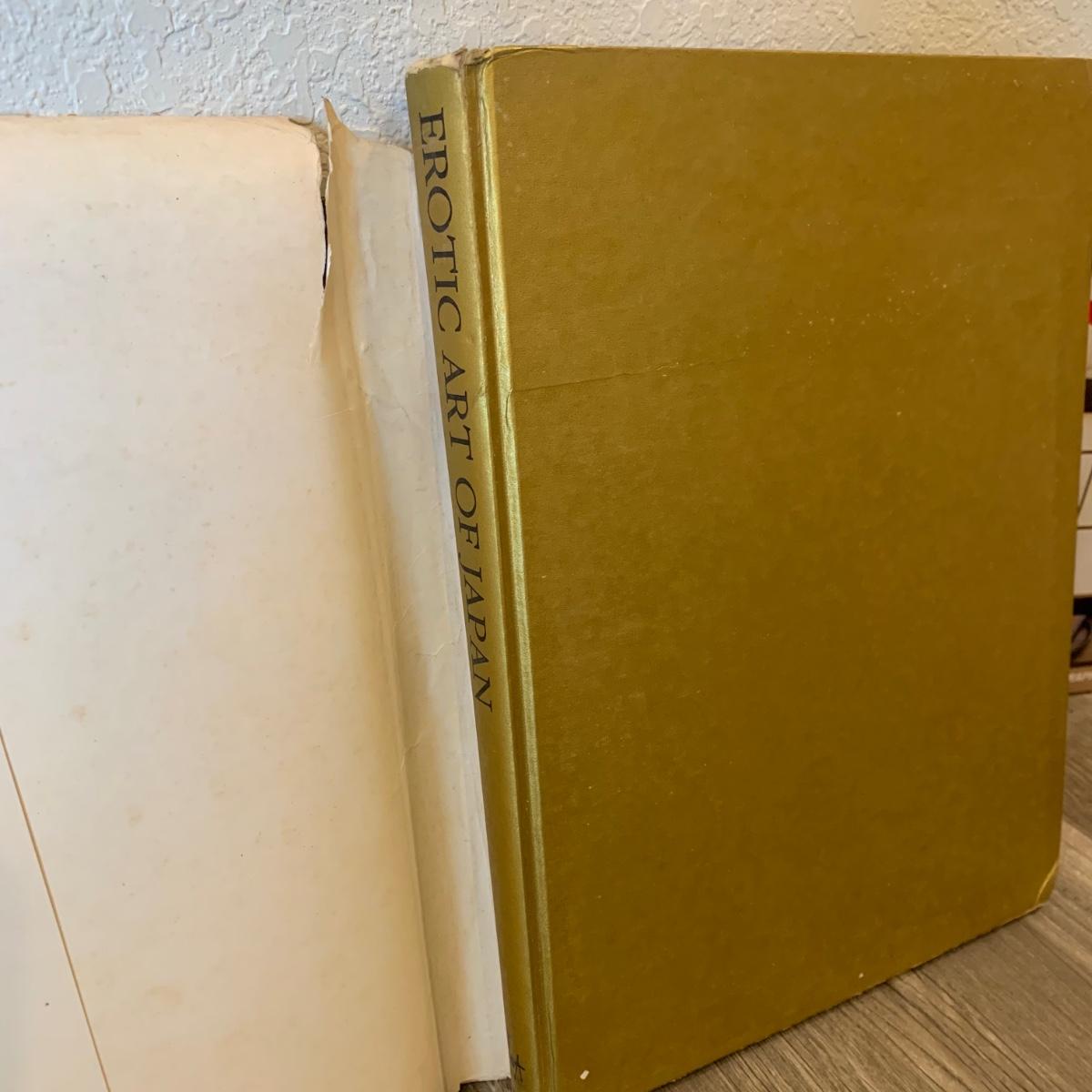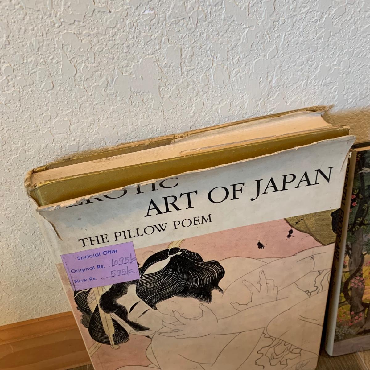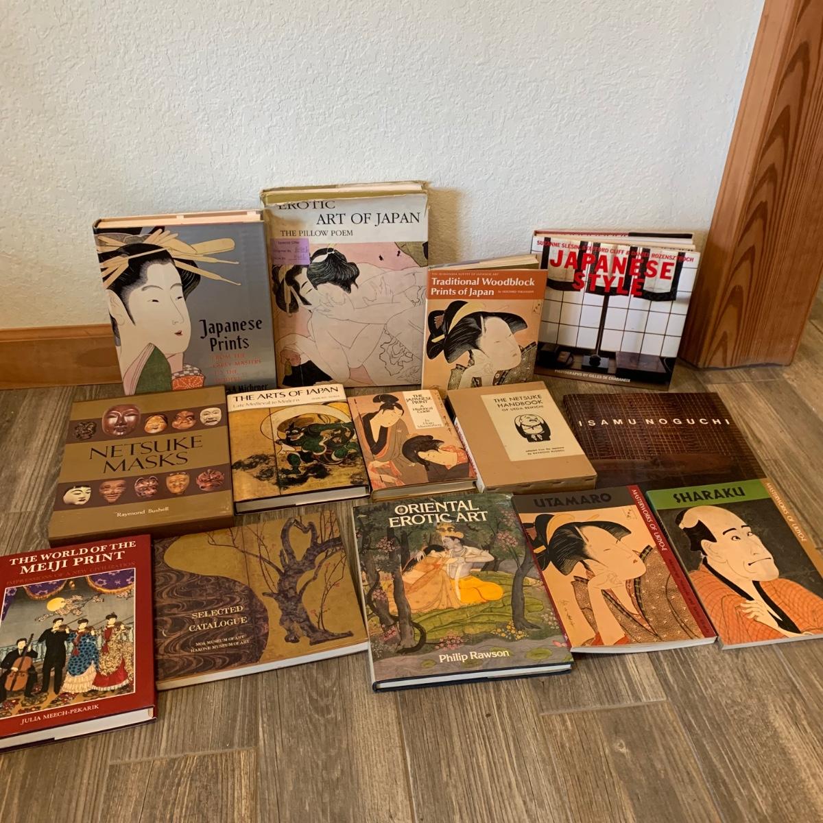 14 books about Japanese art and more. Three come in protective cardboard covers. Of the 14 books, four are paperback and the rest are hardcover. Most of the books are in very good condition, with the exception of “Erotic Art of Japan”, which has a torn dust jacket and some wear to the cover.