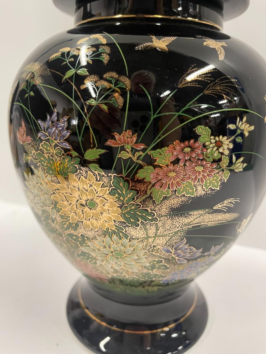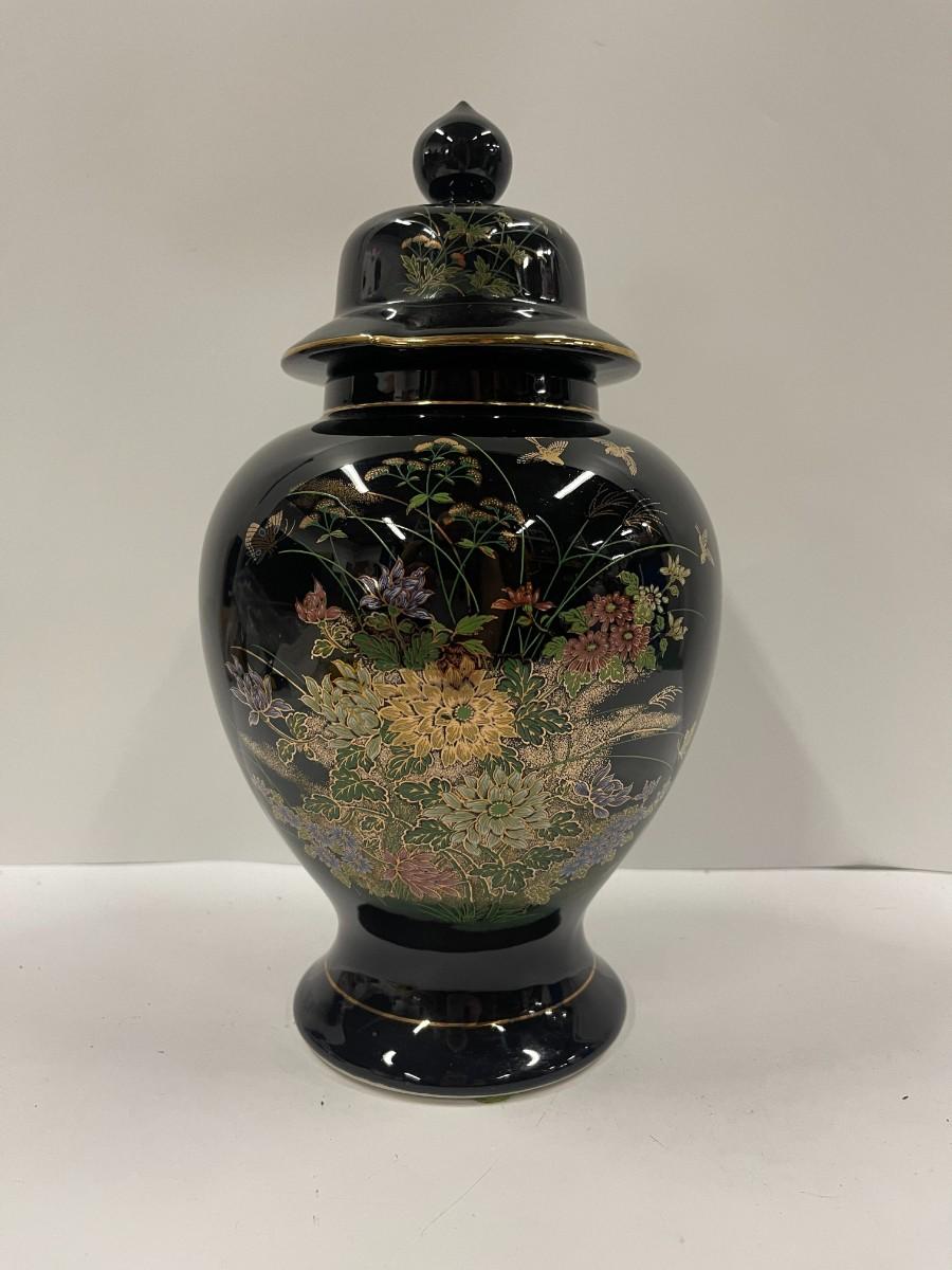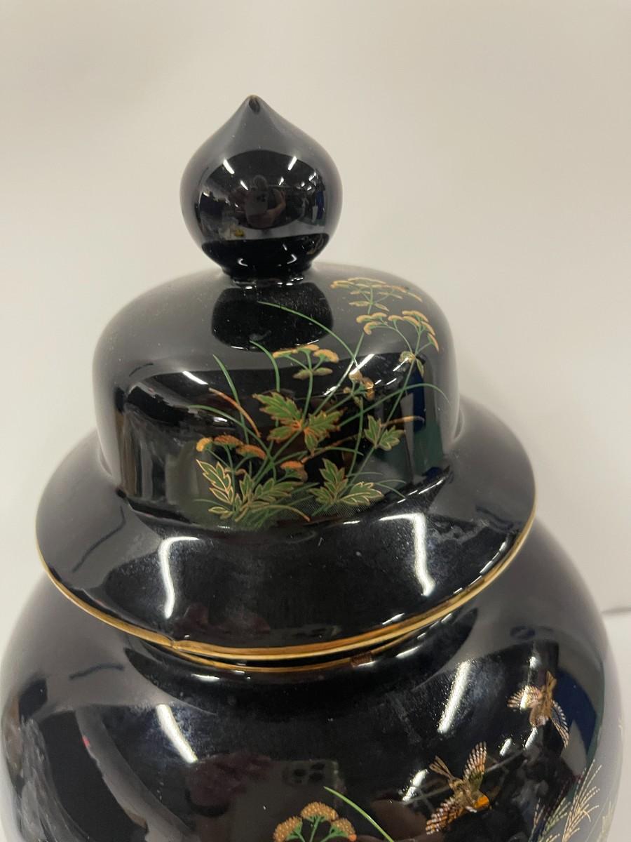 Black ginger jar with flowers. Excellent condition. Approx `12" to top of finial.