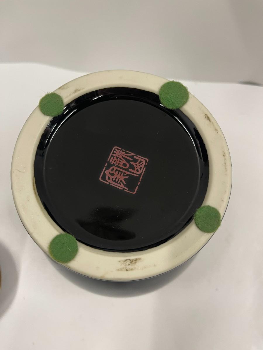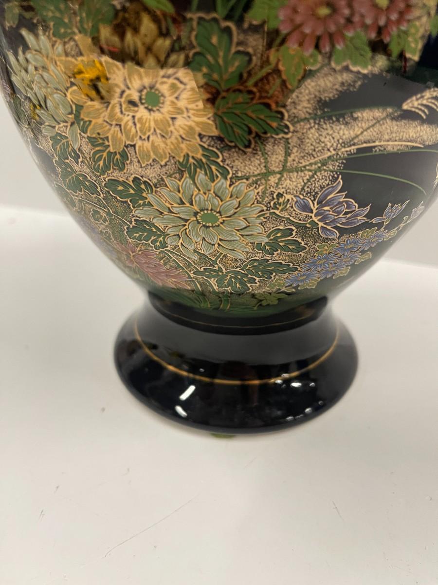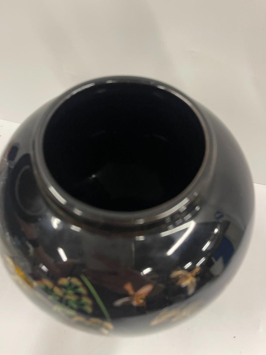 Black ginger jar with flowers. Excellent condition. Approx `12" to top of finial.