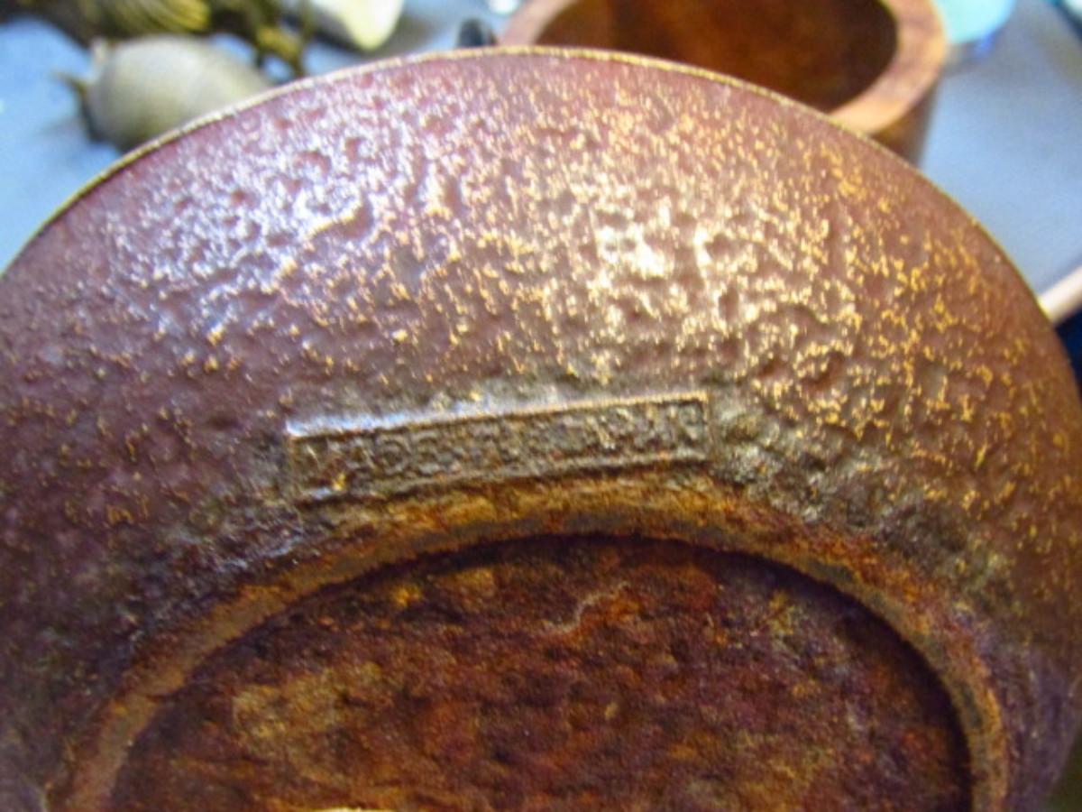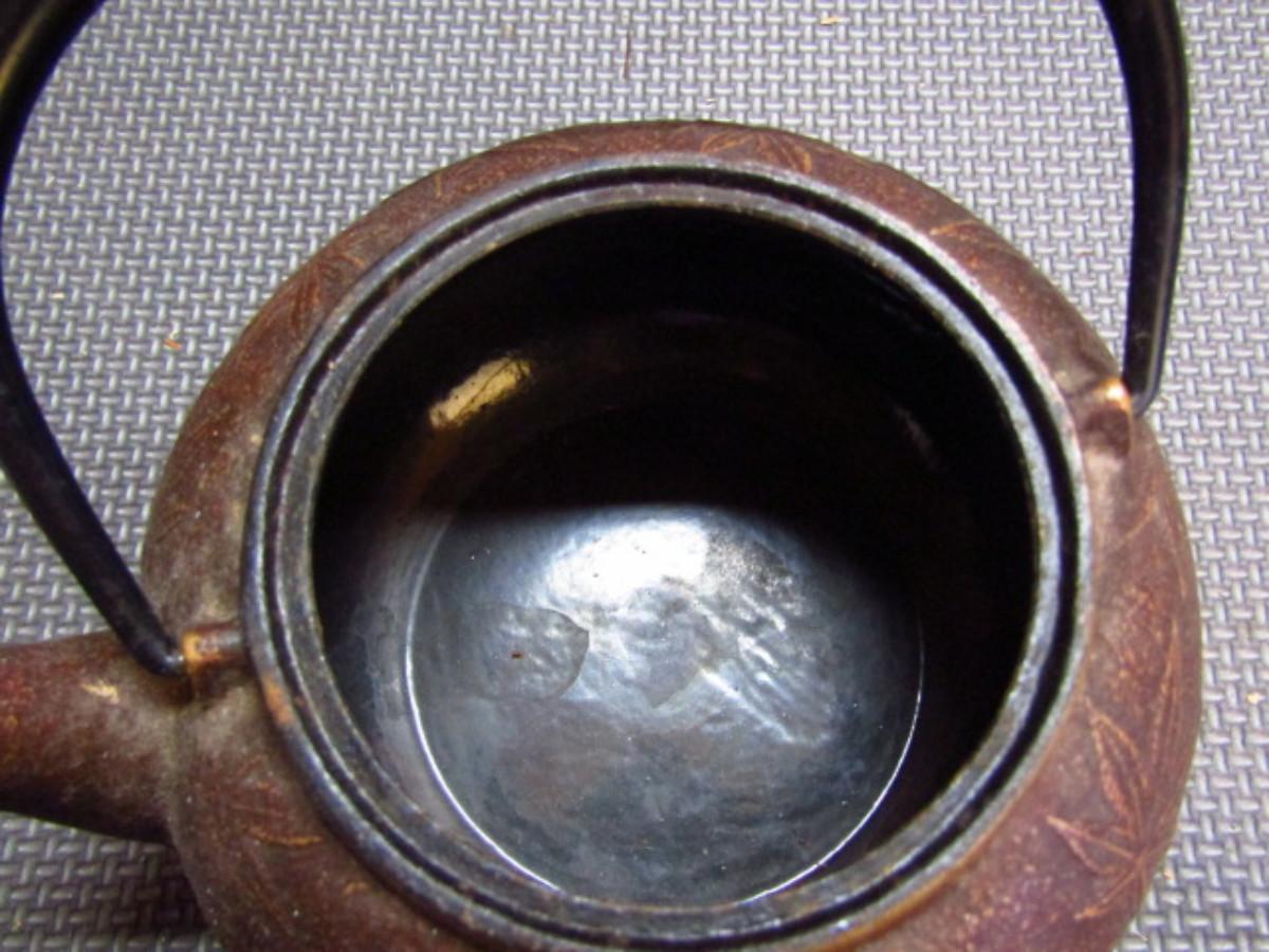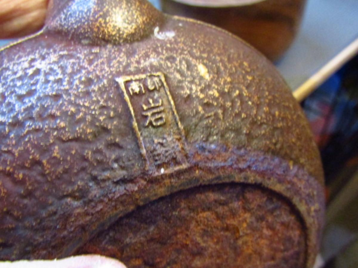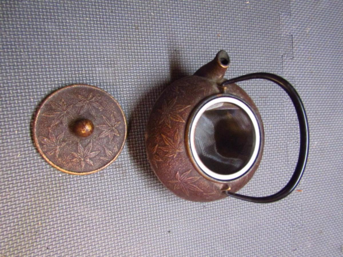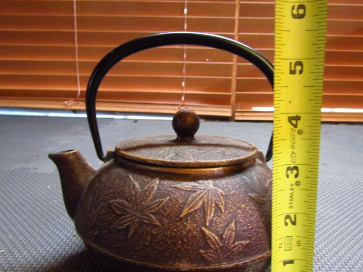 Japanese Cast Iron Teapot- Leaf Design (G). Measures approx 6" across, 4" tall.