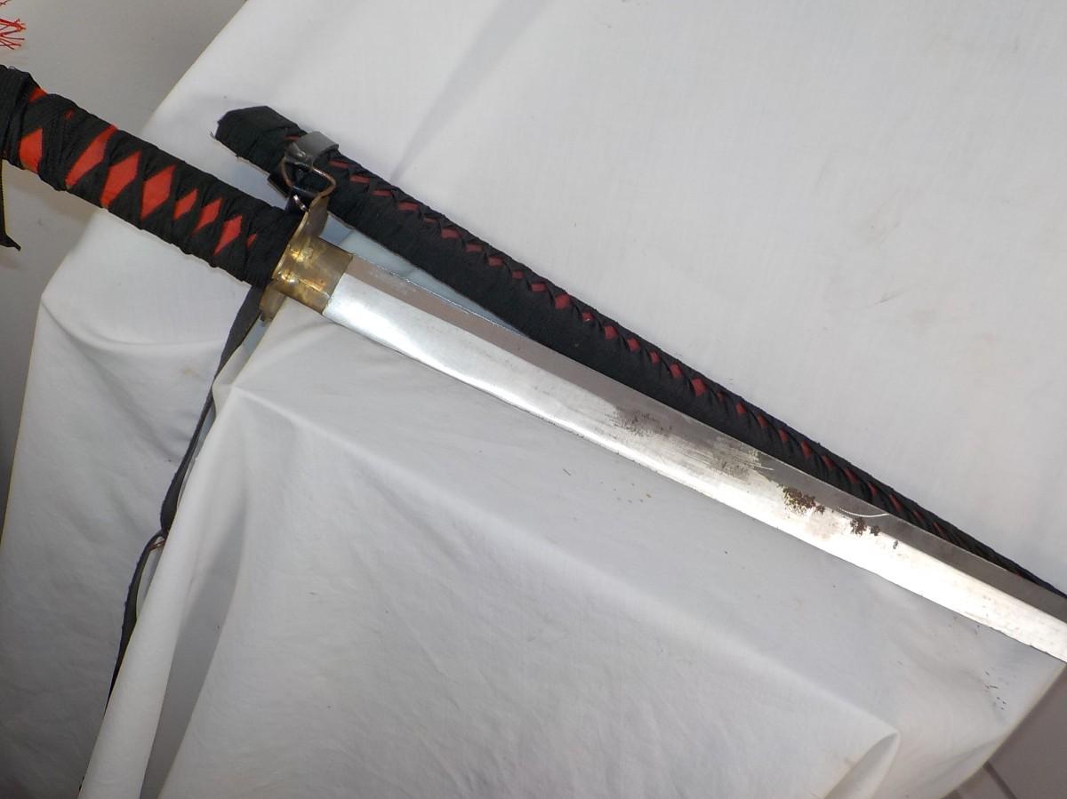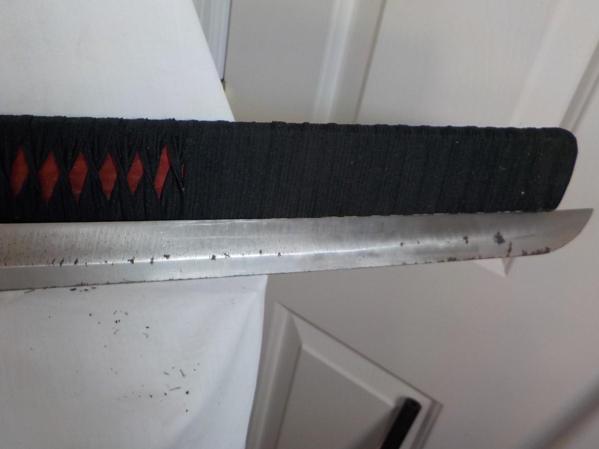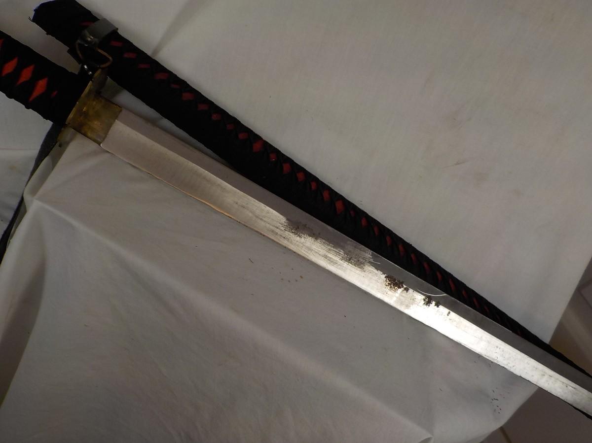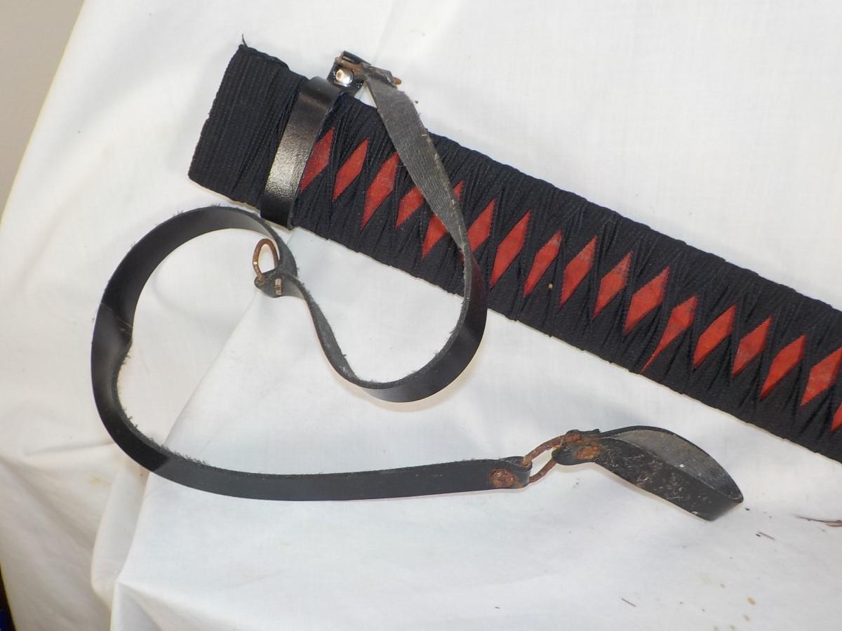 Scabbard is bamboo wrapped in black linen. It is soild. Does have brass tight in tongue to hold blade, some patina on blade approx 2 in . wide.