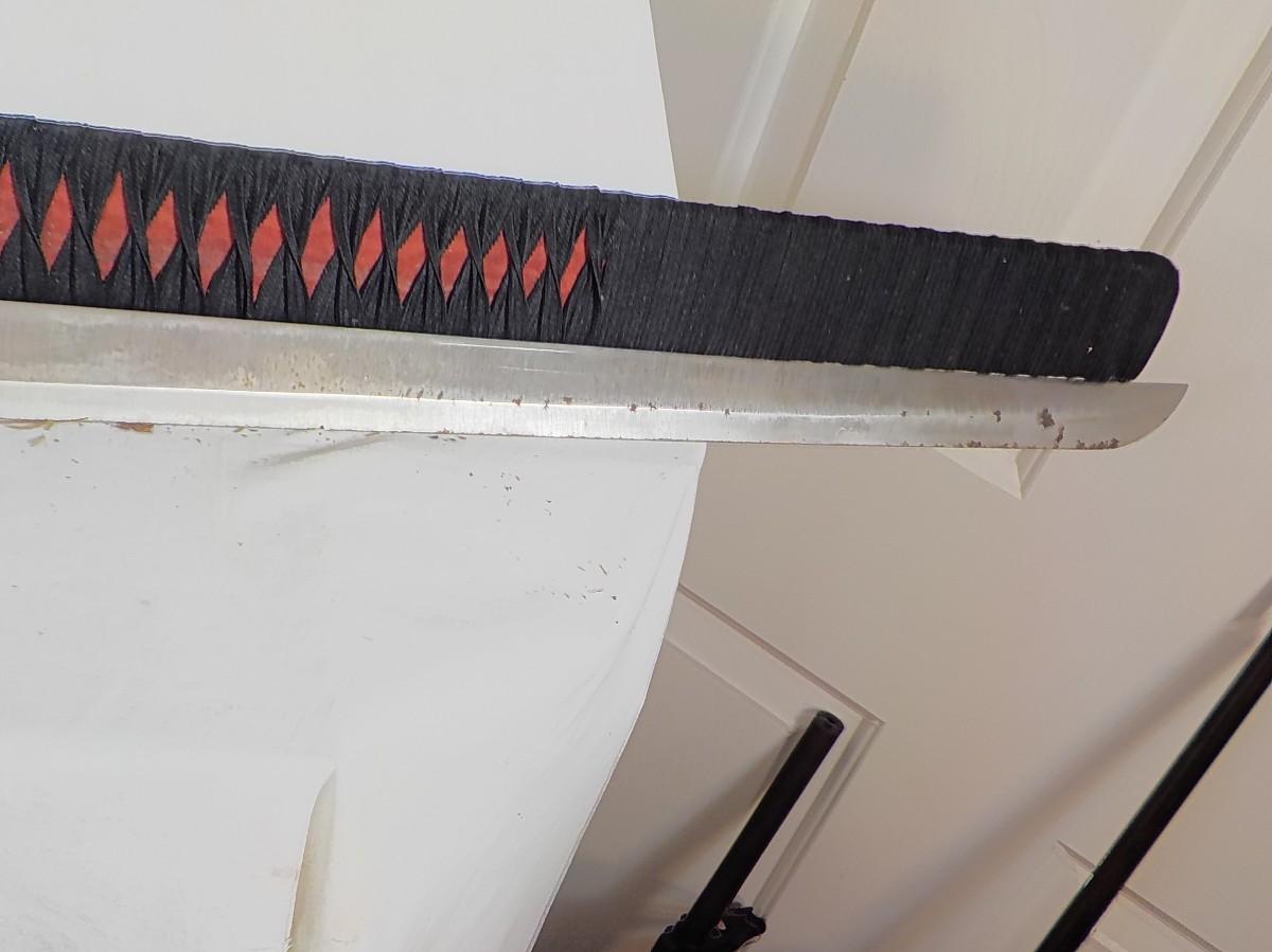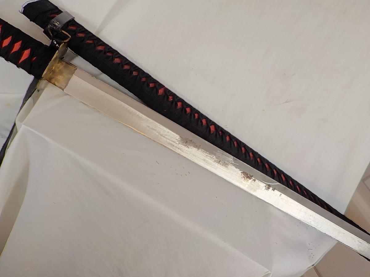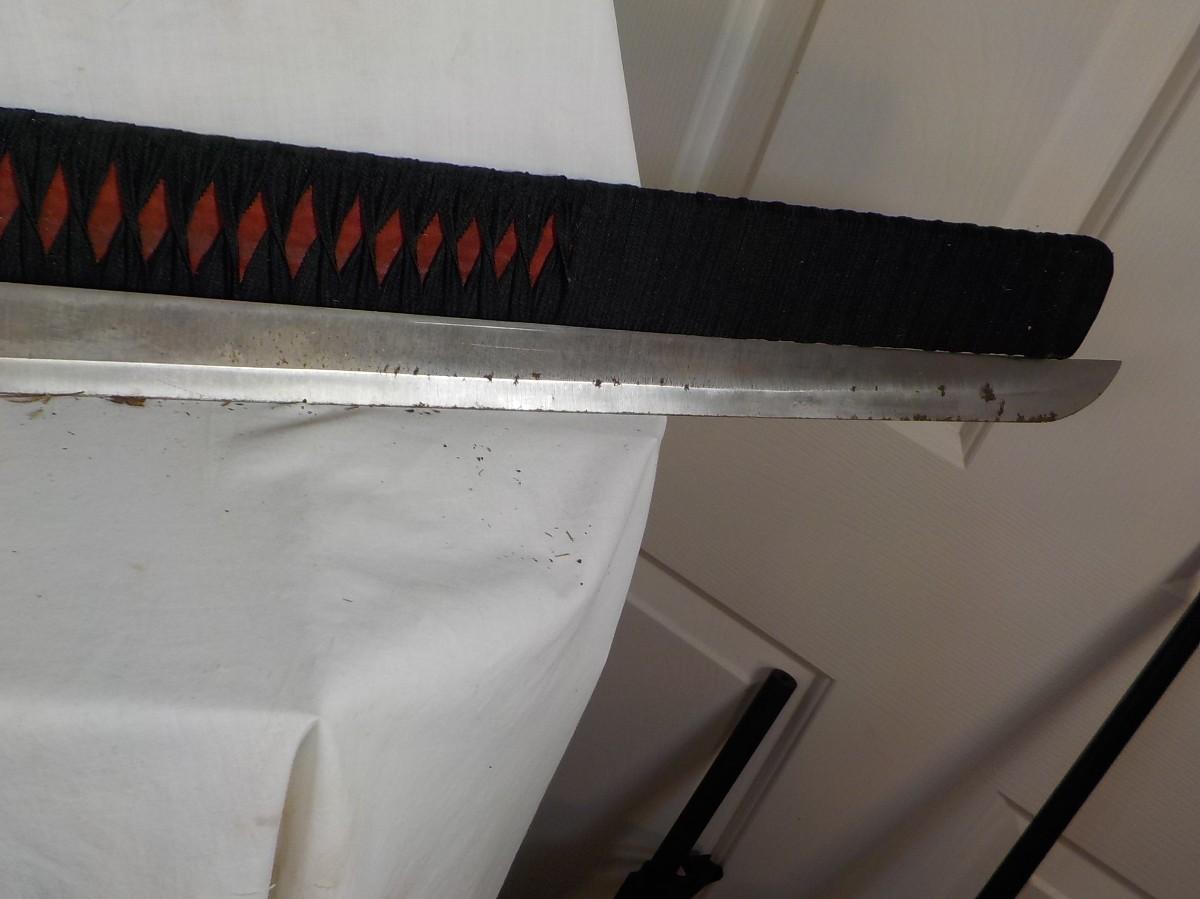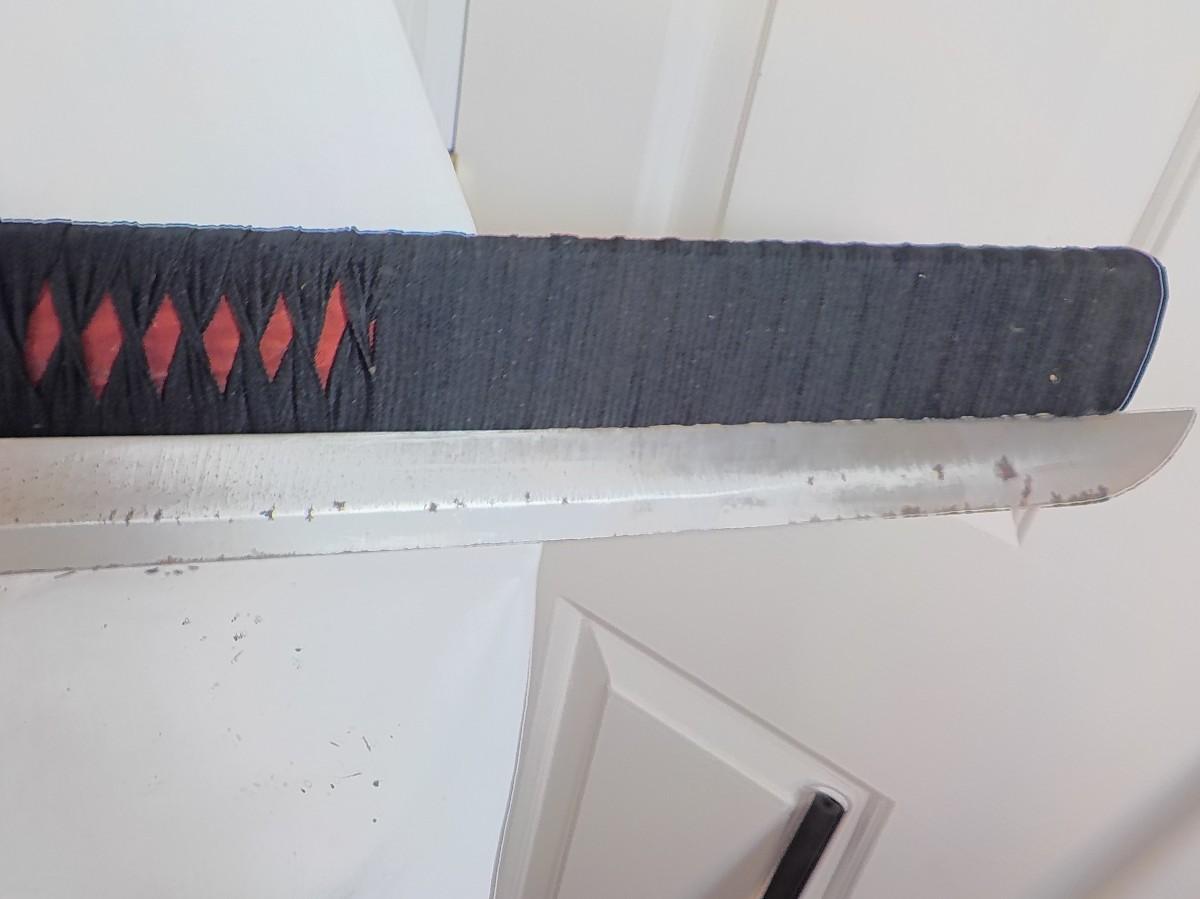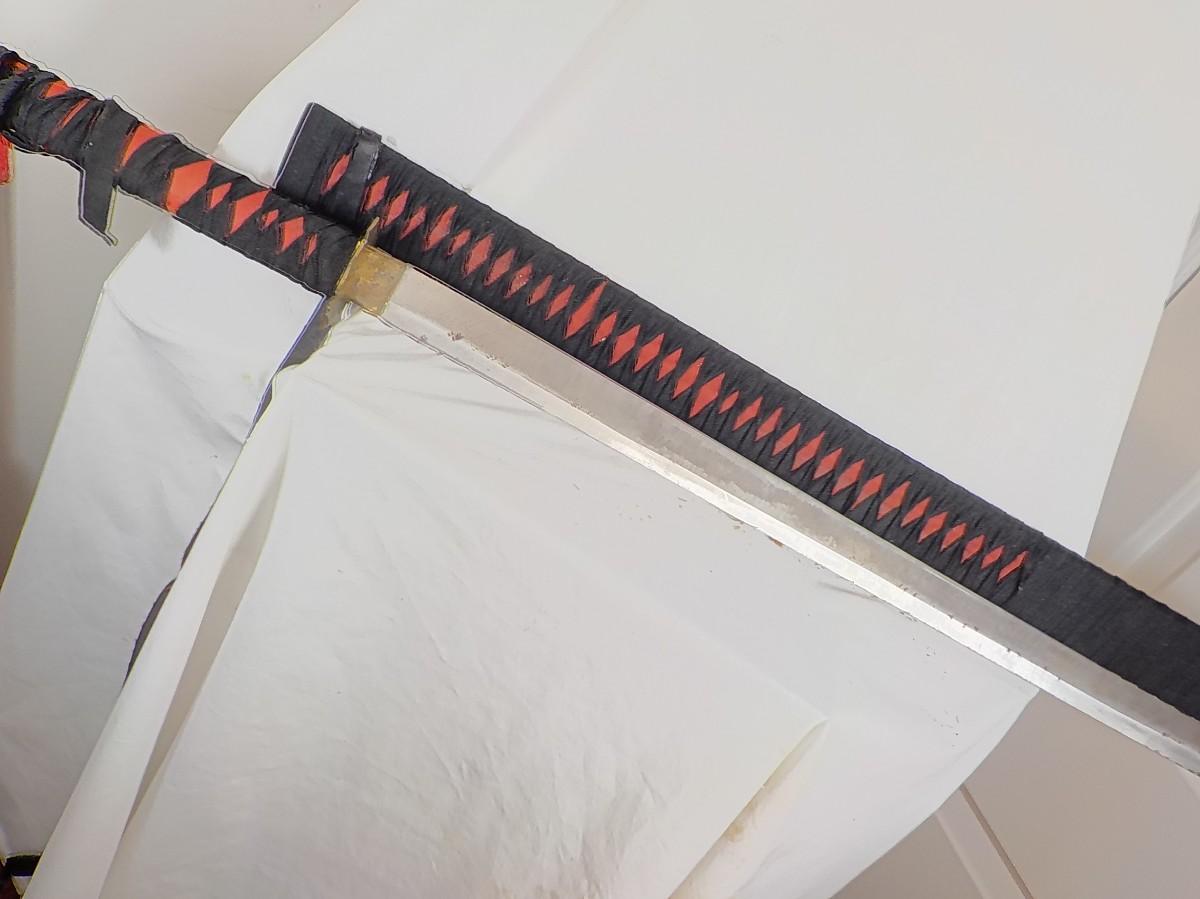 Scabbard is bamboo wrapped in black linen. It is soild. Does have brass tight in tongue to hold blade, some patina on blade approx 2 in . wide.