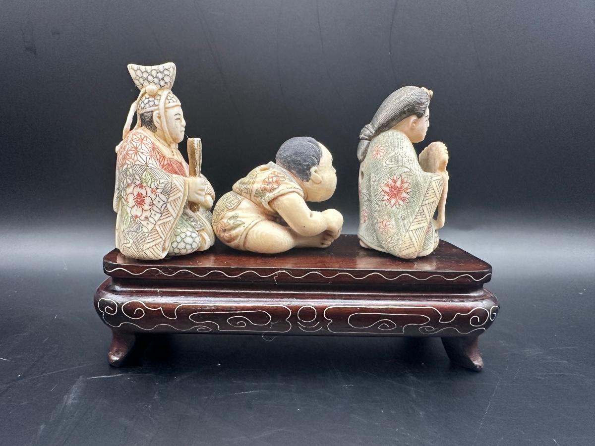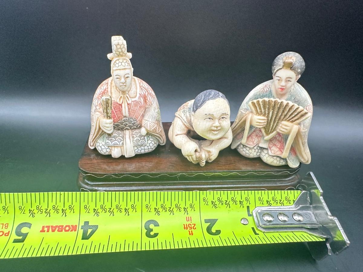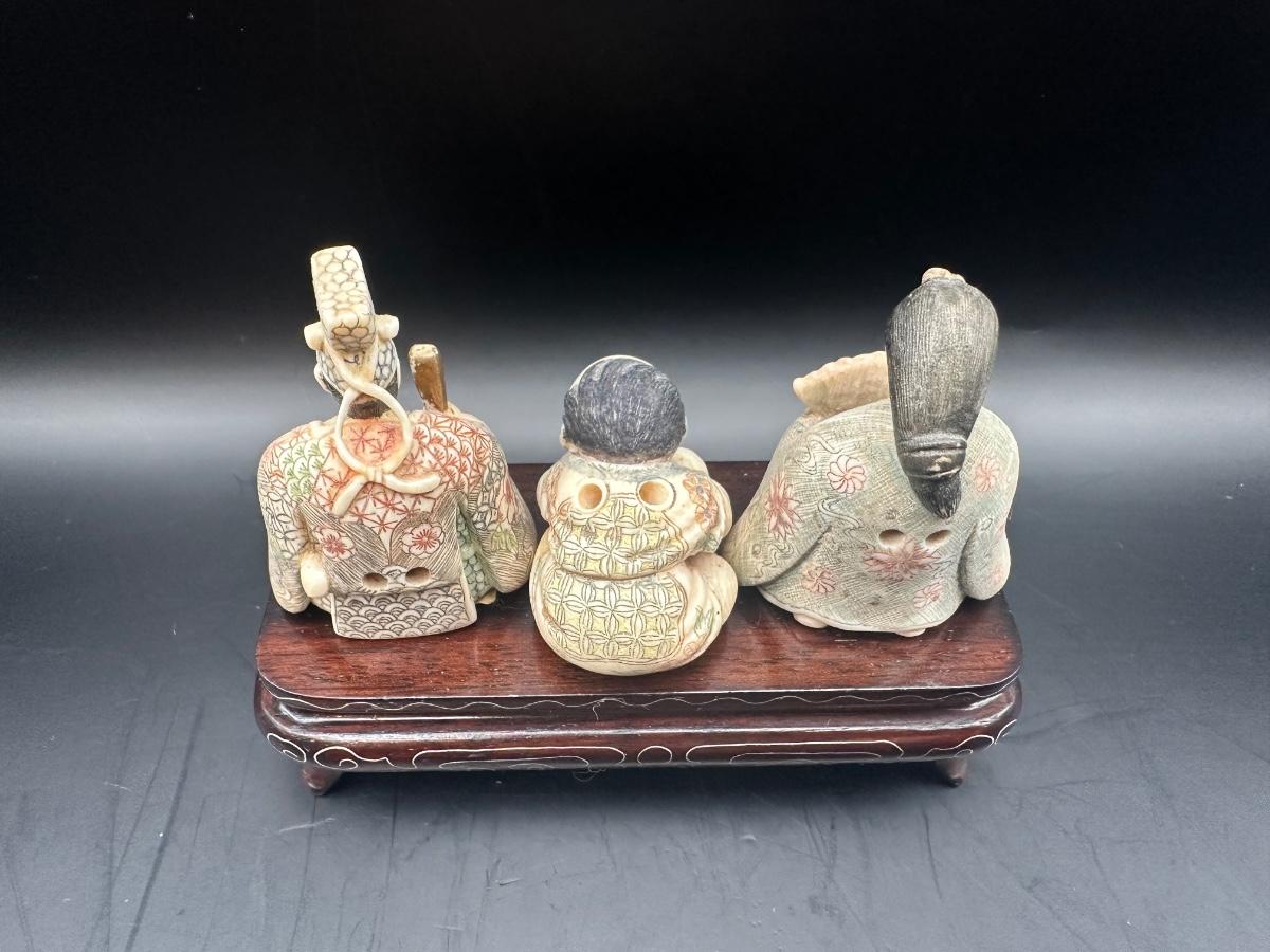 Decorative Japanese figural carving set featuring three seated figures displayed on a carved wooden stand. Maker’s style seal present on underside.