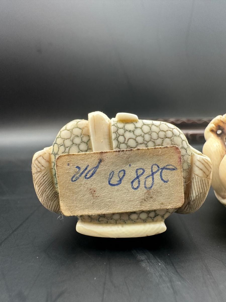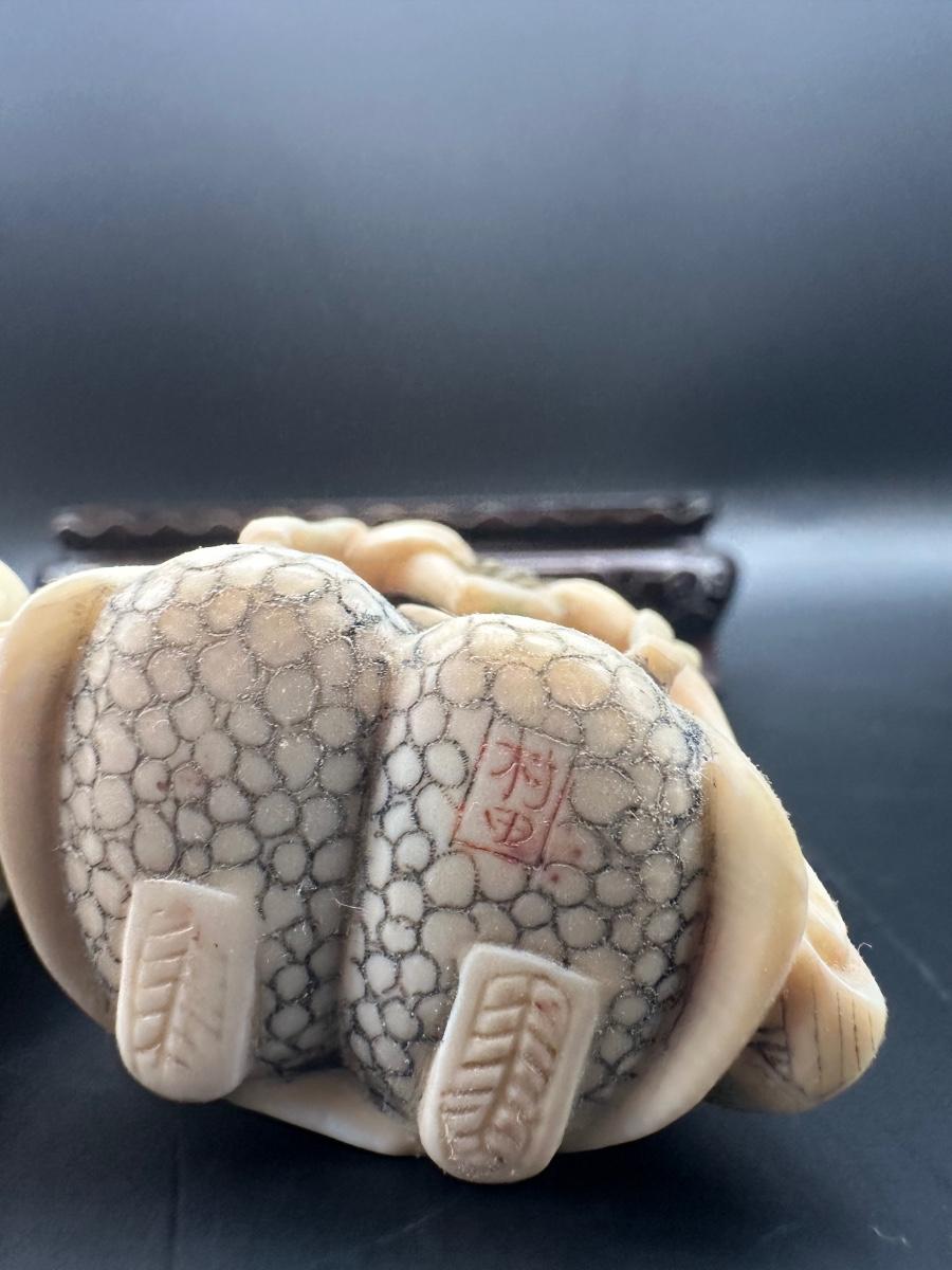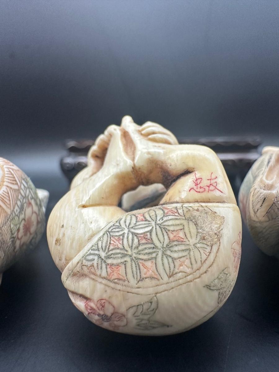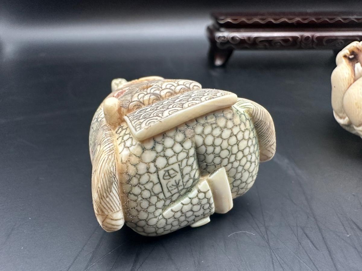 Decorative Japanese figural carving set featuring three seated figures displayed on a carved wooden stand. Maker’s style seal present on underside.
