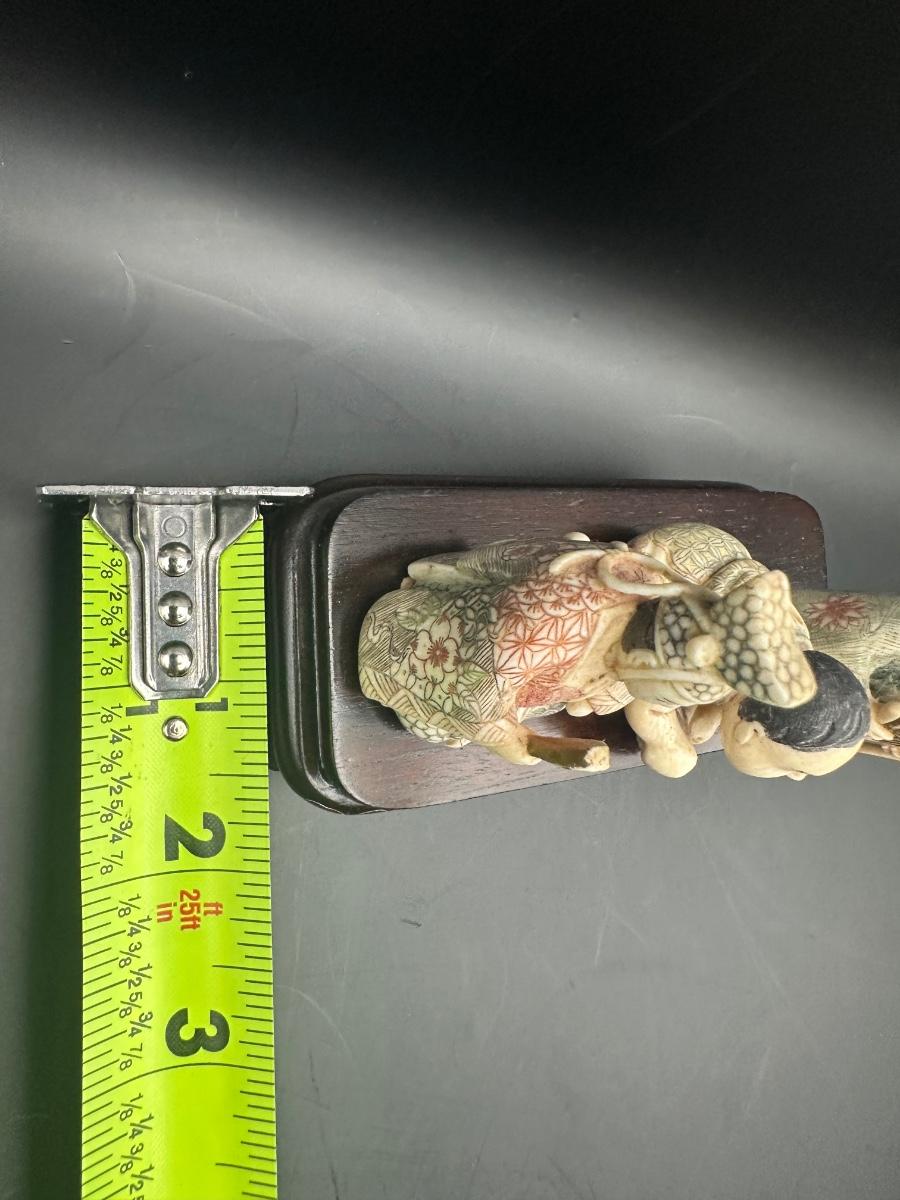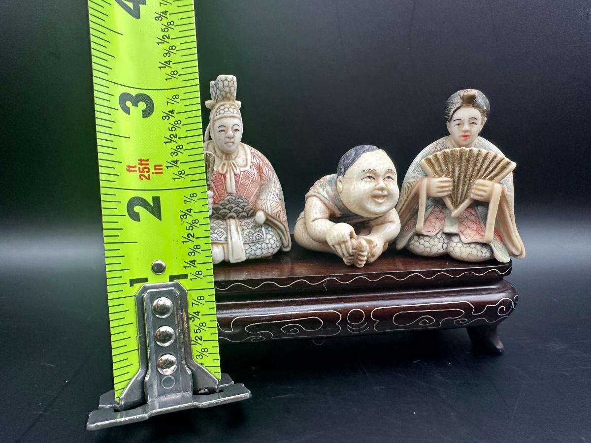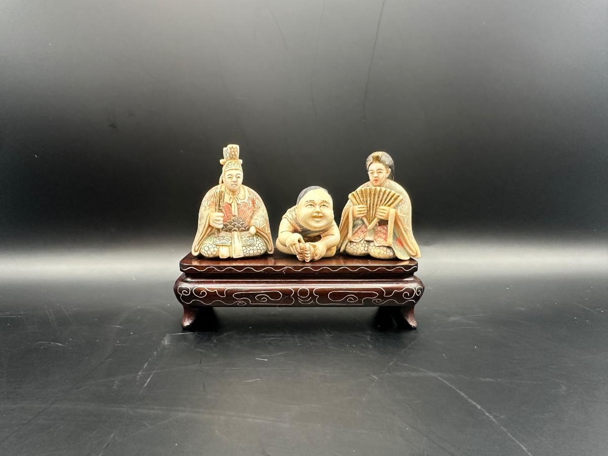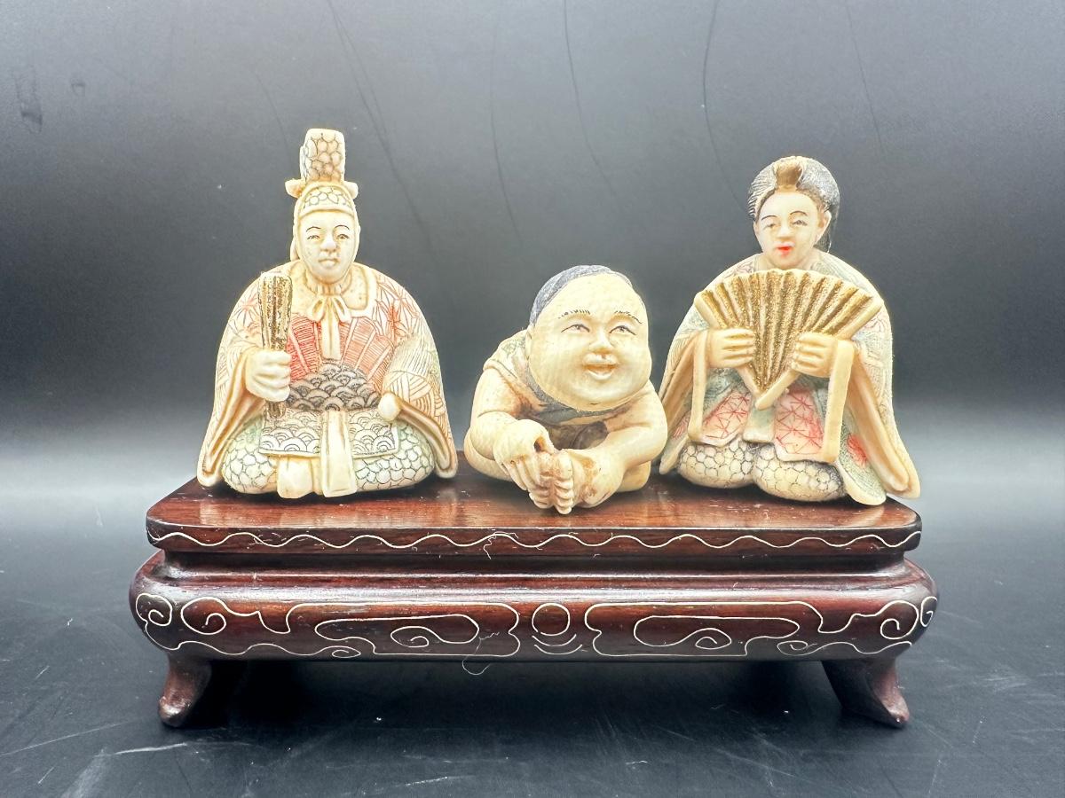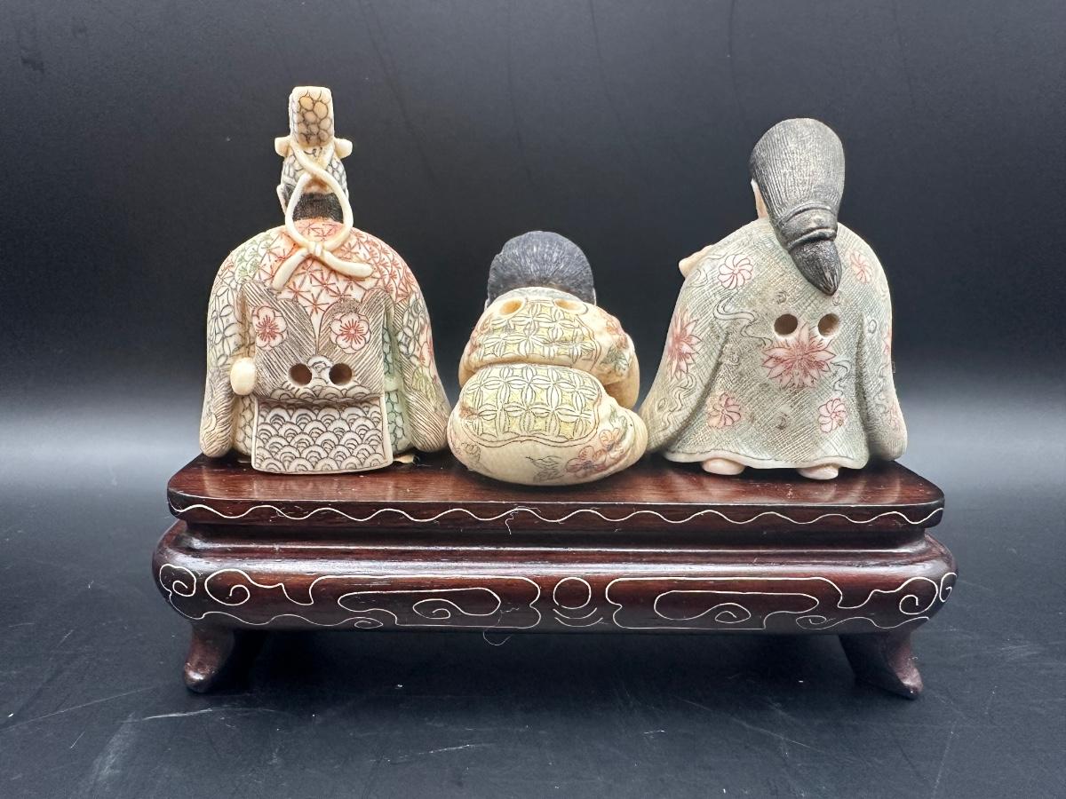 Japanese Figural Carving Trio on Decorative Wood Stand