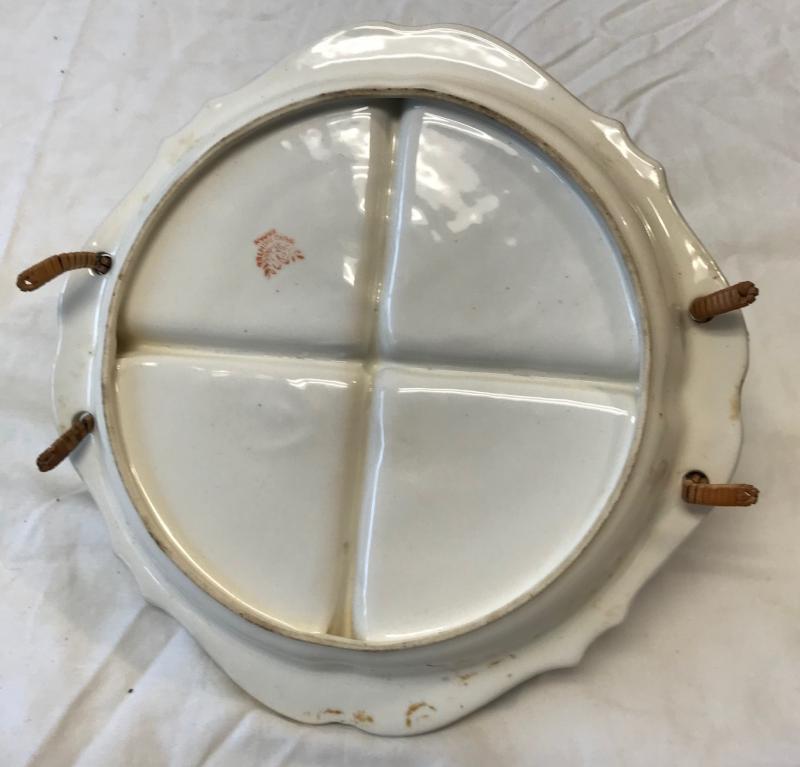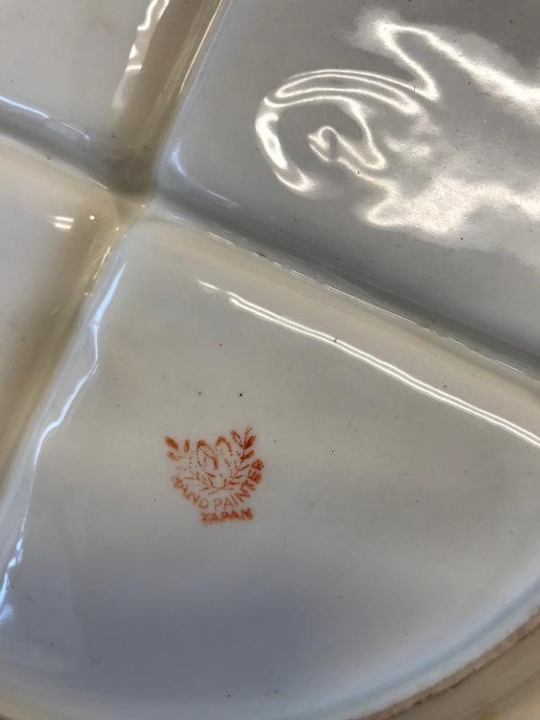 Description: Japanese Floral 4 Part Relish tray with Handle. Measurements approximate: 4.5 H X 9.25 W.x 8.5 Diameter. Material: Porcelain. Shipping Charges : 15. Condition: Very good.