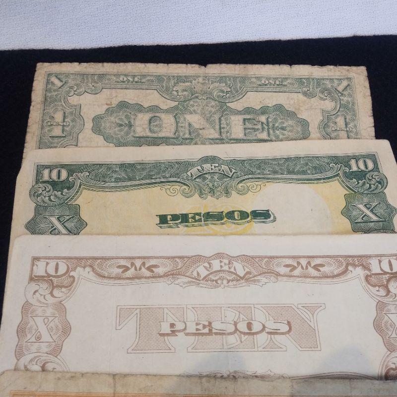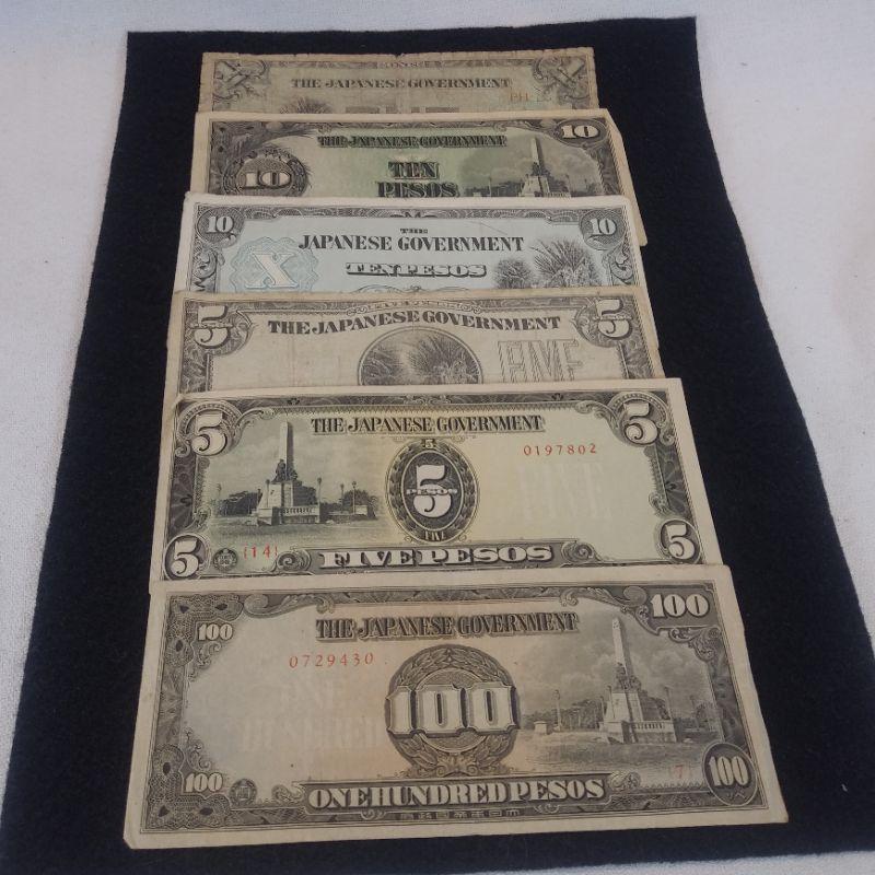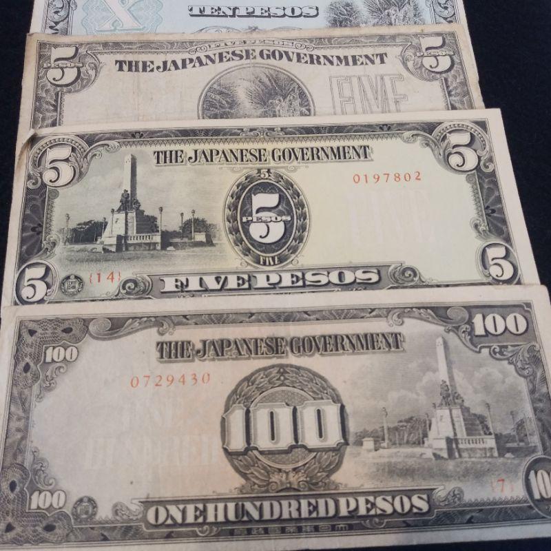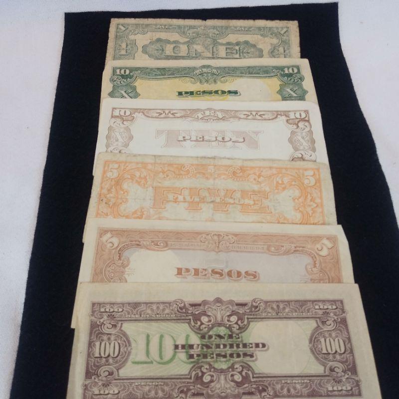 This offering includes: One - 1 pesos, two - 5 pesos, two - 10 pesos and one - 100 pecos bill, The one peso and one of the 5 pesos bills are very worn. But the remainder are in quite nice condition.