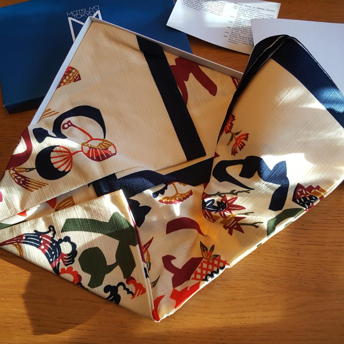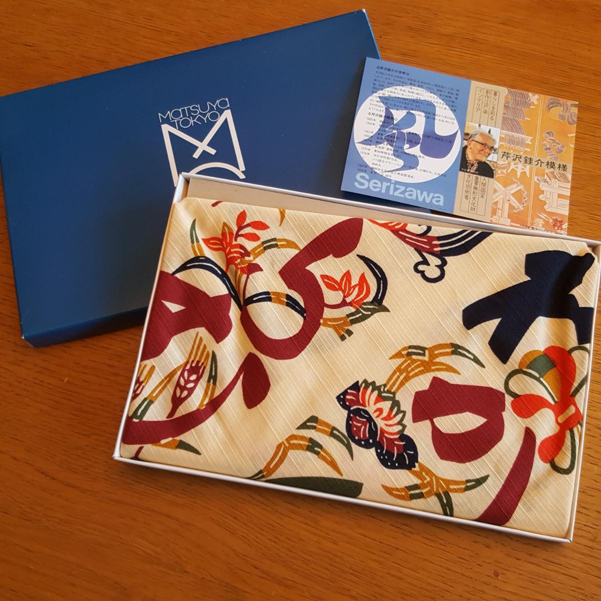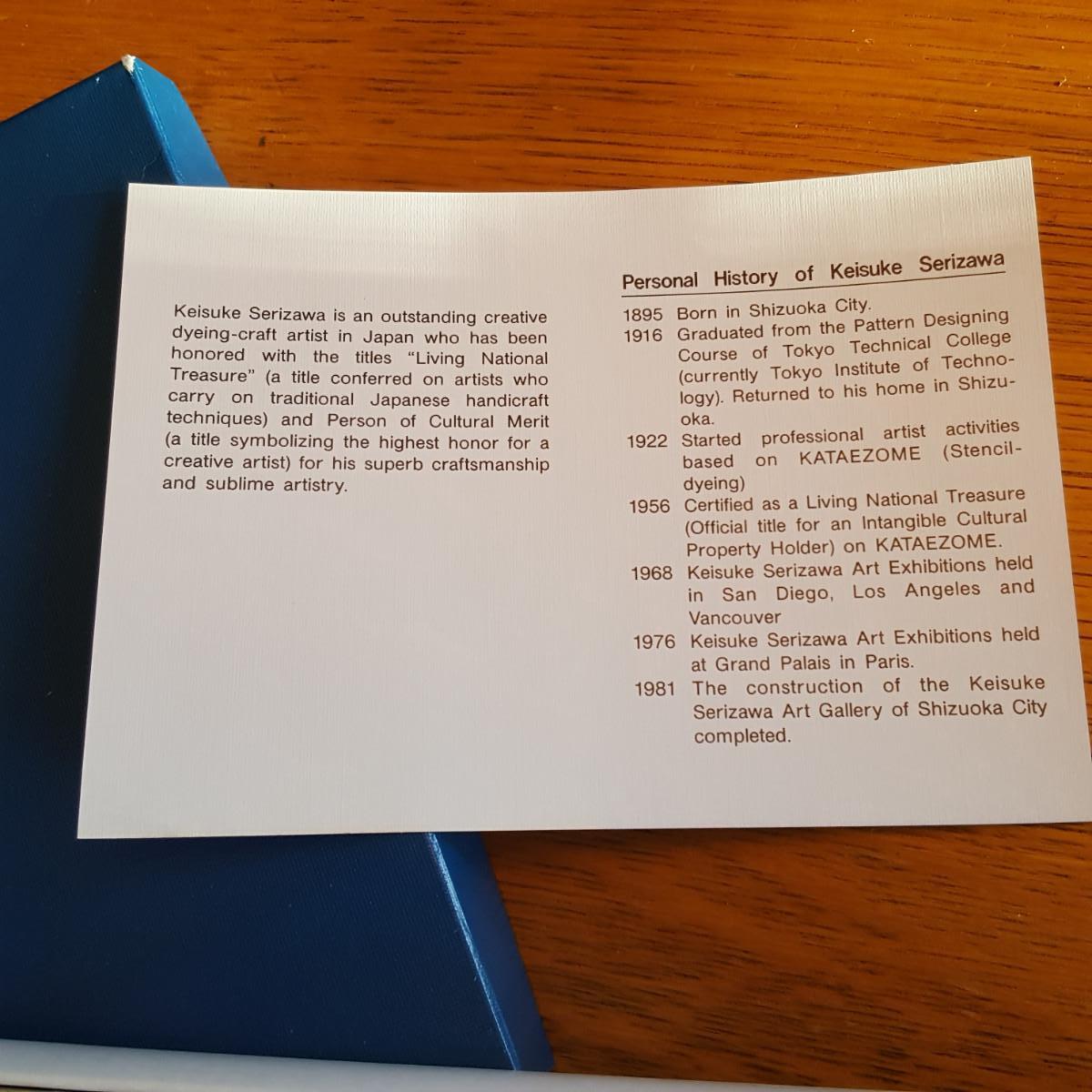 This auction lot is for a new, in box, never unfolded Japanese Kataezome Table Scarf by Serizawa. This amazing textile - which measures about 34-inches square, was designed and executed by Keisuke Serizawa (1895-1984). Keisuke Serizawa was a Japanese textile designer. In 1956, he was designated as a Living National Treasure by the Japanese government for his katazome stencil dyeing technique. A leading member of the mingei movement founded by Yanagi Sōetsu, Serizawa visited Okinawa several times and learned the Ryūkyū bingata techniques of dyeing. This scarf was presented to the consignor by a member of a visiting Tokyo Business Guild when doing exchange work in Louisville in the 1980's.