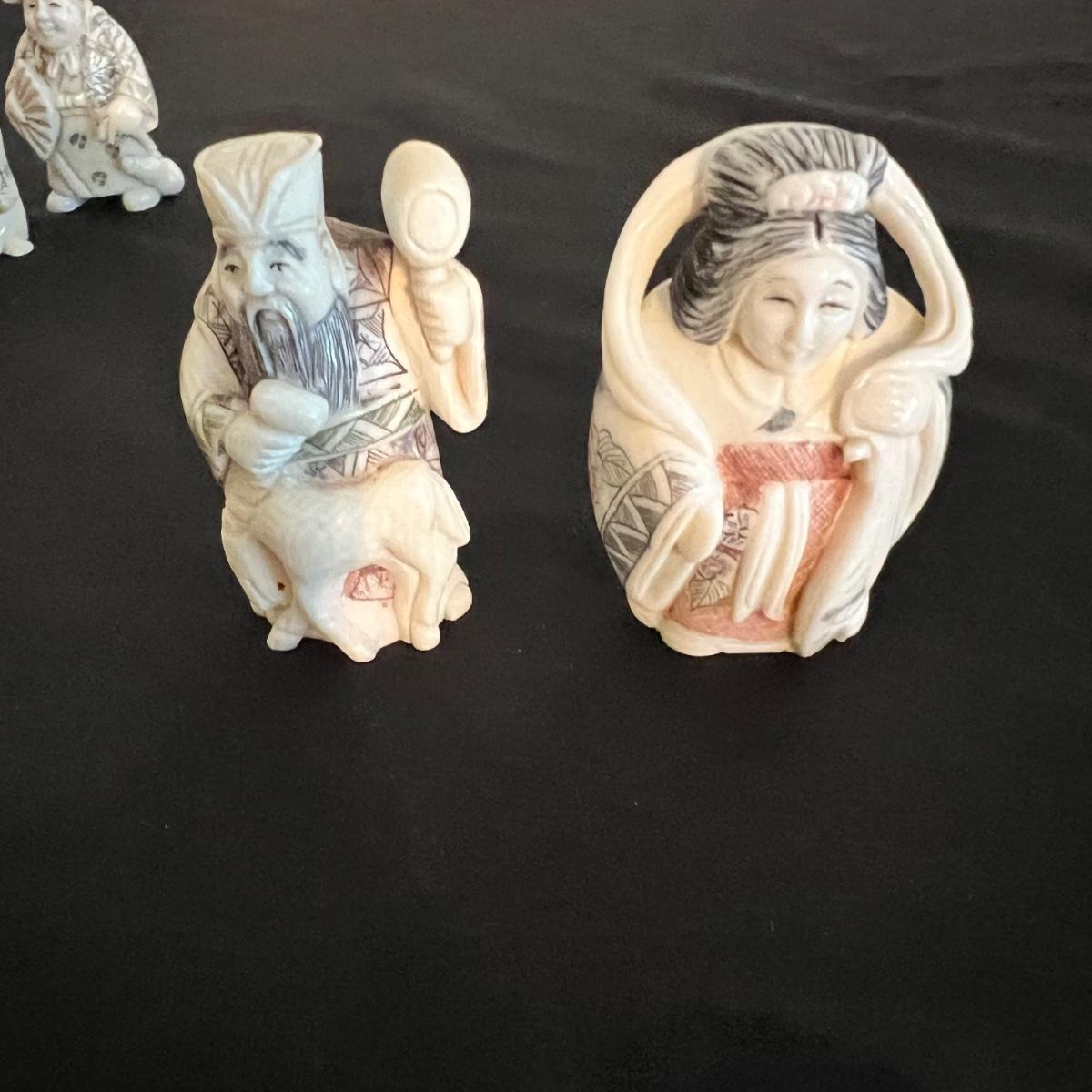 A collection of eight figurines that appear to be Netsuke and appear to be made from a natural bone like material. One has a rotating head and most of them have holes in their backs likely there for a cord or string to pass through, suggesting its use as a pendant, an ornament to be hung, or possibly a toggle.