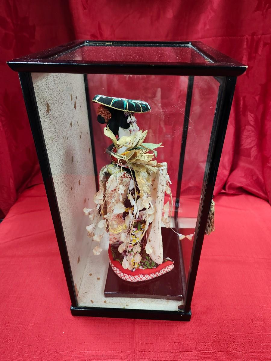 Beautiful vintage Japanese Geisha doll in glass case, 13 " tall. She is in a full Kimono. She was purchased in the 1950s in Japan and was donated by the original owner. She is in very nice condition. Similar pieces retail at $200-$300.