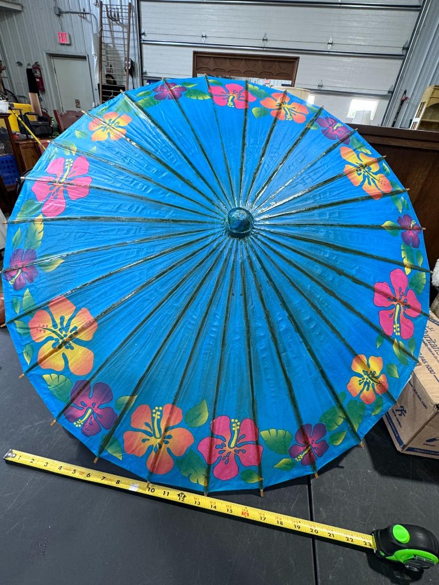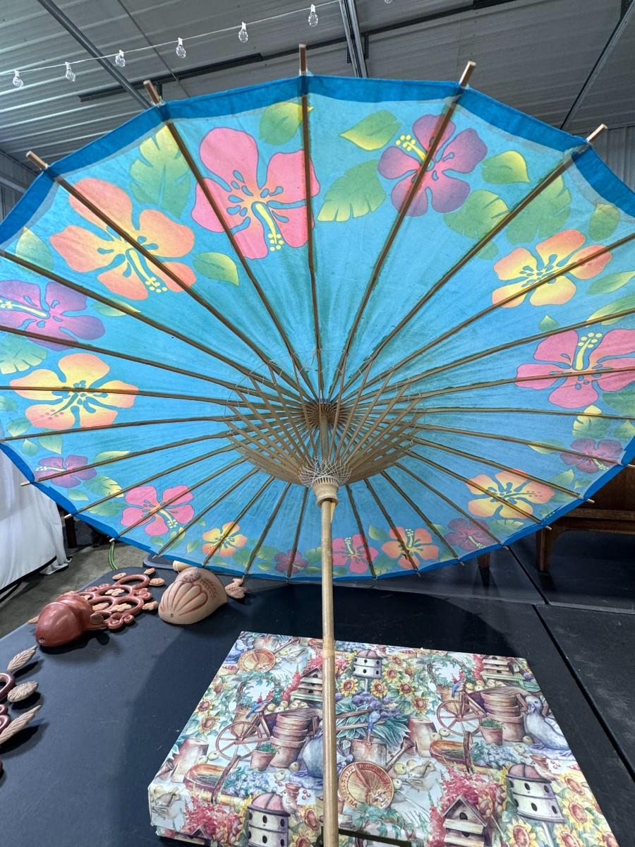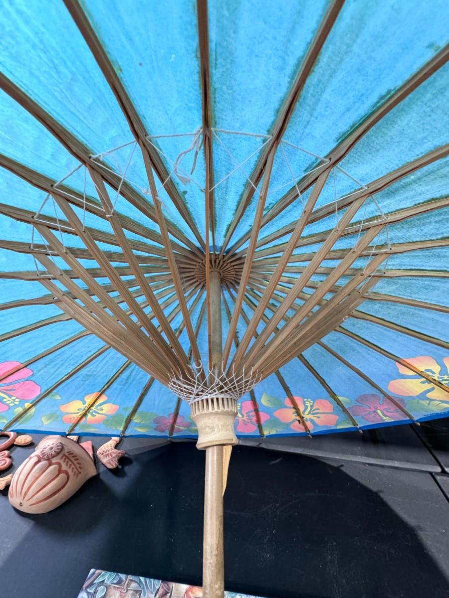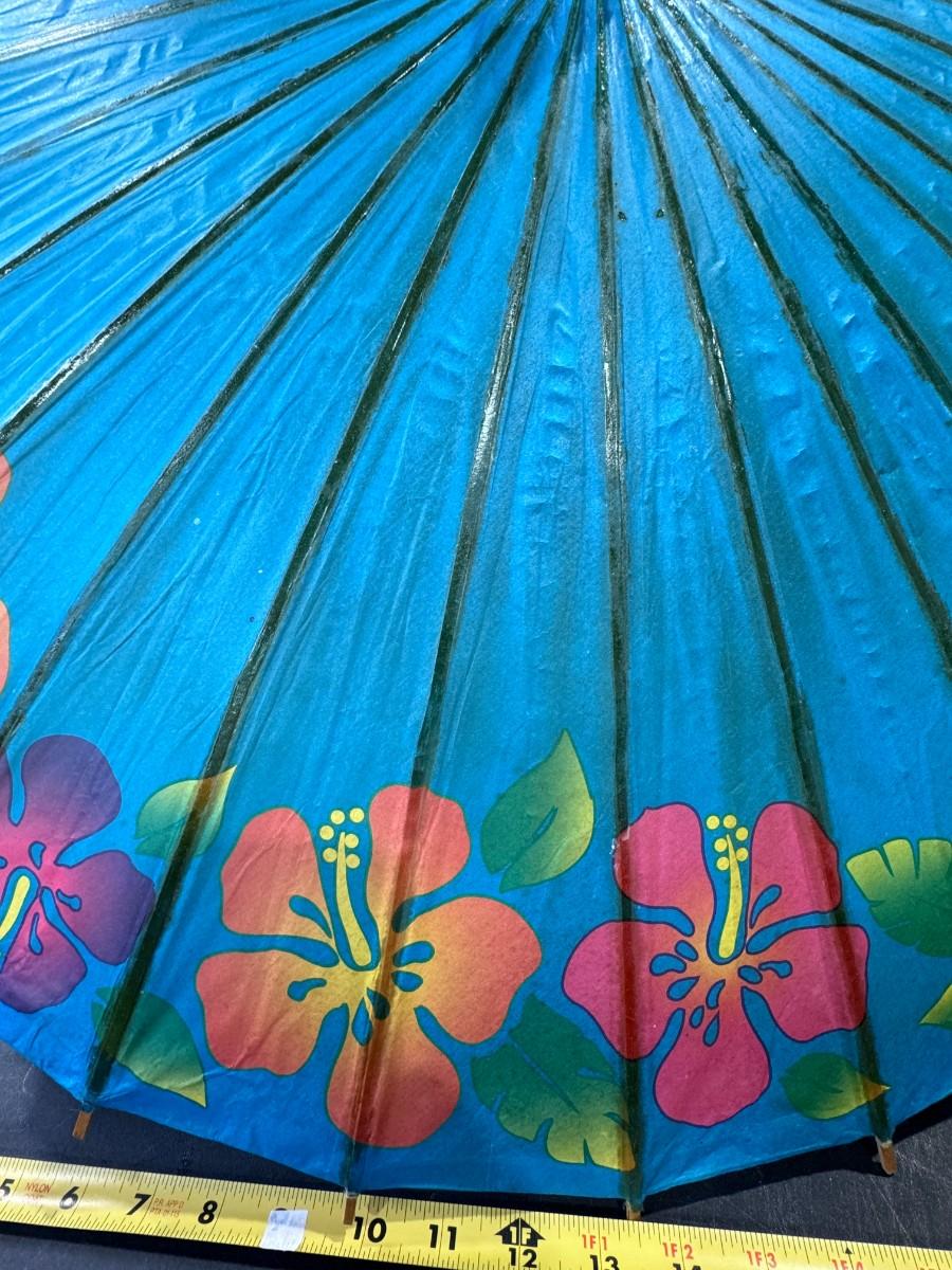 blue paper parasol decorated with hibiscus flowers, likely of Asian origin, possibly Japanese or Chinese. These parasols are traditionally crafted from materials such as bamboo and rice paper.