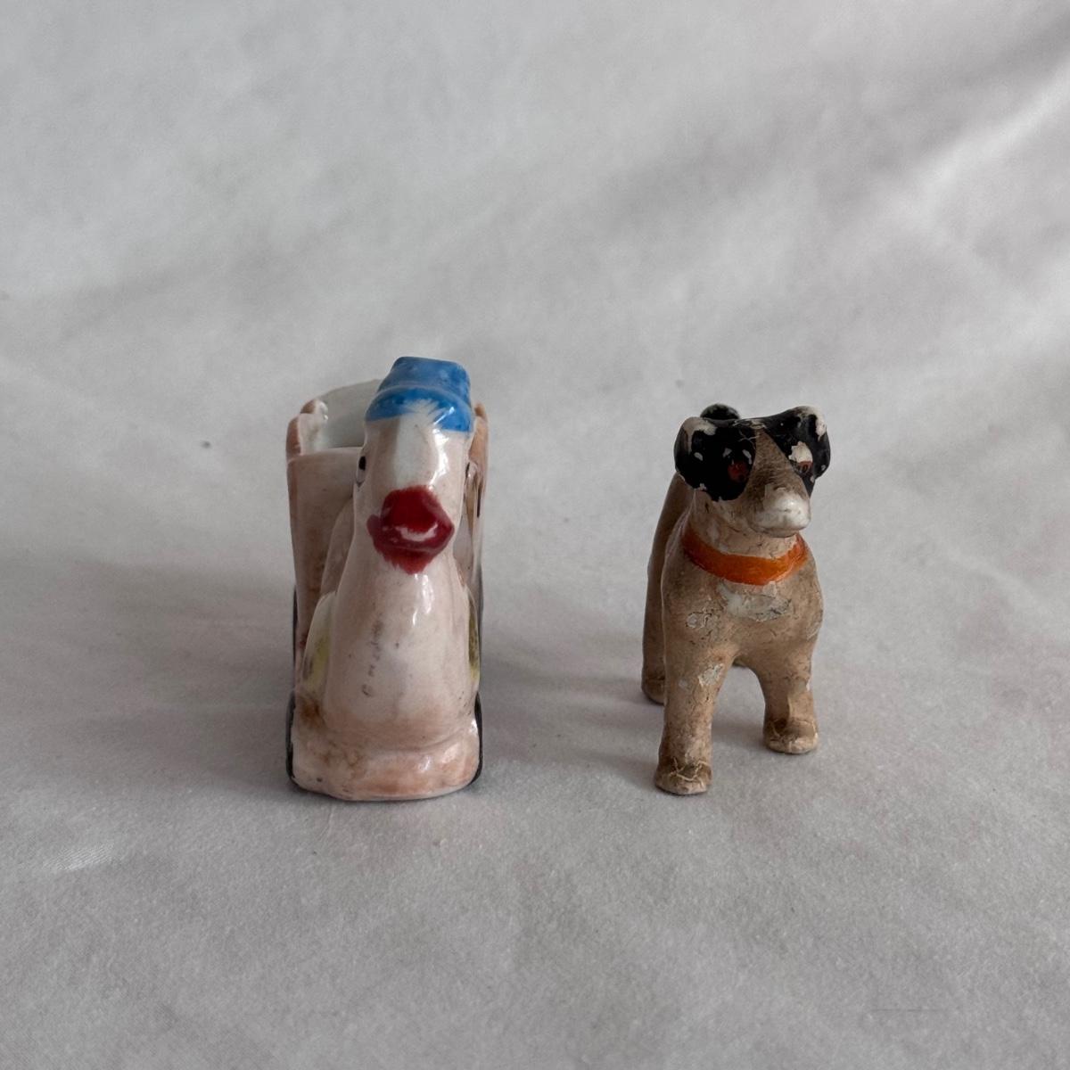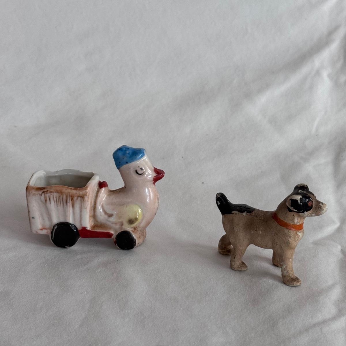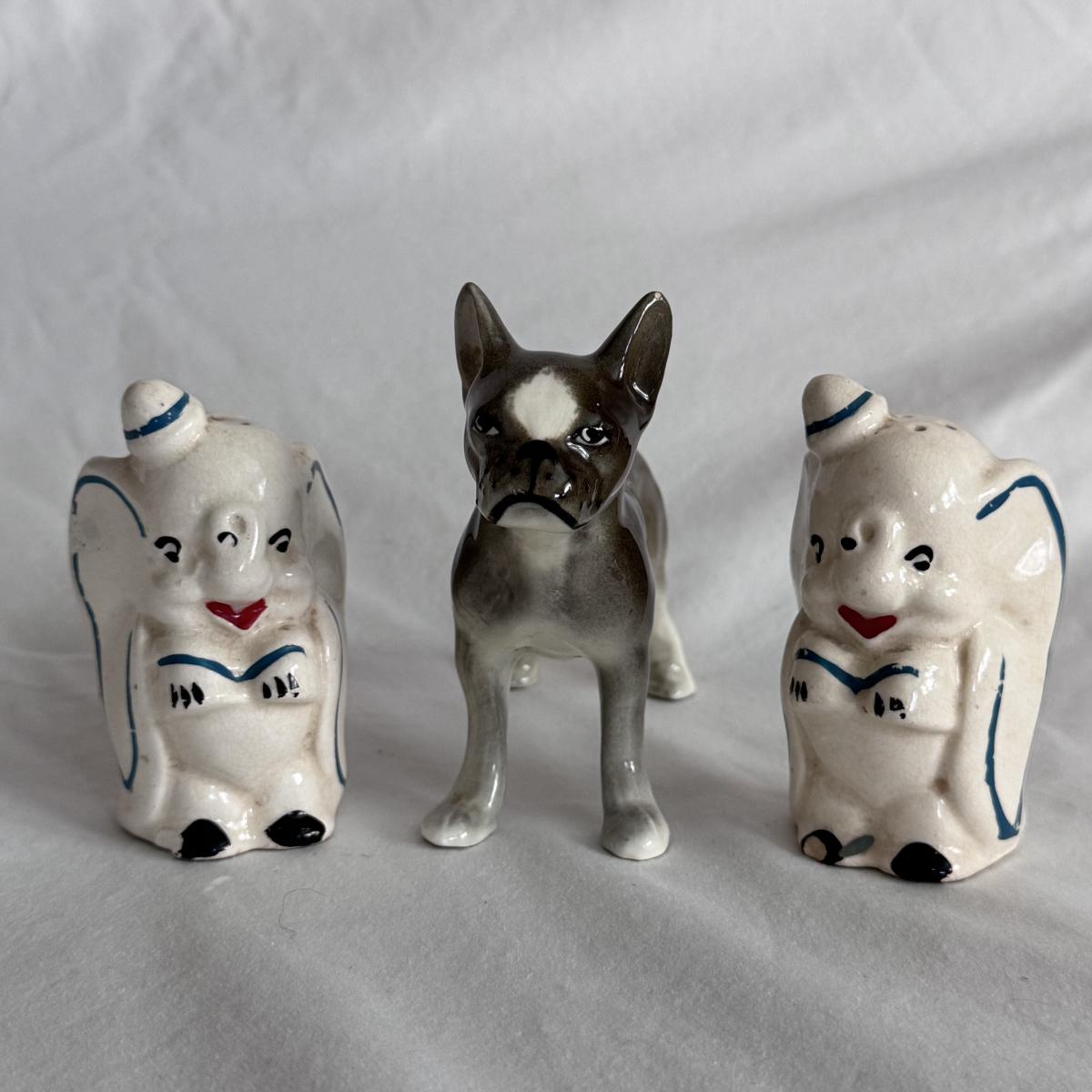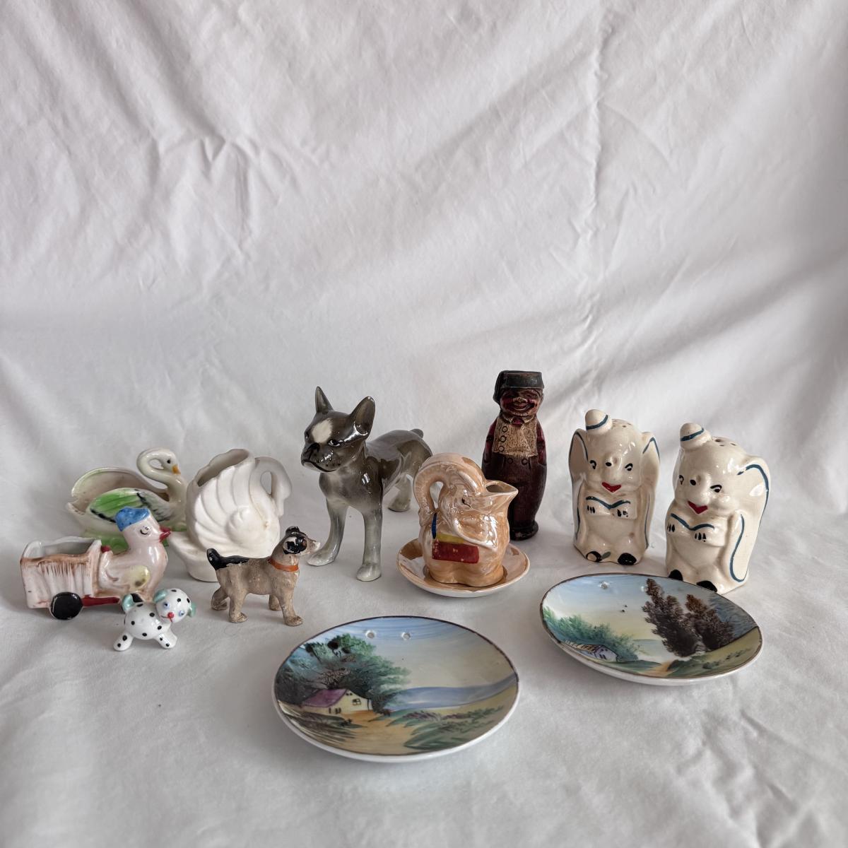 This lot includes two porcelain circus elephant salt and pepper shakers from Japan, porcelain Boston terrier figurine, two small ceramic swan vases (one signed with what appears to be Beritice), and one Syroco wood figurine. You’ll also find one small dog figurine with Germany 1025 stamped, a small porcelain duck toothpick holder, a small ceramic dog with “made in Japan” in the bottom, and a porcelain elephant and small resting dish - both stamped with Made in Japan. Lastly, you’ll find two small decorative plates, both signed with Kimuna and stamped with Japan on the back. The plates individually measure almost 4”D. The small dog with Germany 1025 stamped in the bottom has a small chip on its foot. Shipping available.