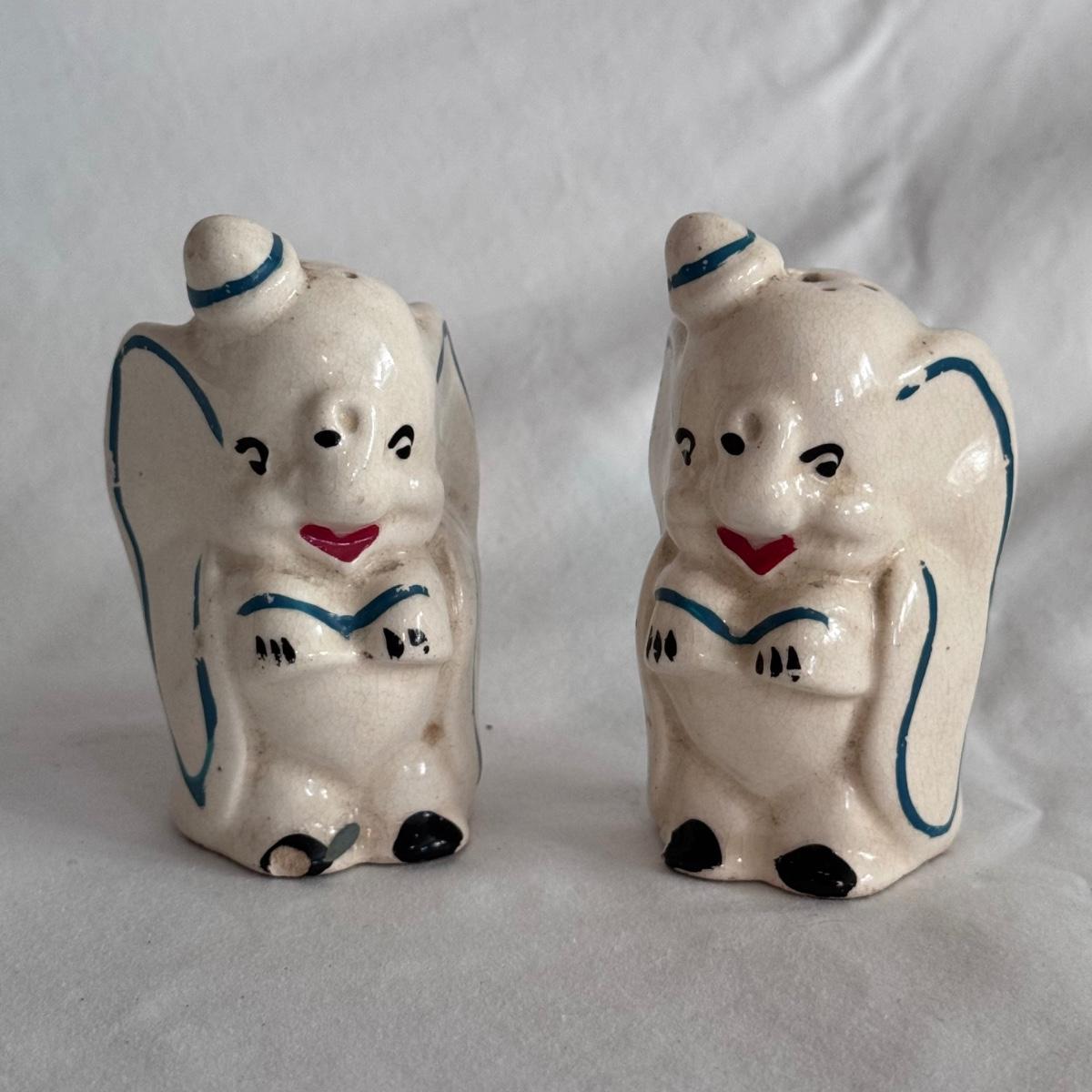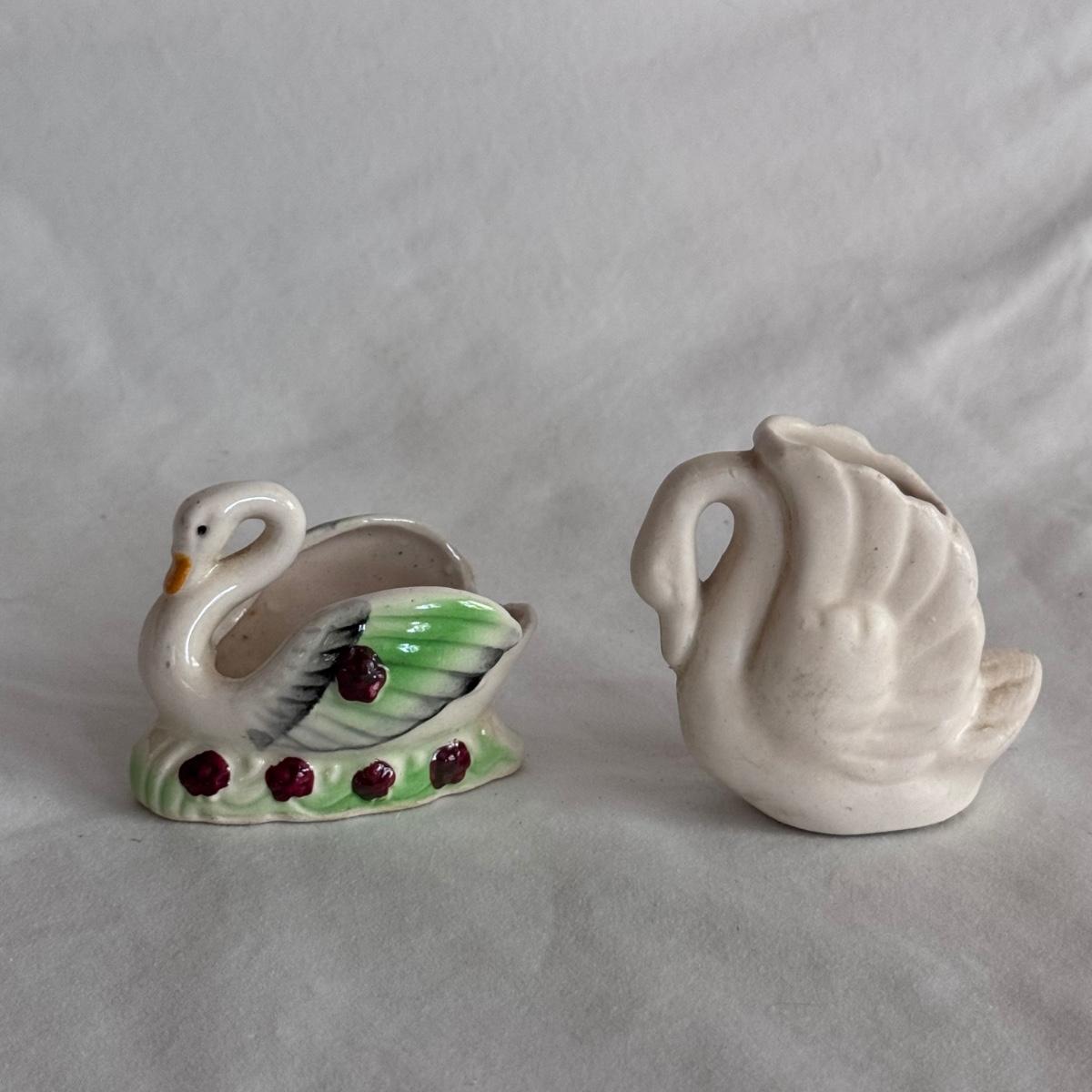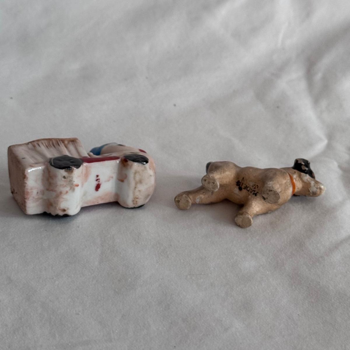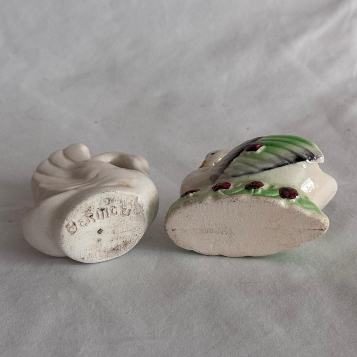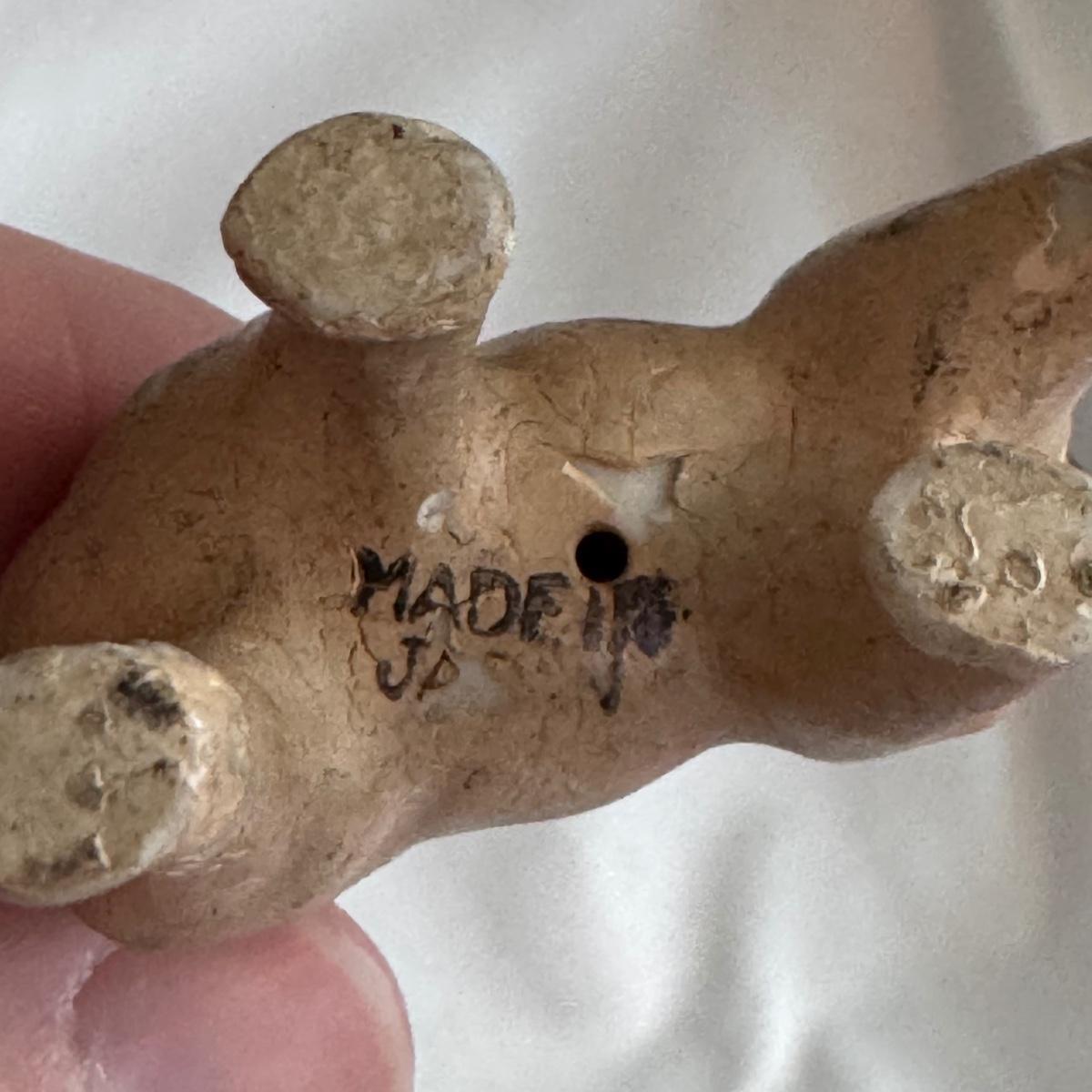 This lot includes two porcelain circus elephant salt and pepper shakers from Japan, porcelain Boston terrier figurine, two small ceramic swan vases (one signed with what appears to be Beritice), and one Syroco wood figurine. You’ll also find one small dog figurine with Germany 1025 stamped, a small porcelain duck toothpick holder, a small ceramic dog with “made in Japan” in the bottom, and a porcelain elephant and small resting dish - both stamped with Made in Japan. Lastly, you’ll find two small decorative plates, both signed with Kimuna and stamped with Japan on the back. The plates individually measure almost 4”D. The small dog with Germany 1025 stamped in the bottom has a small chip on its foot. Shipping available.