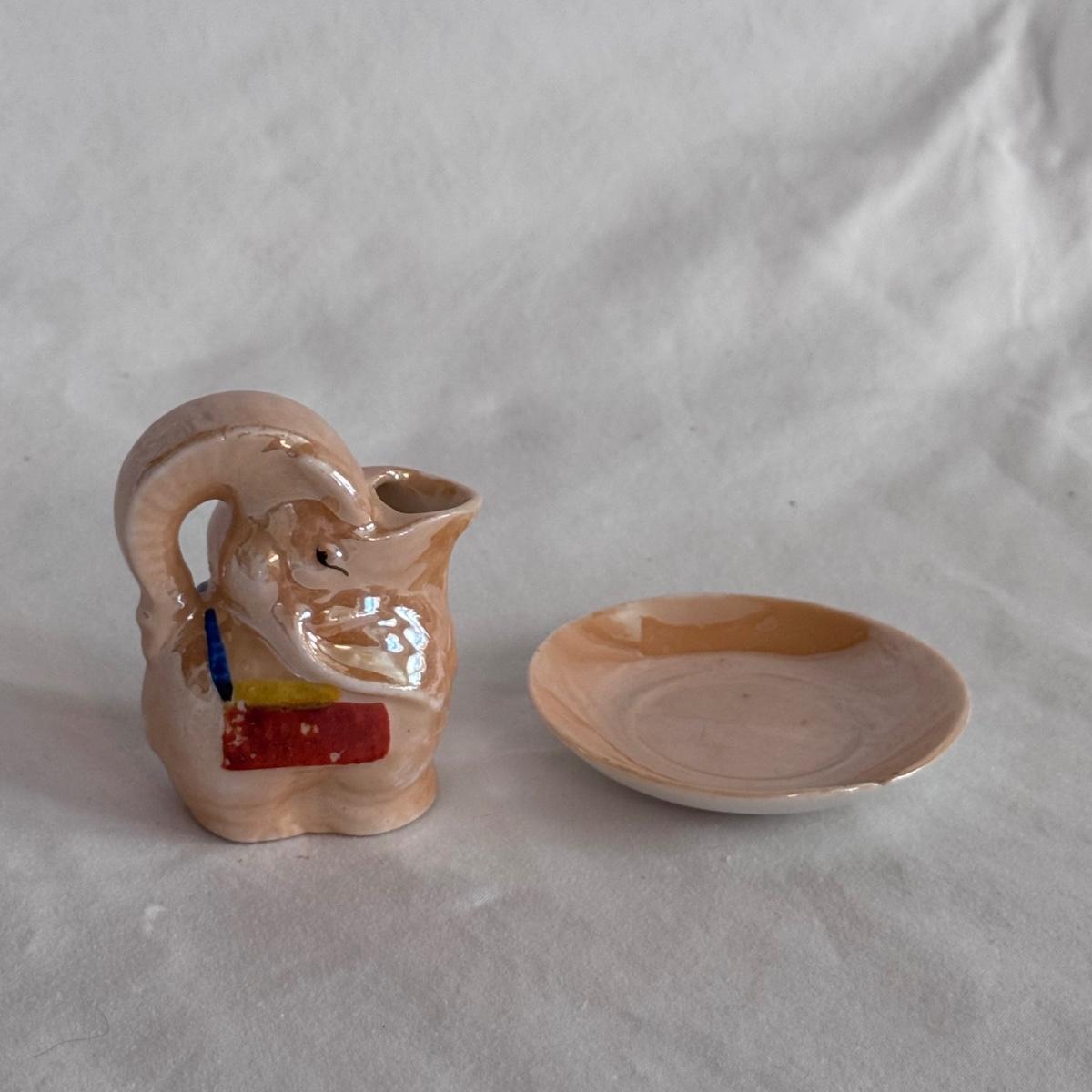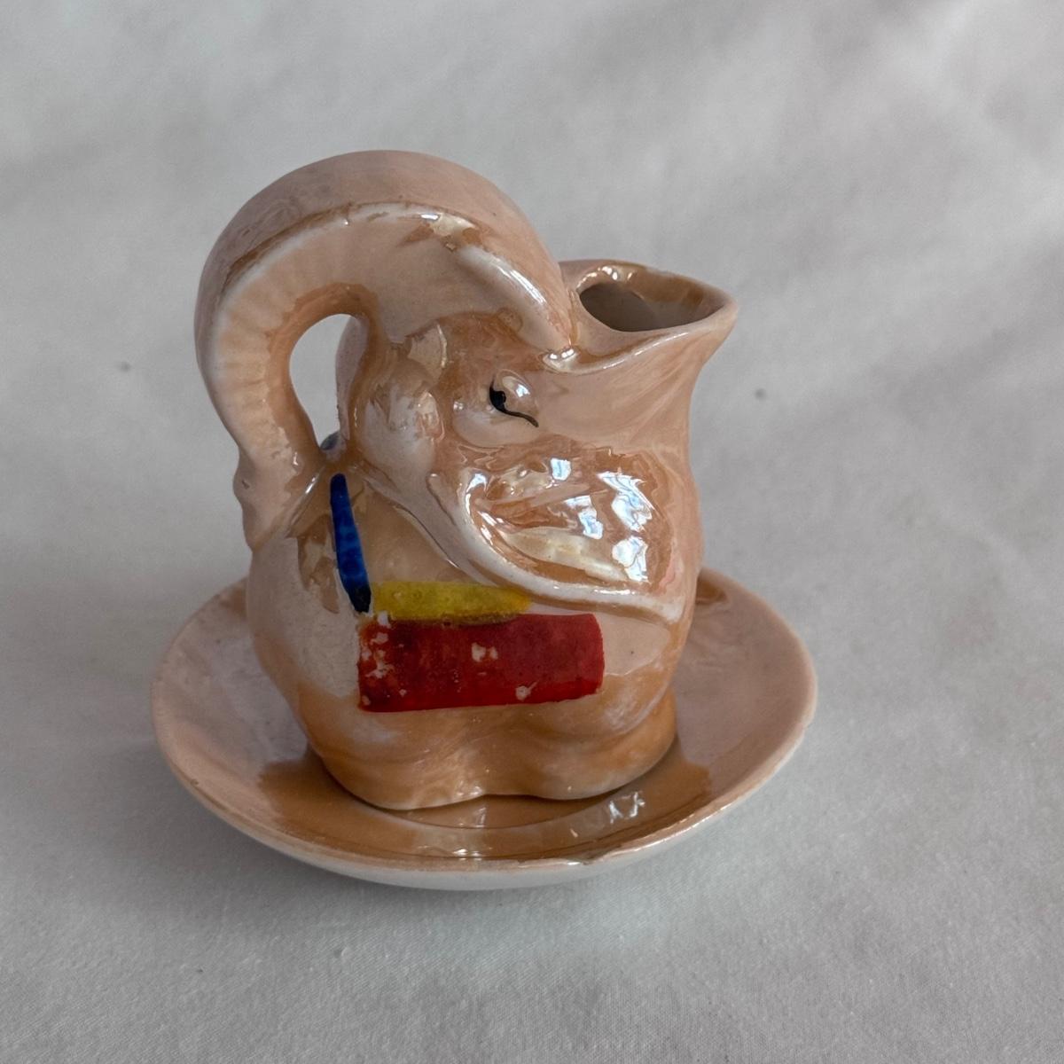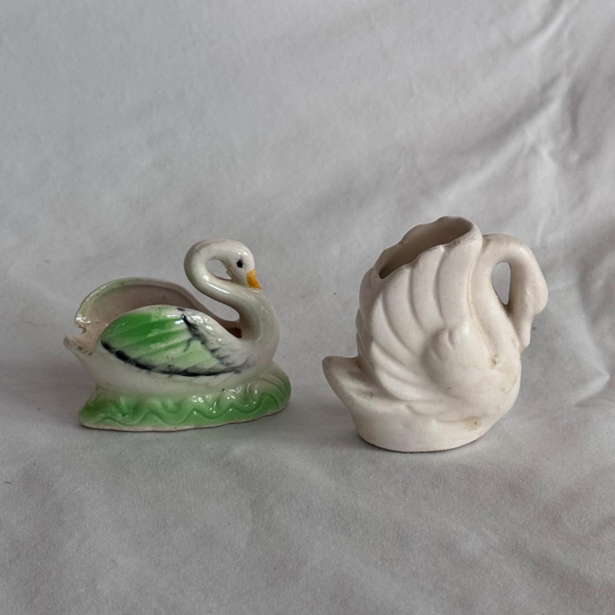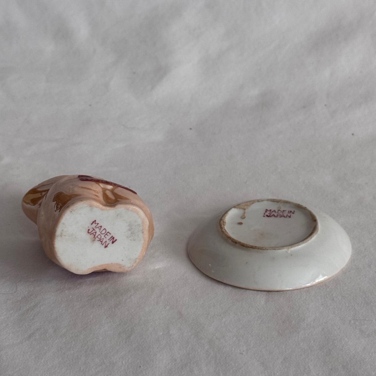 This lot includes two porcelain circus elephant salt and pepper shakers from Japan, porcelain Boston terrier figurine, two small ceramic swan vases (one signed with what appears to be Beritice), and one Syroco wood figurine. You’ll also find one small dog figurine with Germany 1025 stamped, a small porcelain duck toothpick holder, a small ceramic dog with “made in Japan” in the bottom, and a porcelain elephant and small resting dish - both stamped with Made in Japan. Lastly, you’ll find two small decorative plates, both signed with Kimuna and stamped with Japan on the back. The plates individually measure almost 4”D. The small dog with Germany 1025 stamped in the bottom has a small chip on its foot. Shipping available.