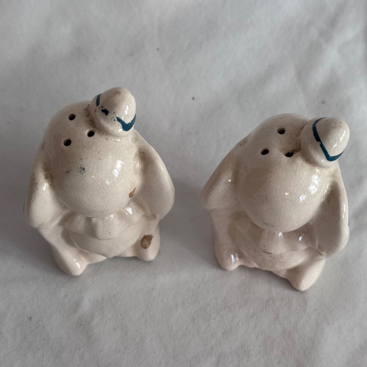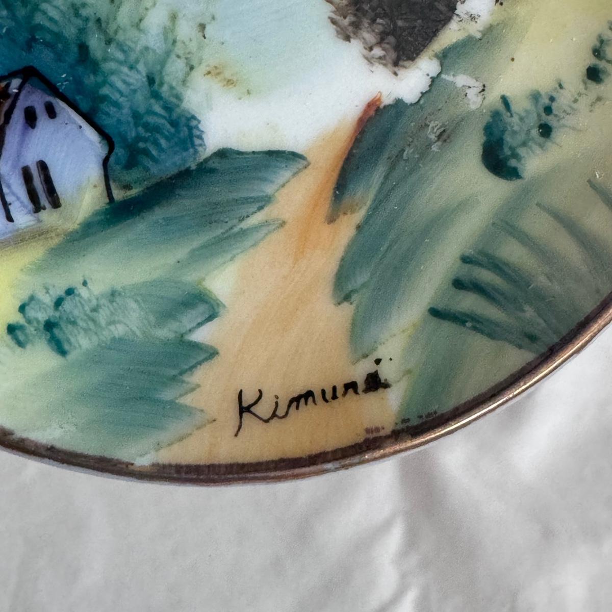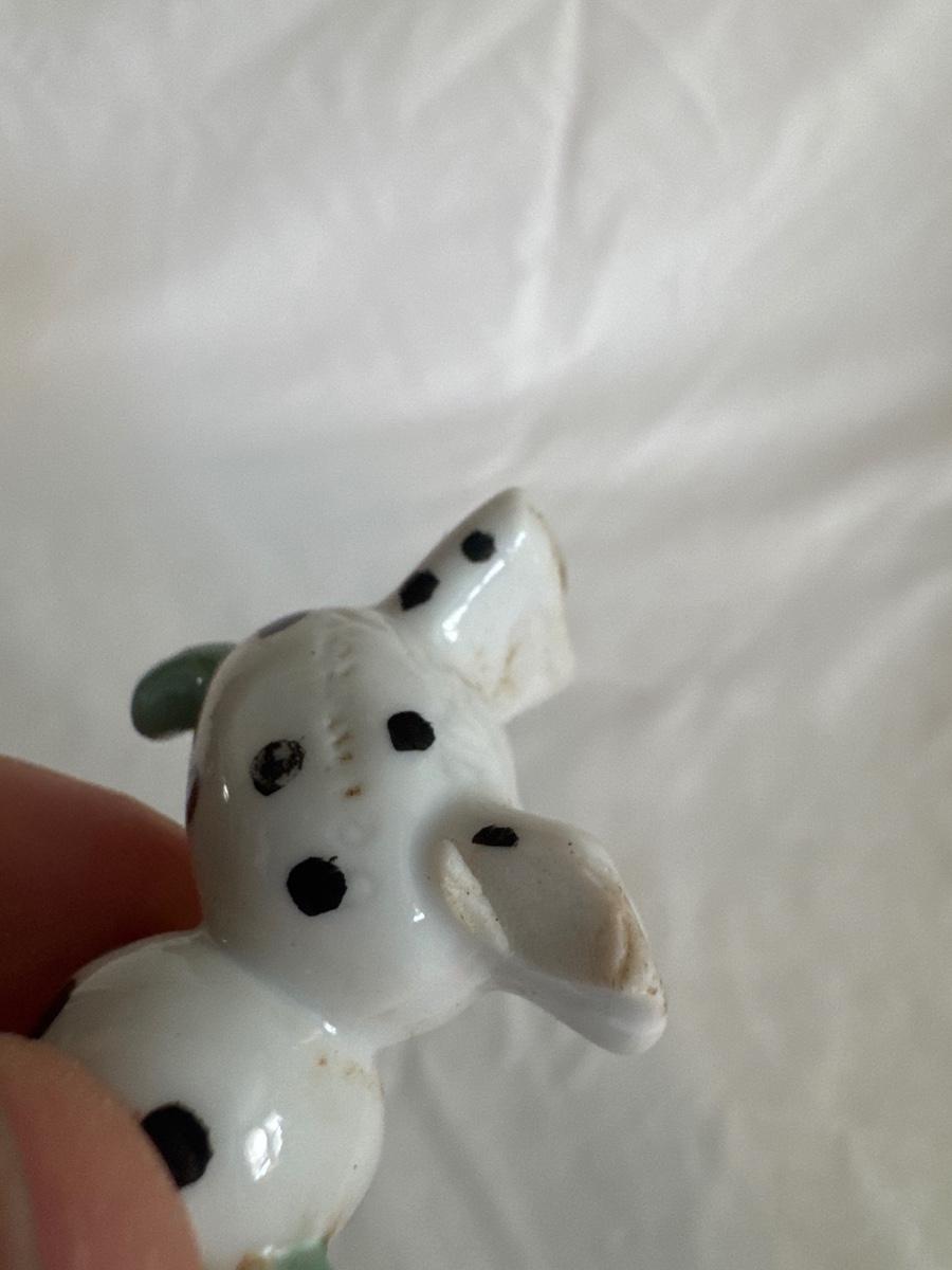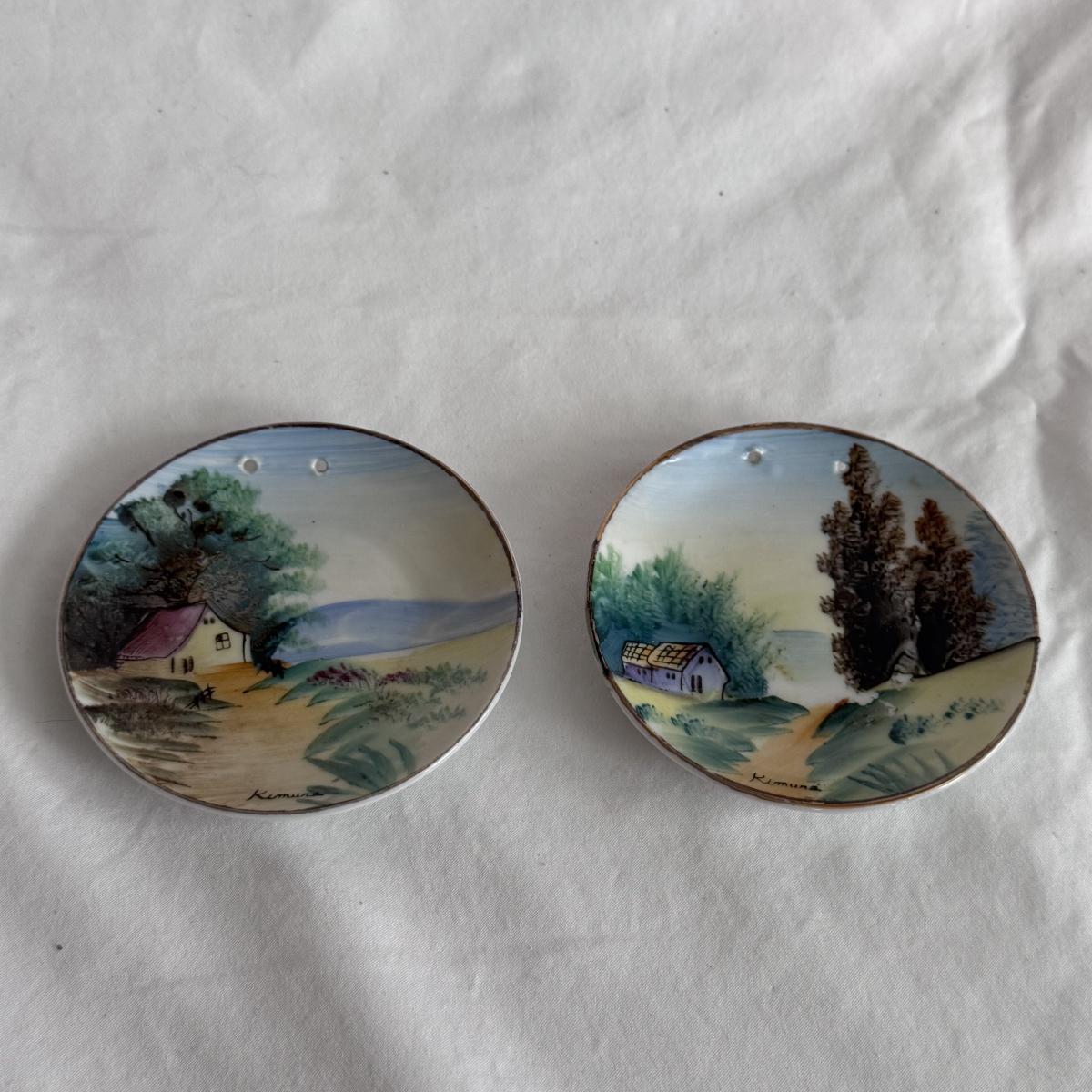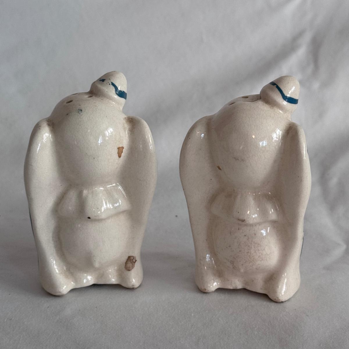 This lot includes two porcelain circus elephant salt and pepper shakers from Japan, porcelain Boston terrier figurine, two small ceramic swan vases (one signed with what appears to be Beritice), and one Syroco wood figurine. You’ll also find one small dog figurine with Germany 1025 stamped, a small porcelain duck toothpick holder, a small ceramic dog with “made in Japan” in the bottom, and a porcelain elephant and small resting dish - both stamped with Made in Japan. Lastly, you’ll find two small decorative plates, both signed with Kimuna and stamped with Japan on the back. The plates individually measure almost 4”D. The small dog with Germany 1025 stamped in the bottom has a small chip on its foot. Shipping available.