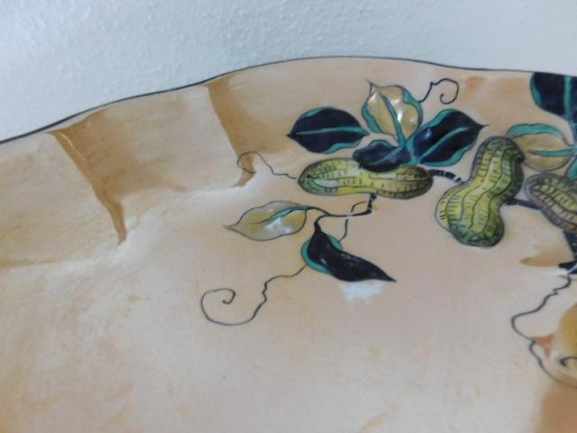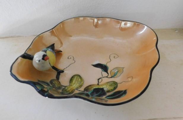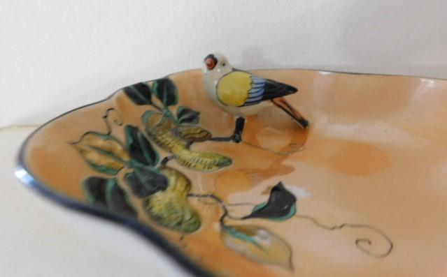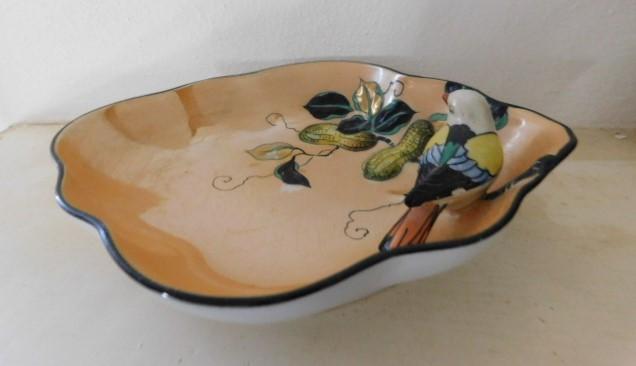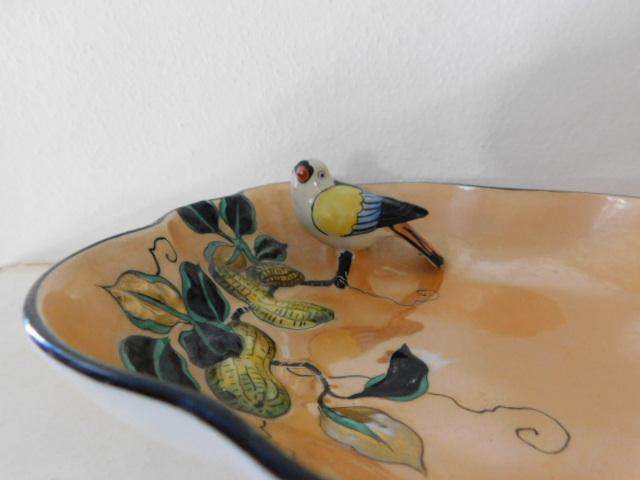 Japanese Porcelain Luster Ware Bird Perched on a Peanut Branch 9"