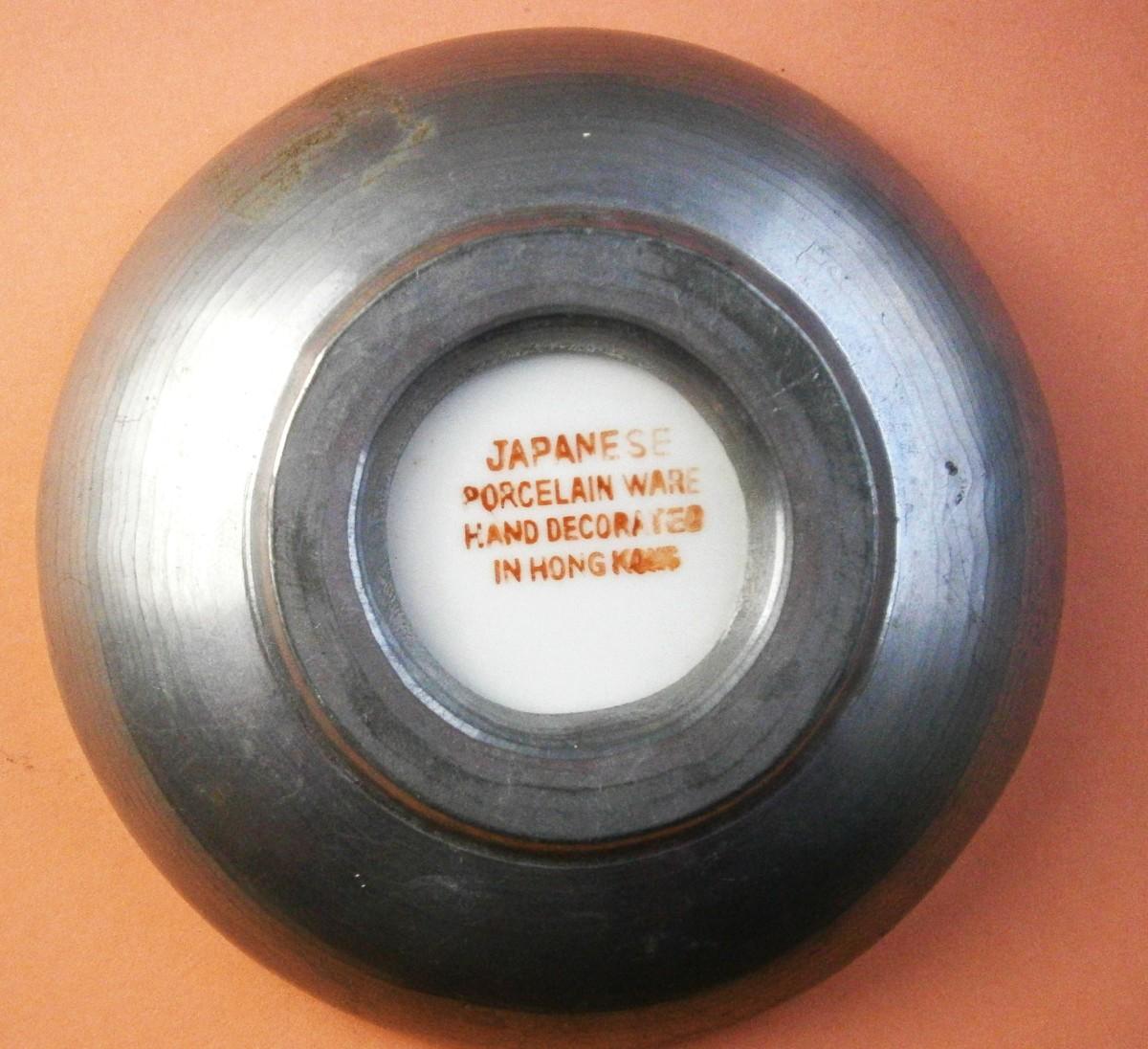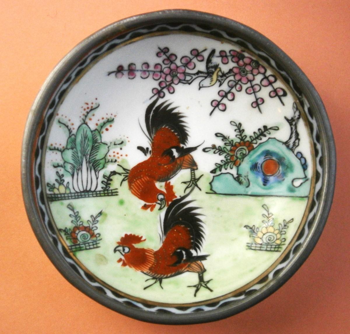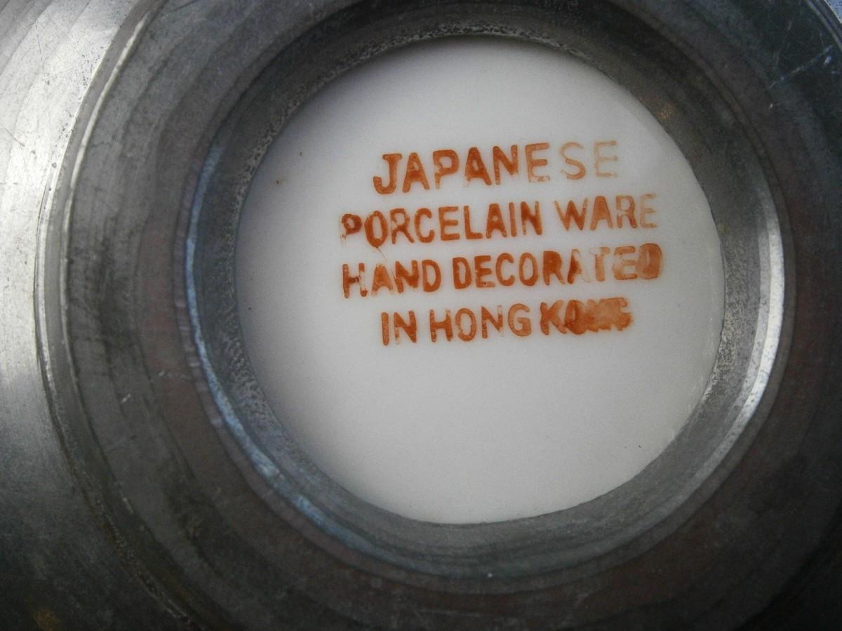JAPANESE PORCELAIN WARE Bowl made in Hong Kong, hand decorated, from the early to mid 1900's, 4 in. diameter, hand painted porcelain in a pewter frame.
