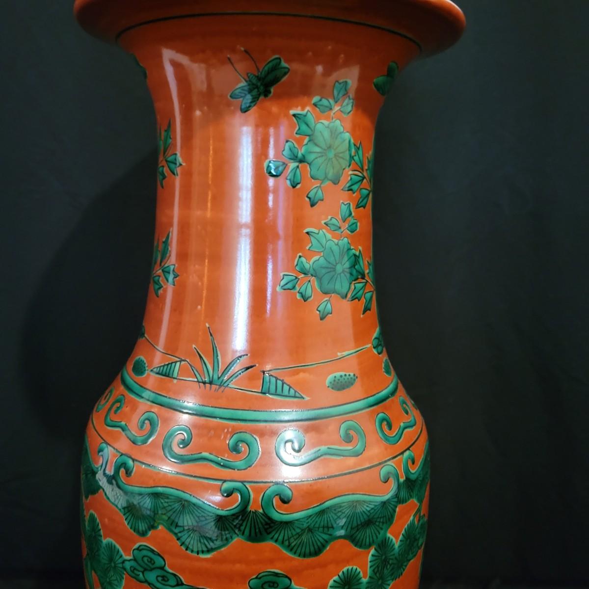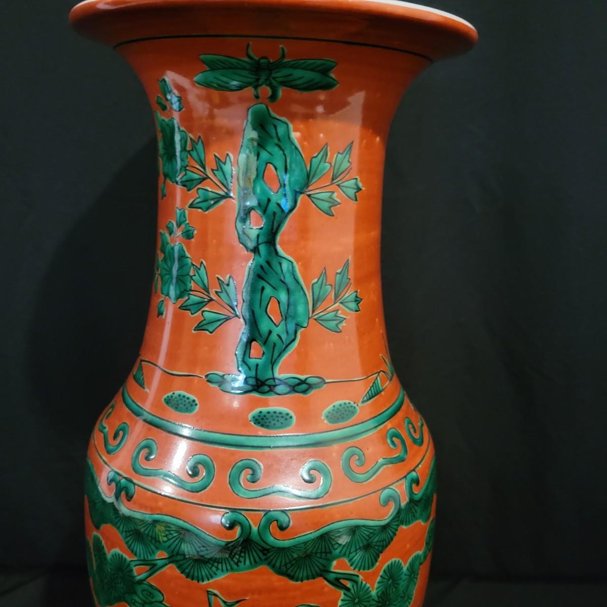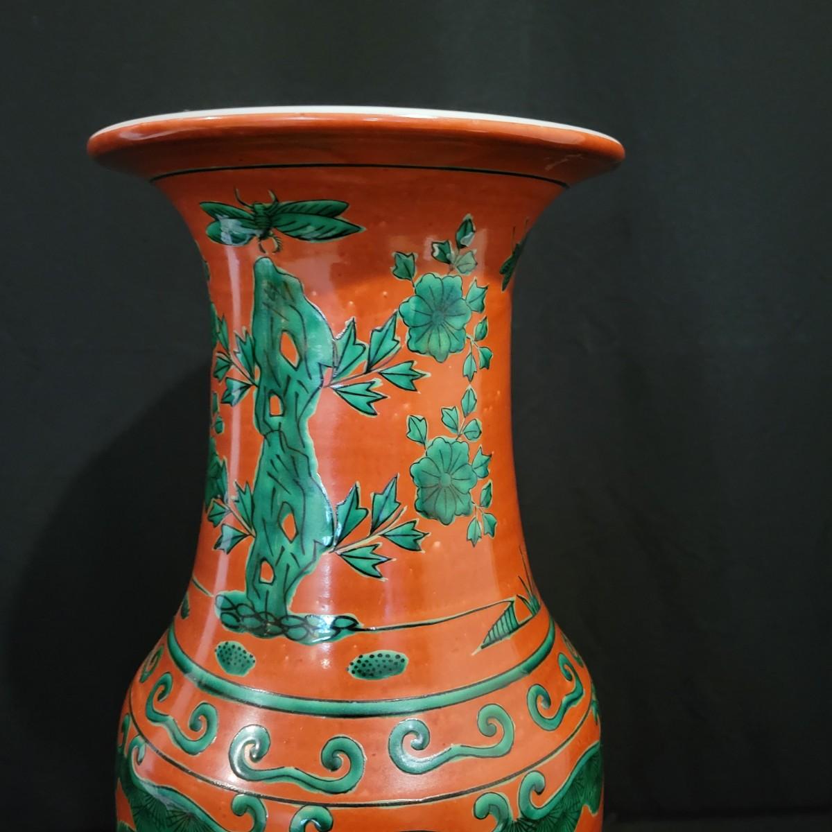 A brick red vase with green designs that appears to be made of porcelain. It measures approximately 7"D x 17"H. Shipping available