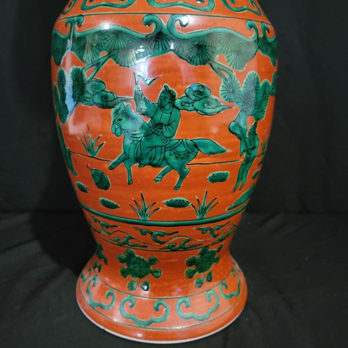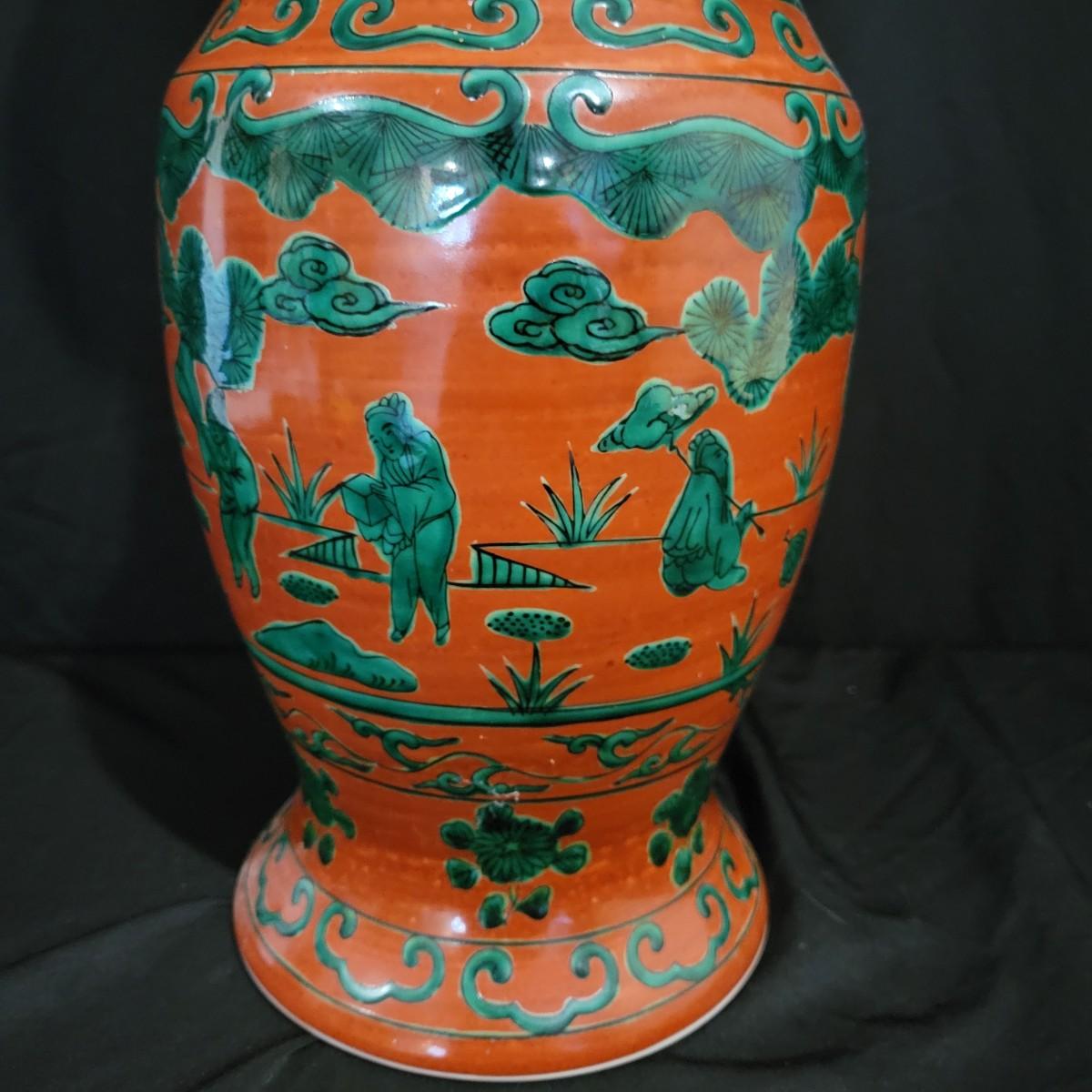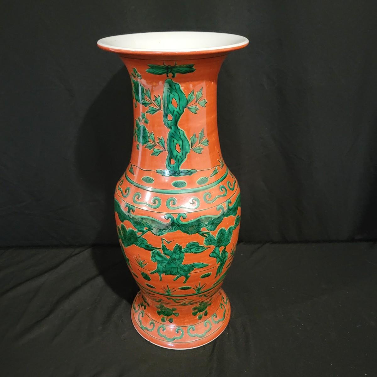 A brick red vase with green designs that appears to be made of porcelain. It measures approximately 7"D x 17"H. Shipping available