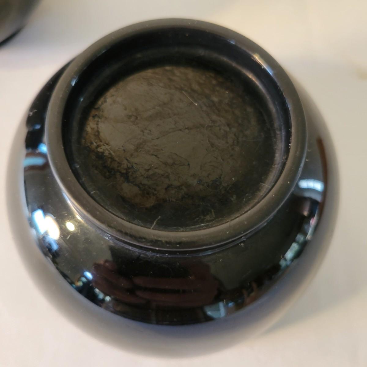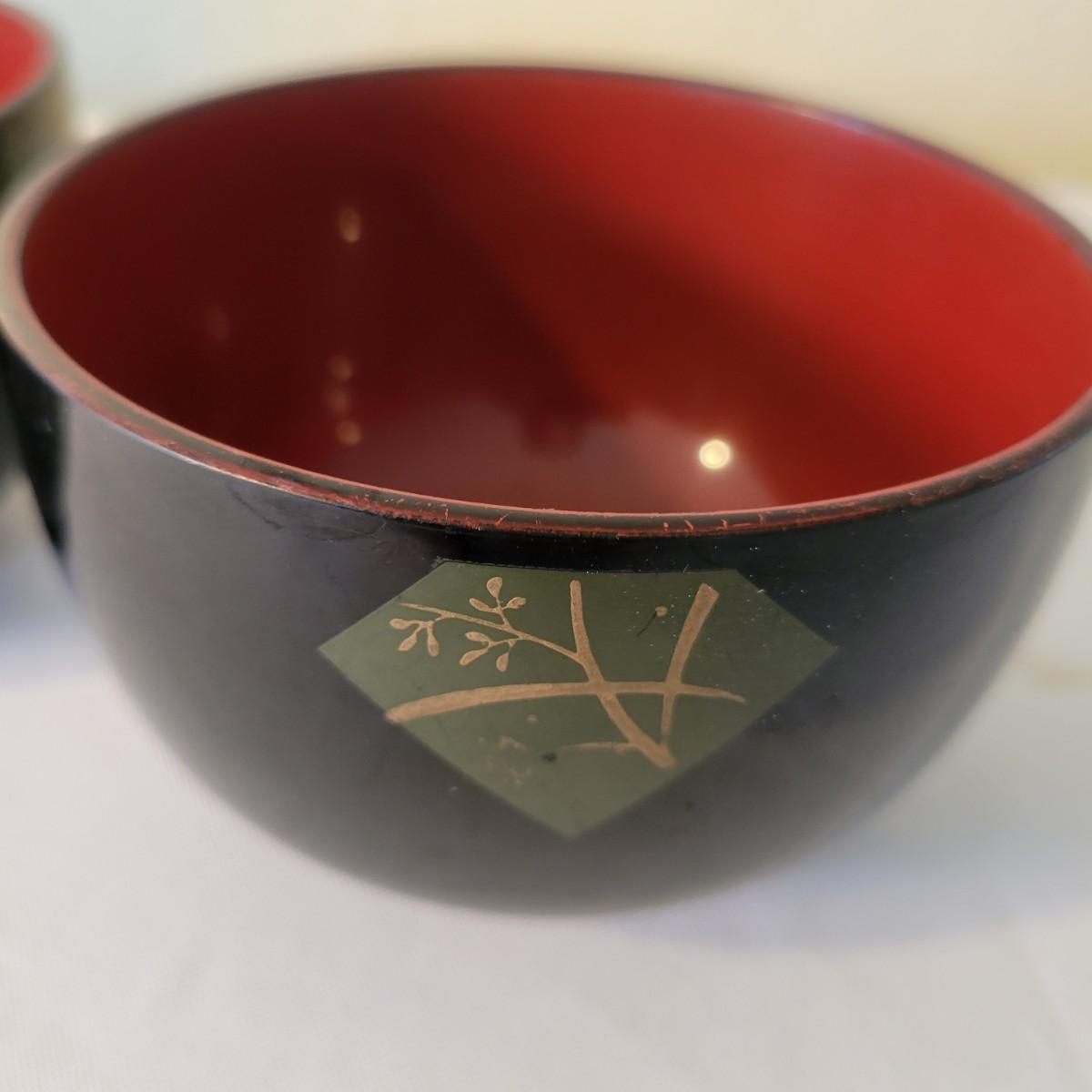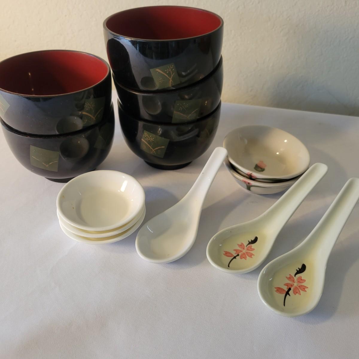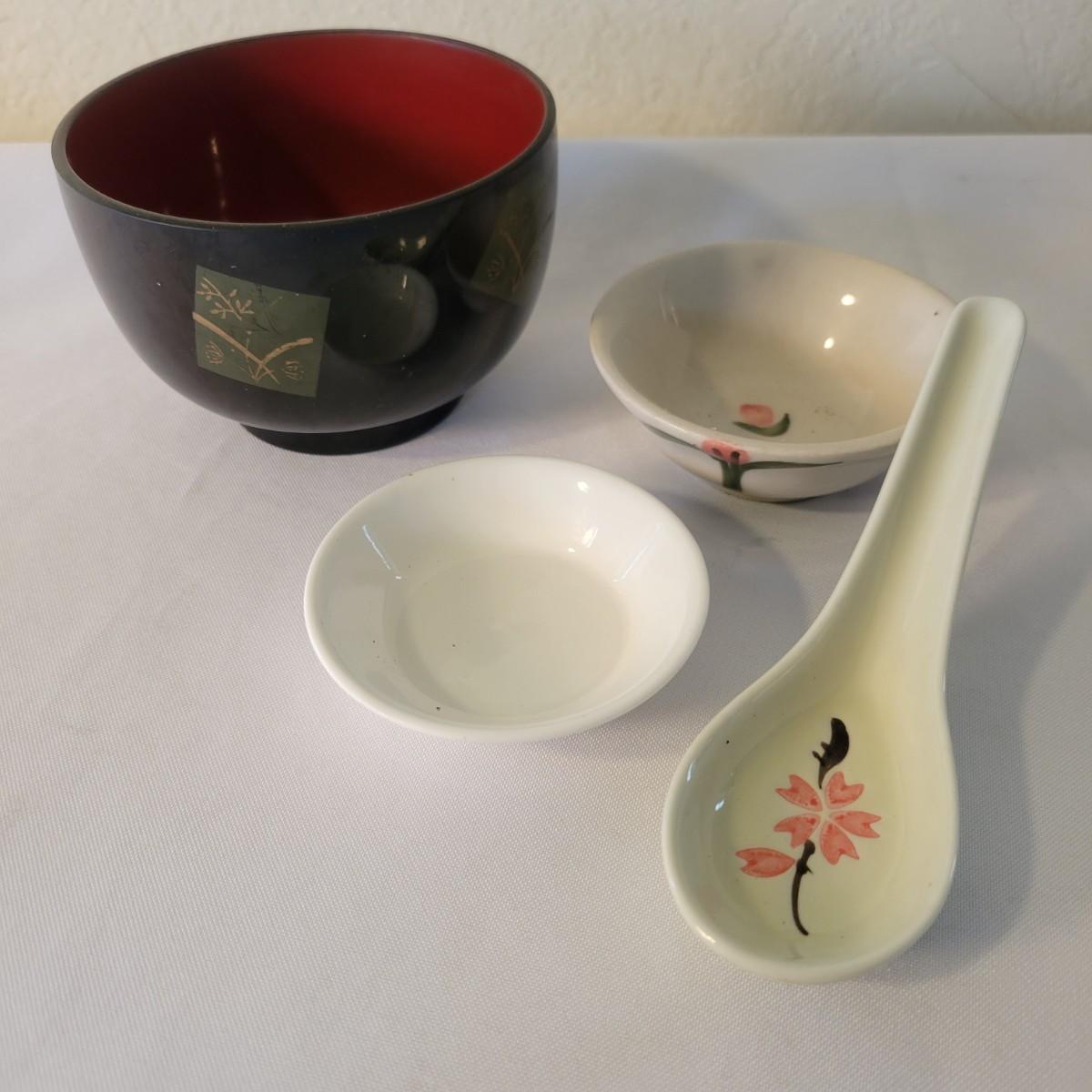 An assortment of Japanese themed bowls and dishes in good condition. One of the sauce bowls does have a notable chip in it. Included are five black bowls with red interiors and a bamboo accent. These bowls are made of plastic and measure approximately 4"D x 2.5"H. Also included are three ceramic soup spoons and five ceramic sauce bowls, two of which appear to be hand painted. Shipping available. Shipping can be costly. We suggest calling our local UPS with dimensions and getting an estimate before bidding: (828) 252-6930