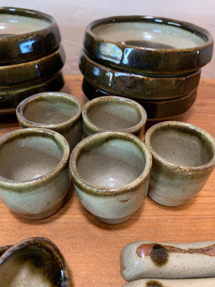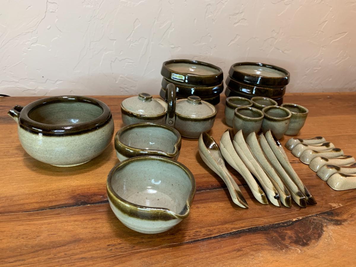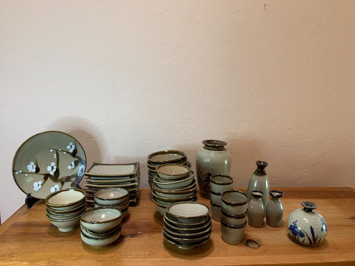 Authentic hand made Japanese Stone ware set with a total of 79 pieces. This is beautiful work and the person who made this took their time hand crafting each piece for this particular family.