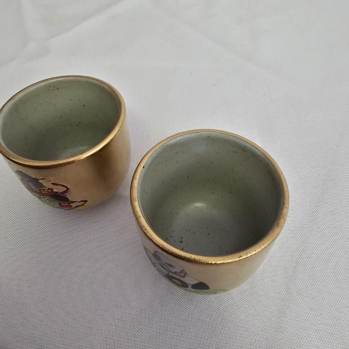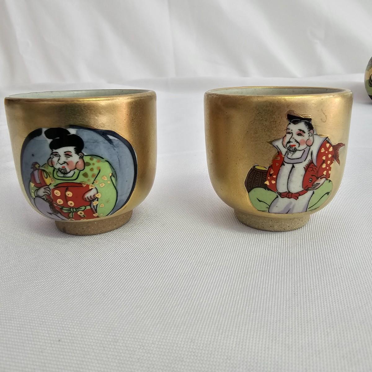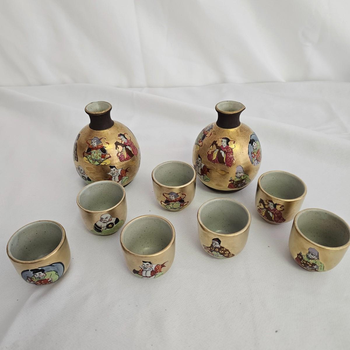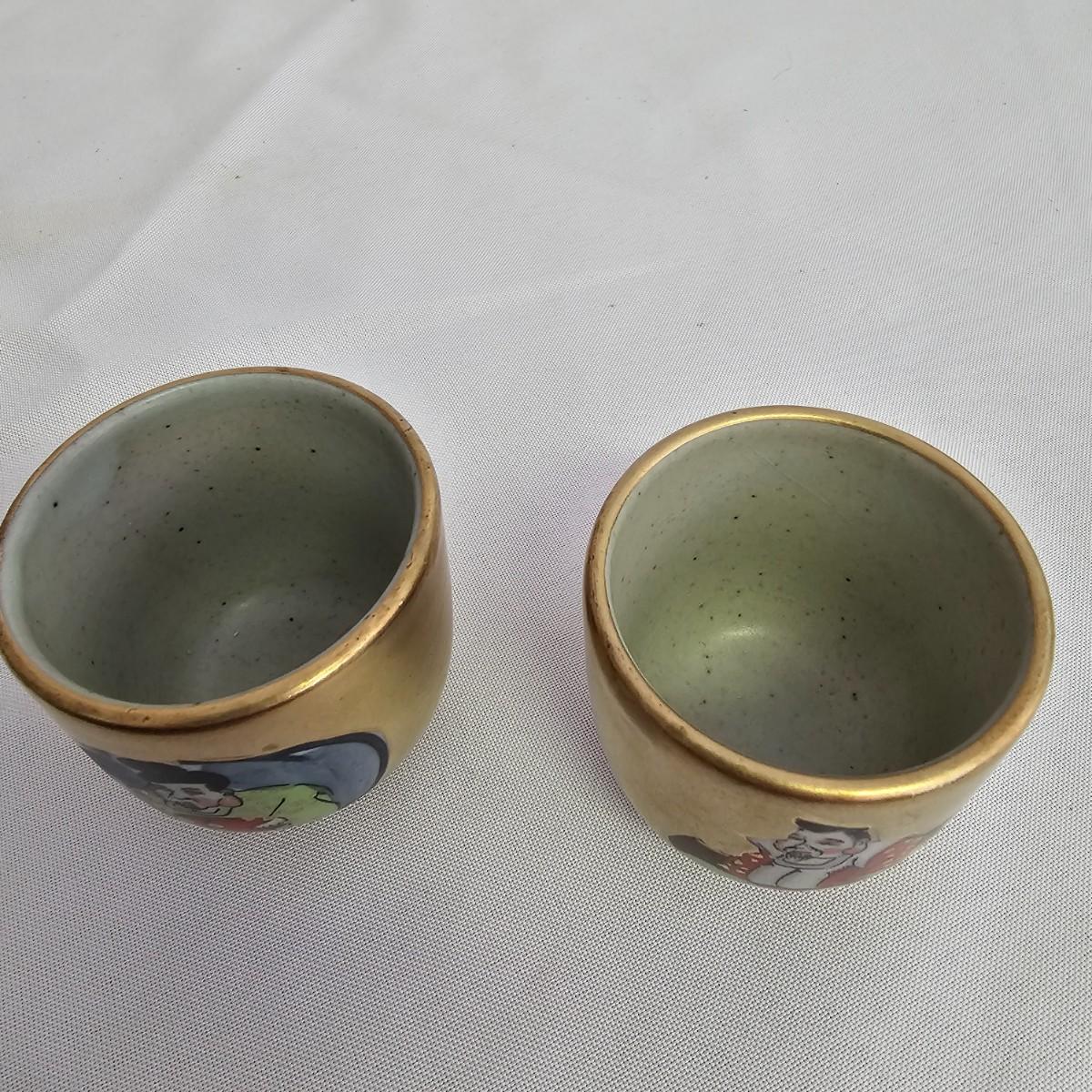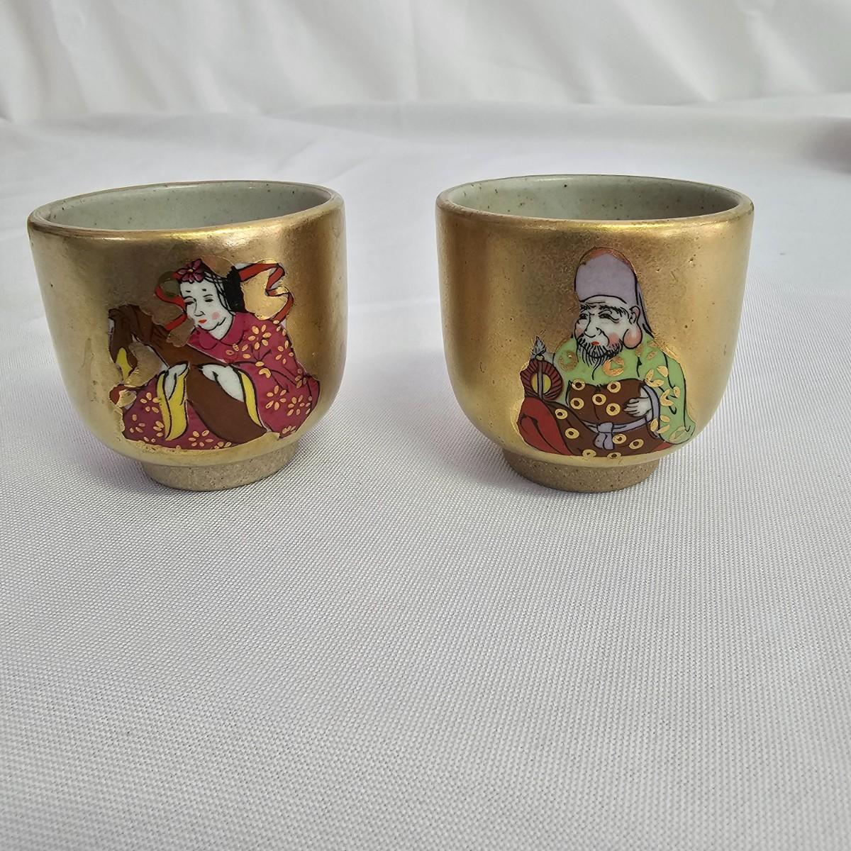 Hand painted ceramic set of two pitchers and seven cups in wooden storage case. All items have painted characters on them, surrounded by a gold background. Pitchers measure 3.25"D x 4"H, cups are 2"D x 2"H. Some minor wear on pieces, see photos for details. Shipping available.
