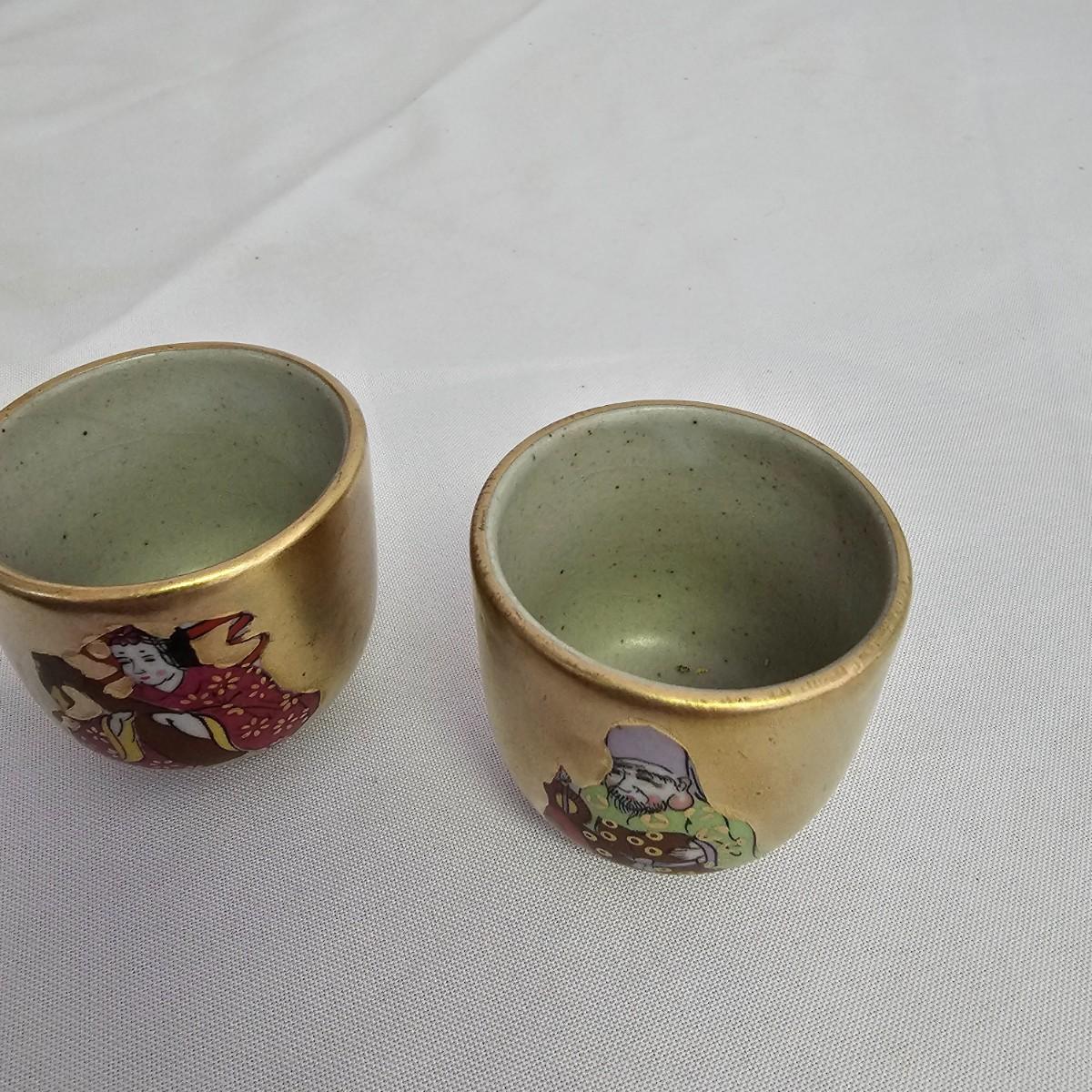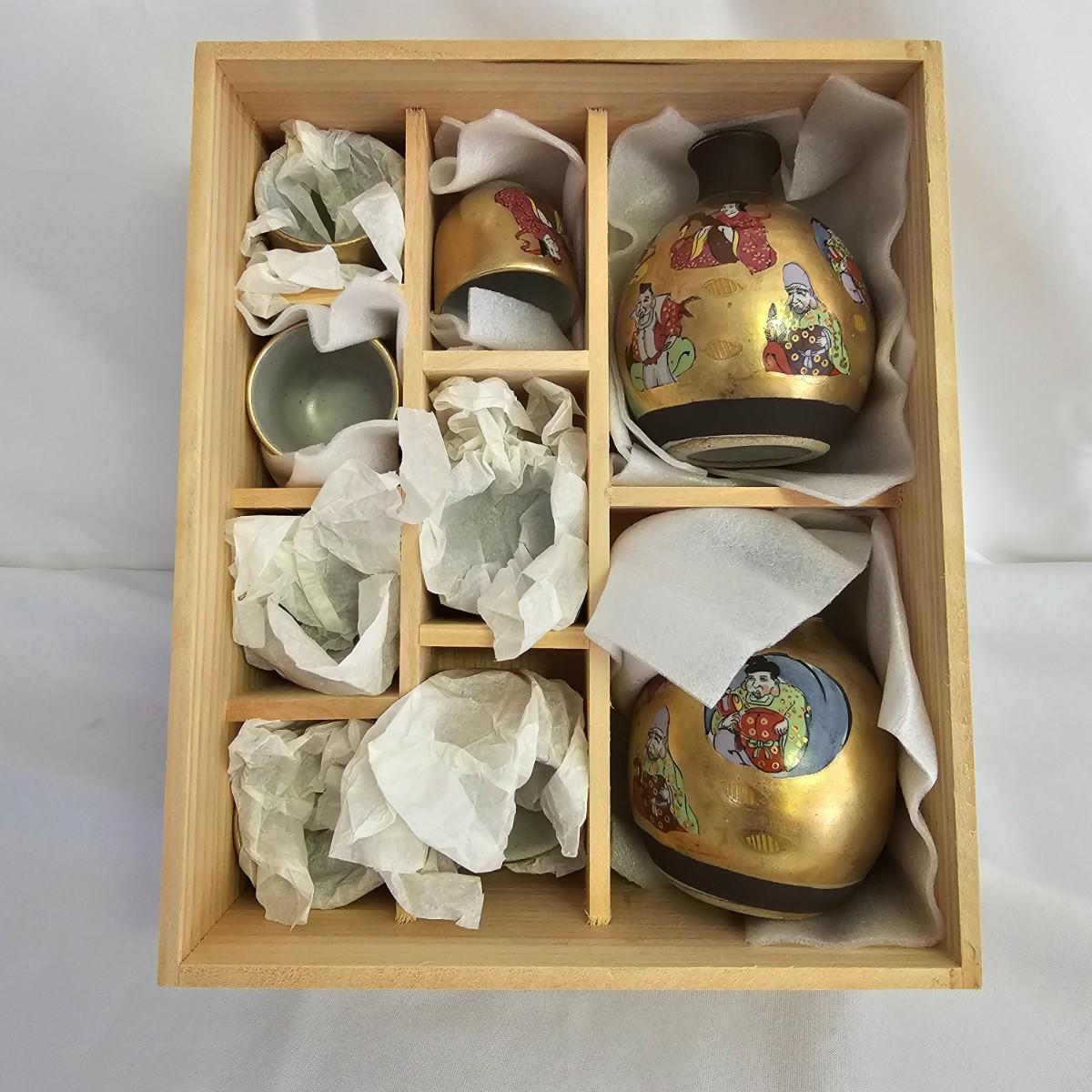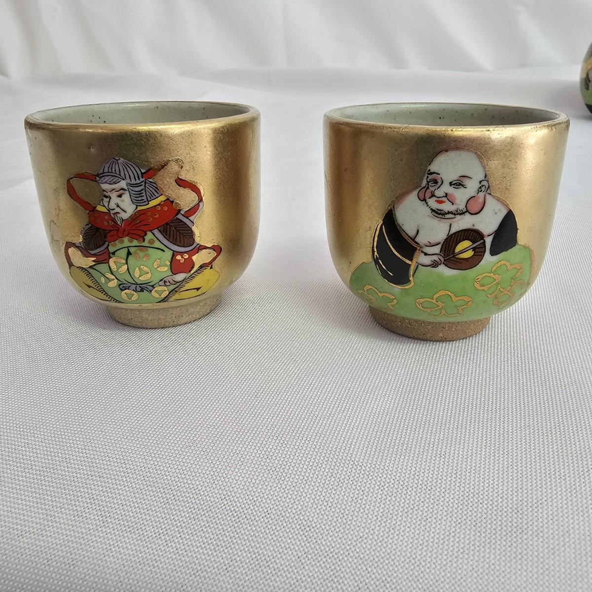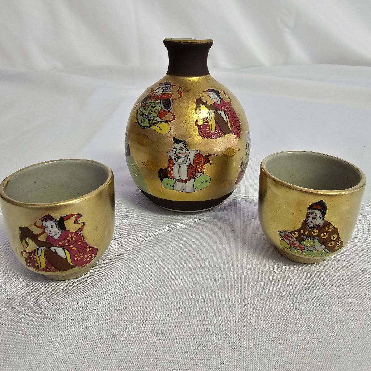 Hand painted ceramic set of two pitchers and seven cups in wooden storage case. All items have painted characters on them, surrounded by a gold background. Pitchers measure 3.25"D x 4"H, cups are 2"D x 2"H. Some minor wear on pieces, see photos for details. Shipping available.