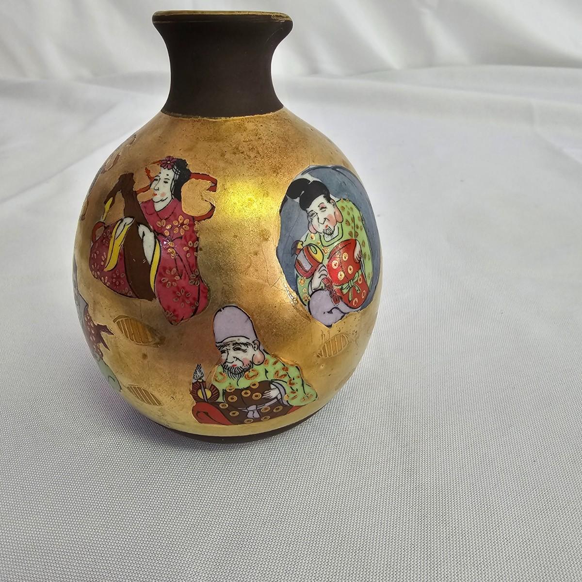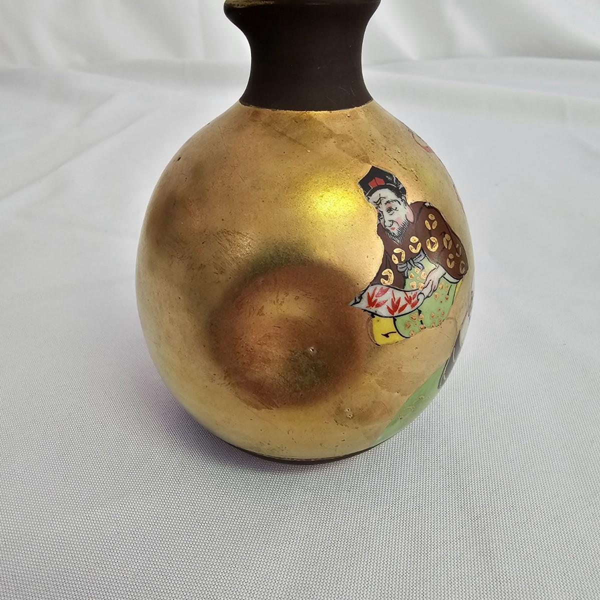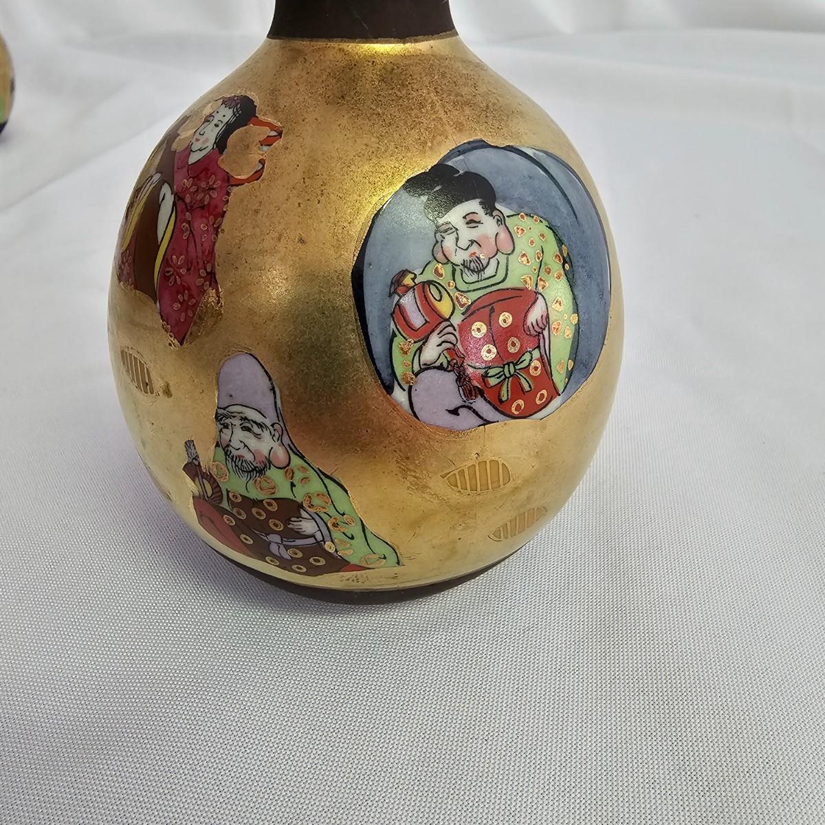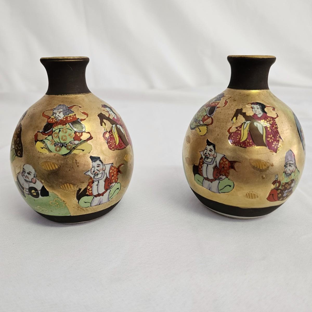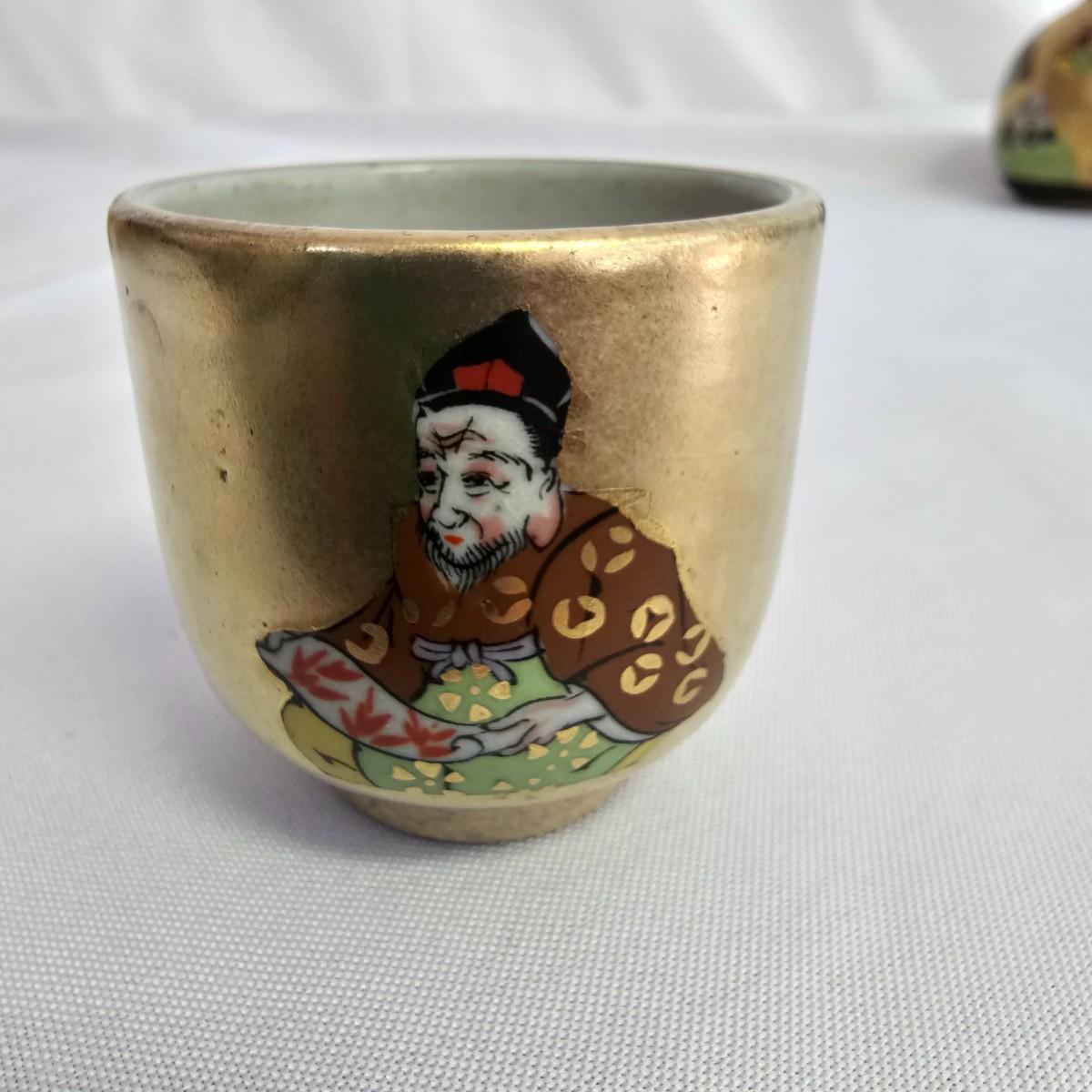 Hand painted ceramic set of two pitchers and seven cups in wooden storage case. All items have painted characters on them, surrounded by a gold background. Pitchers measure 3.25"D x 4"H, cups are 2"D x 2"H. Some minor wear on pieces, see photos for details. Shipping available.