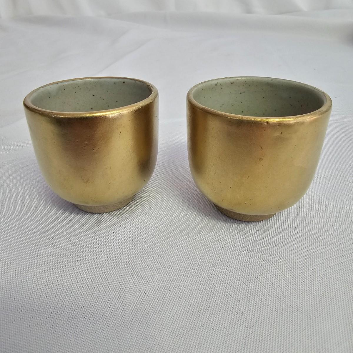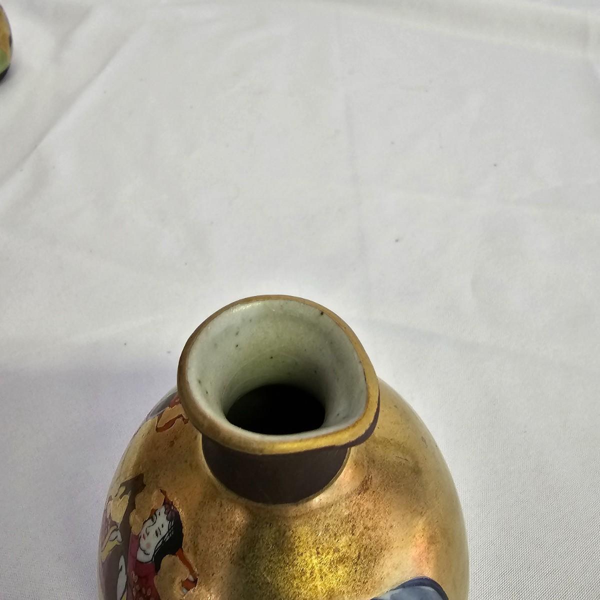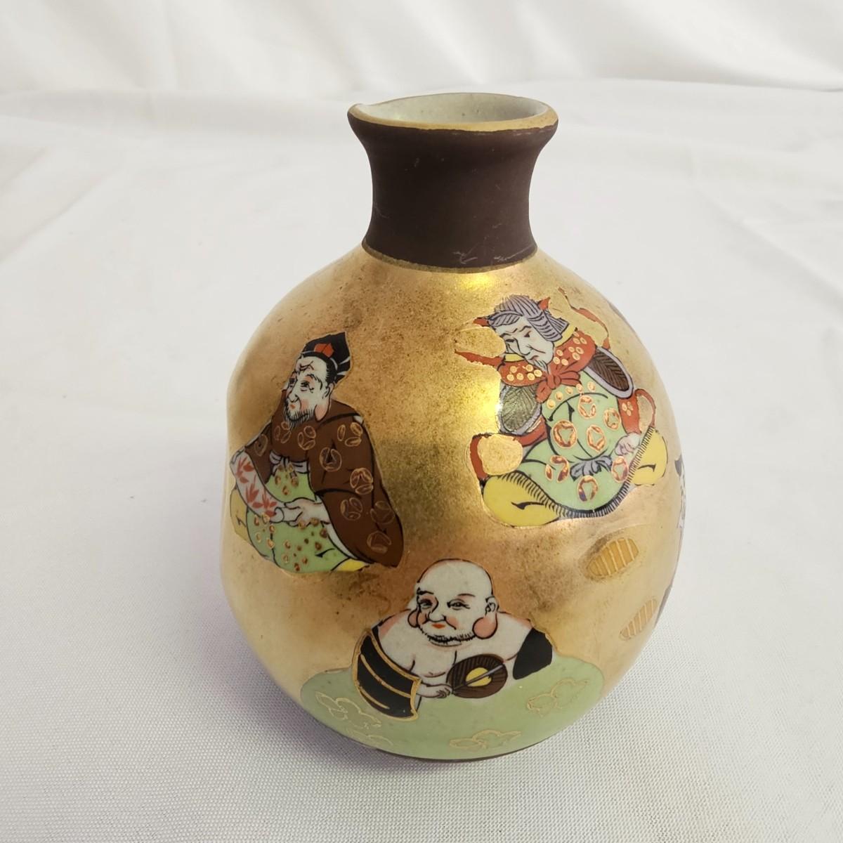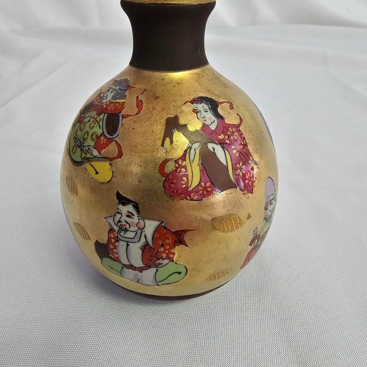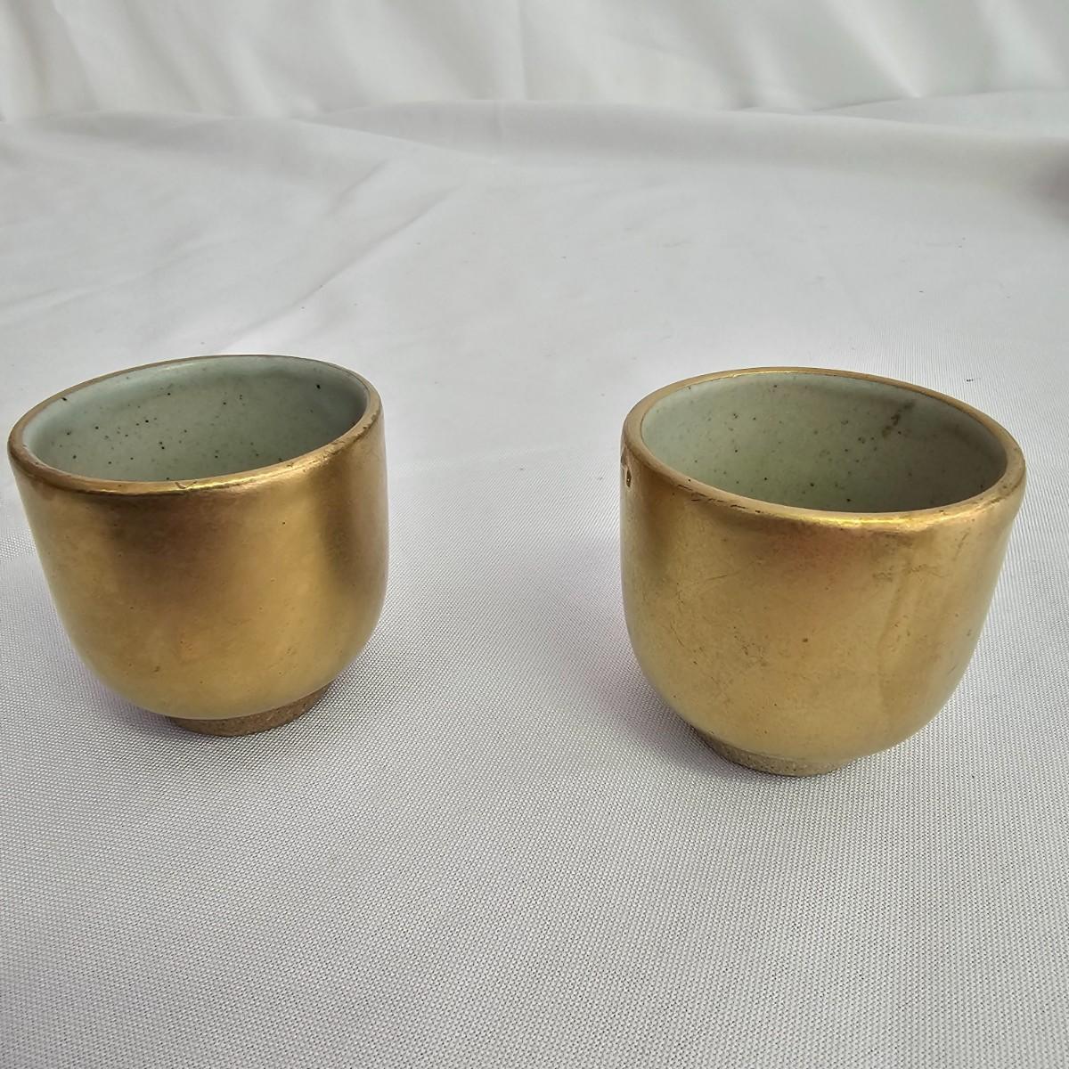 Hand painted ceramic set of two pitchers and seven cups in wooden storage case. All items have painted characters on them, surrounded by a gold background. Pitchers measure 3.25"D x 4"H, cups are 2"D x 2"H. Some minor wear on pieces, see photos for details. Shipping available.