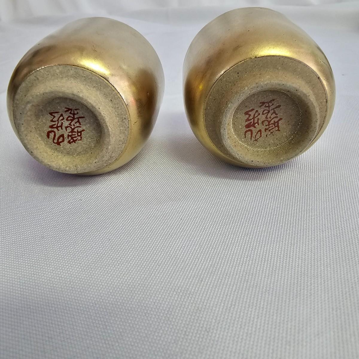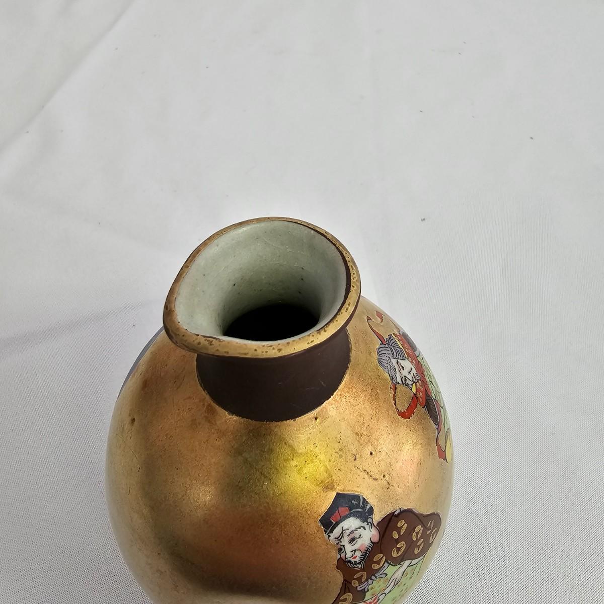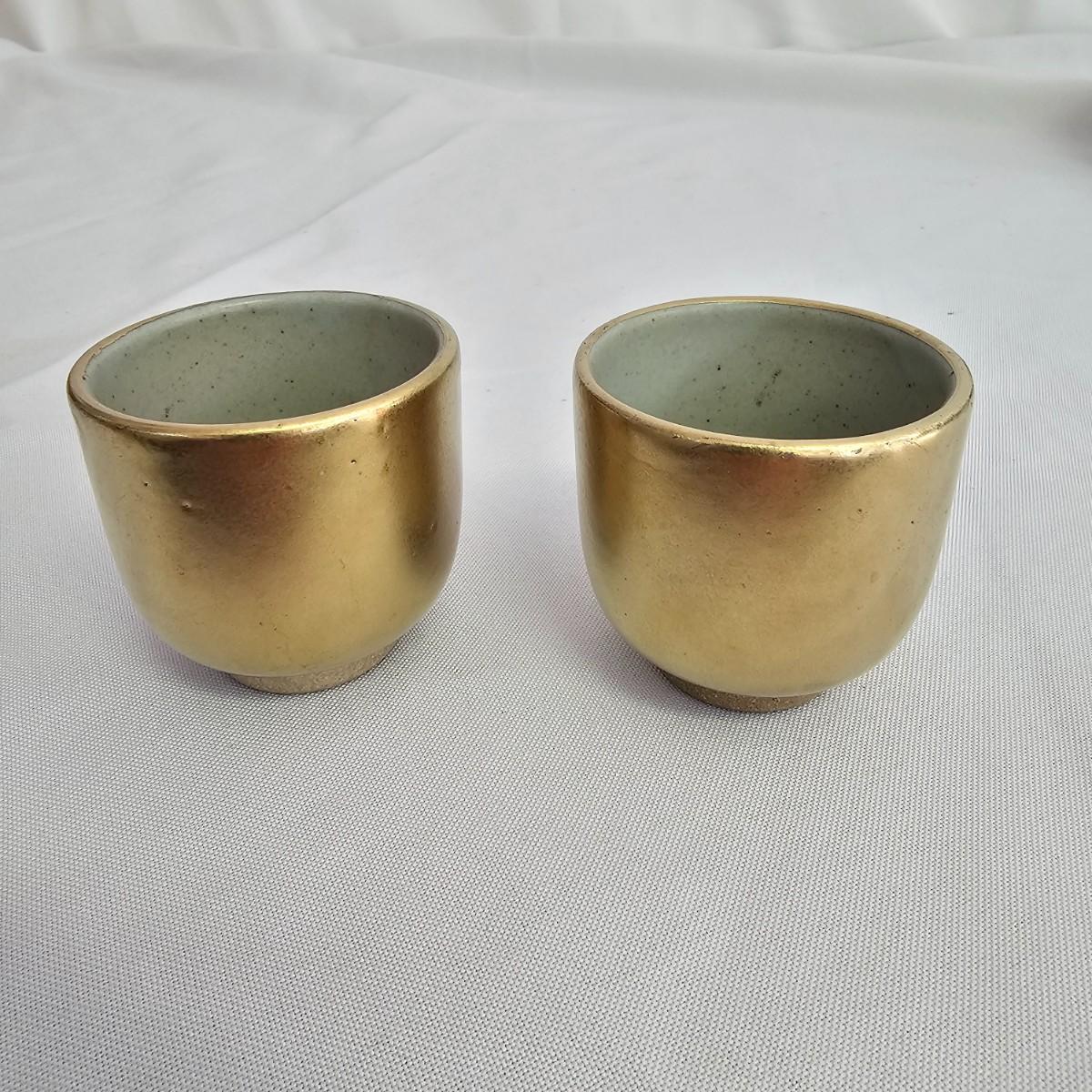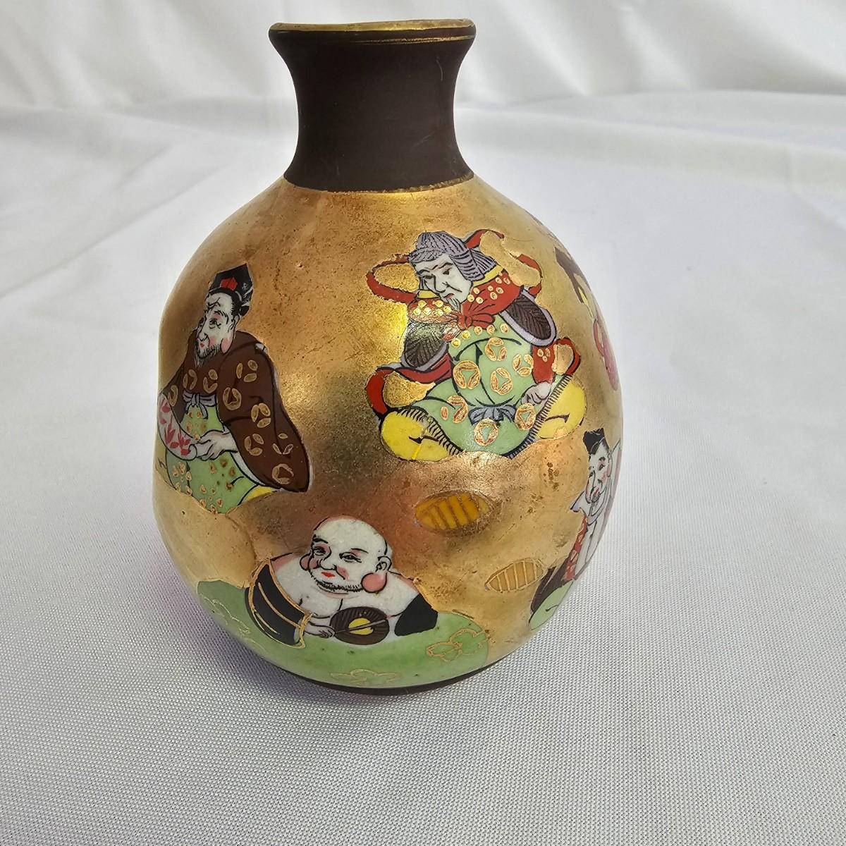 Hand painted ceramic set of two pitchers and seven cups in wooden storage case. All items have painted characters on them, surrounded by a gold background. Pitchers measure 3.25"D x 4"H, cups are 2"D x 2"H. Some minor wear on pieces, see photos for details. Shipping available.