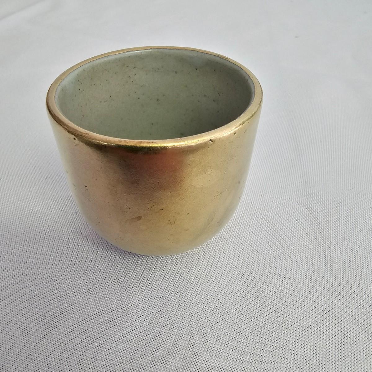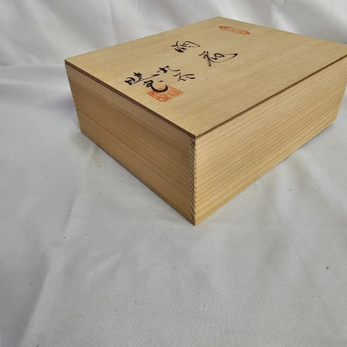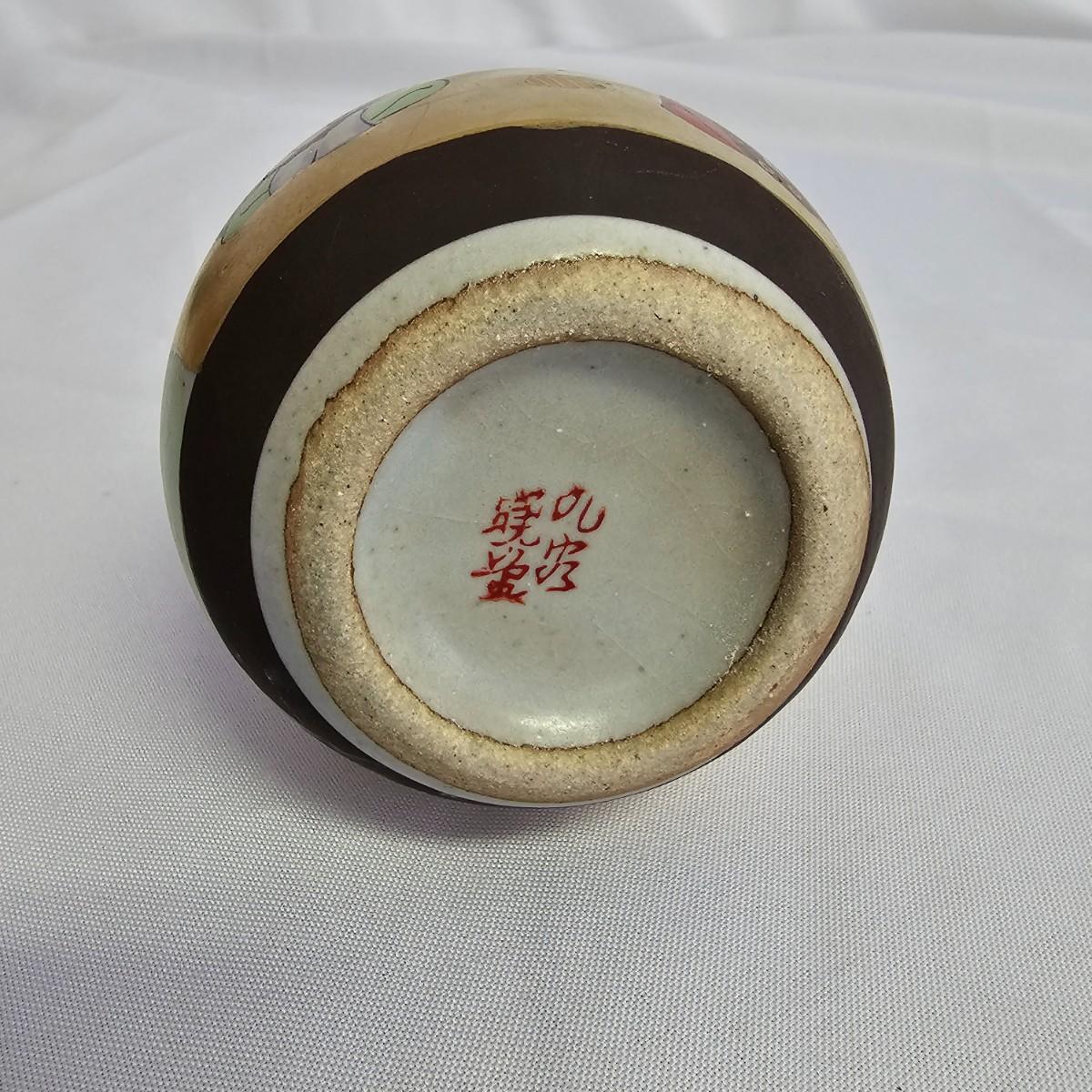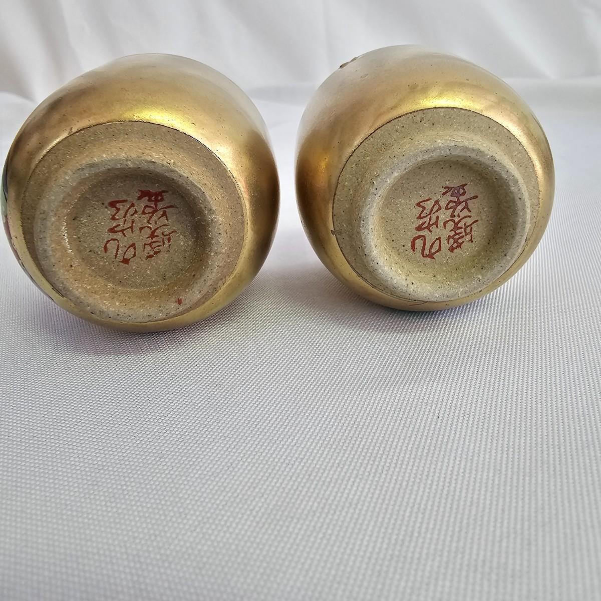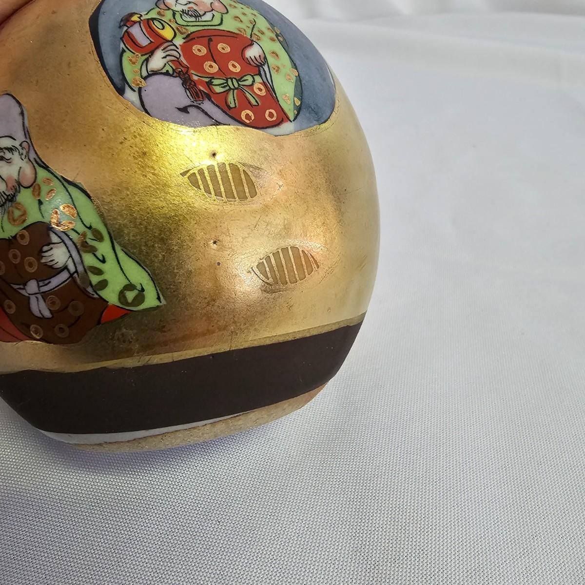 Hand painted ceramic set of two pitchers and seven cups in wooden storage case. All items have painted characters on them, surrounded by a gold background. Pitchers measure 3.25"D x 4"H, cups are 2"D x 2"H. Some minor wear on pieces, see photos for details. Shipping available.