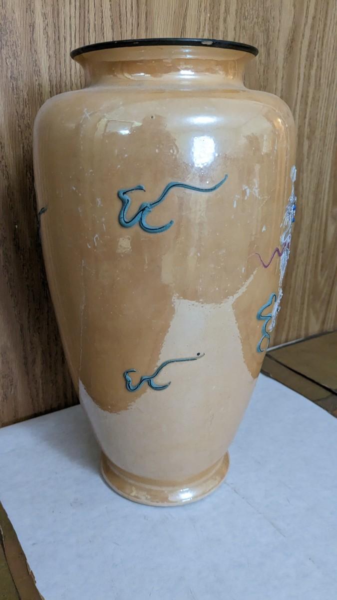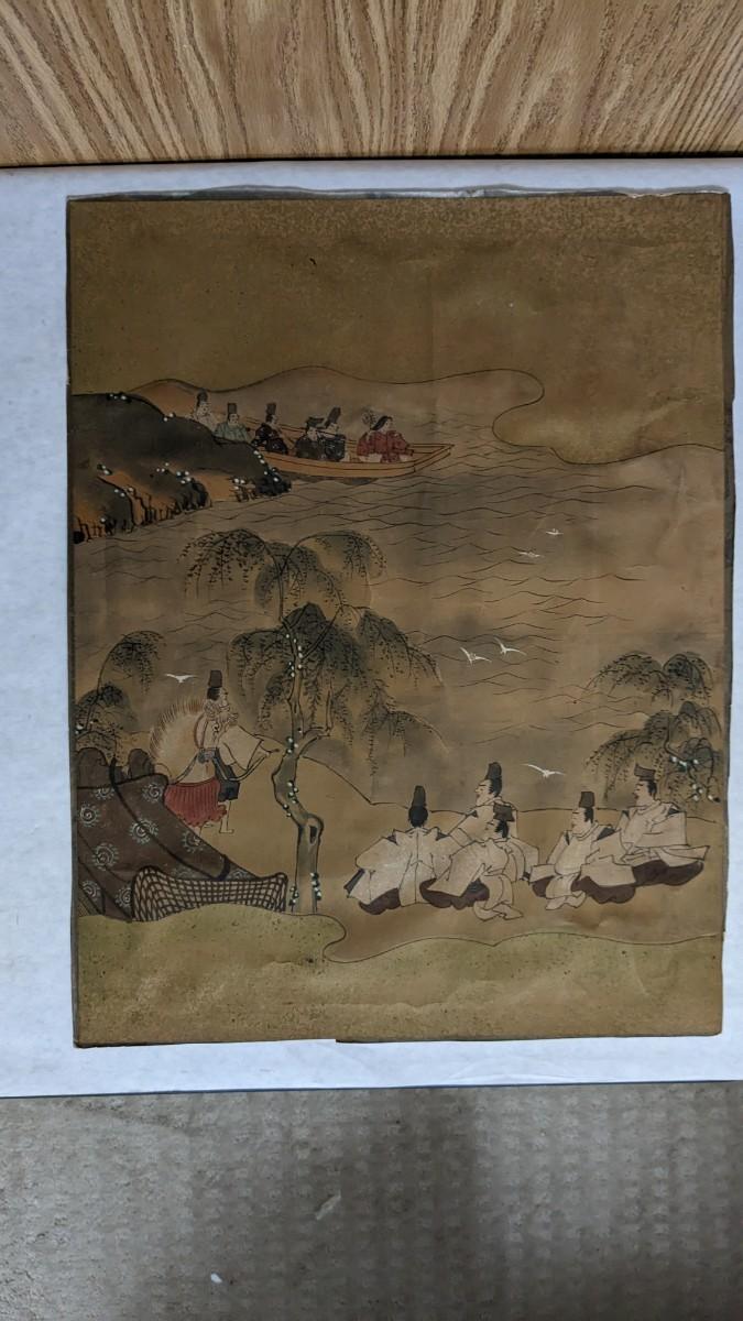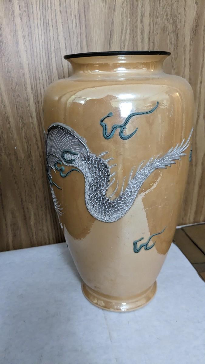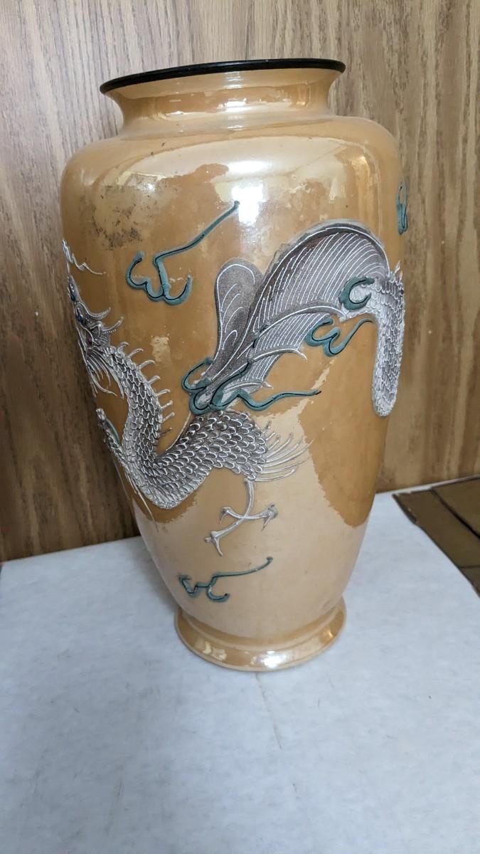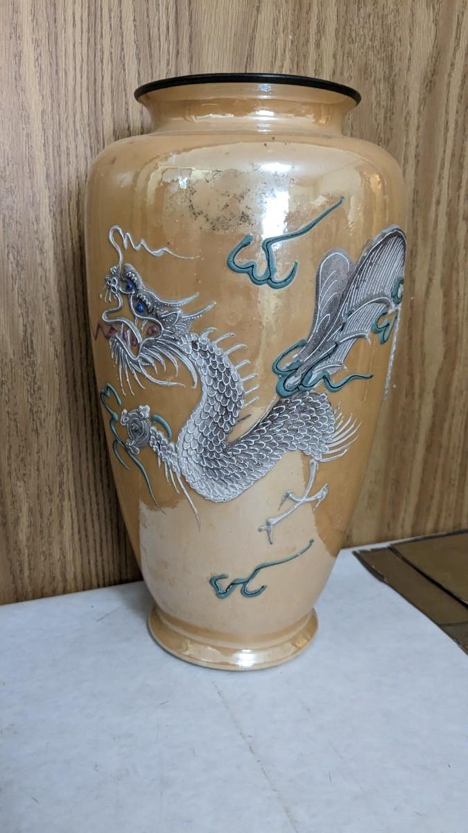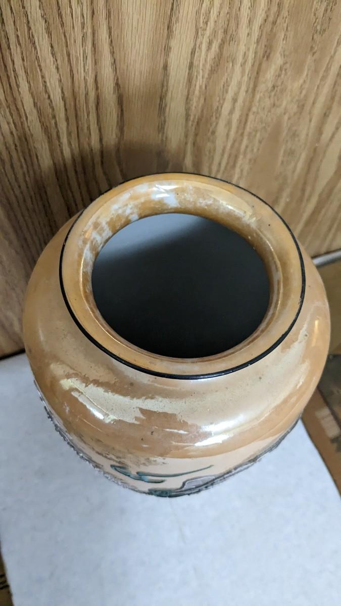12"x6" peach lustre style glaze with phenomenal raised imagery, marked on bottom, please see photos. Includes gorgeous 18"x14" rice paper art that shows very clear signs of age, though none are marked. Some damage is noted to these pieces, please make sure to note in photos. bdrm1