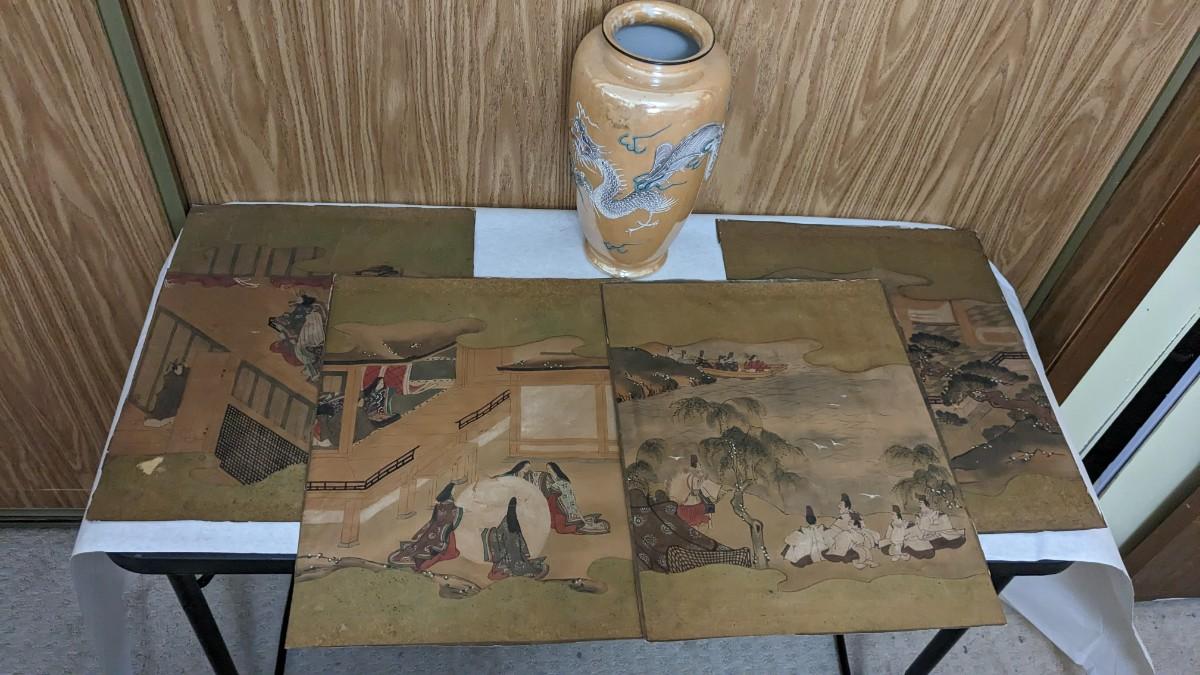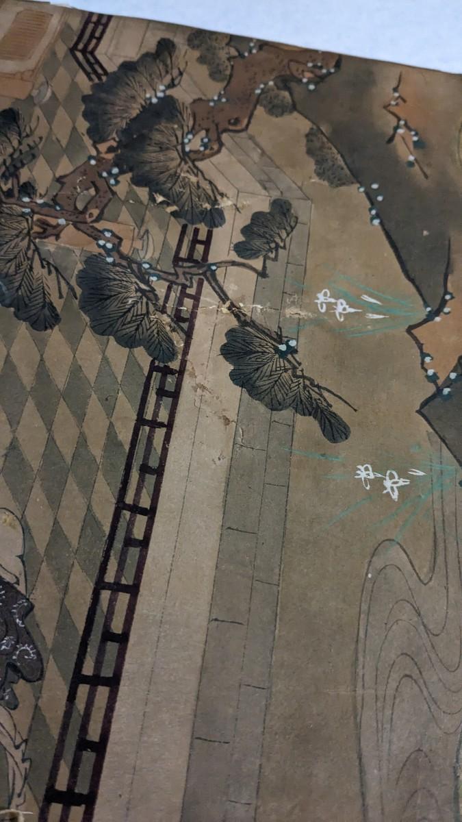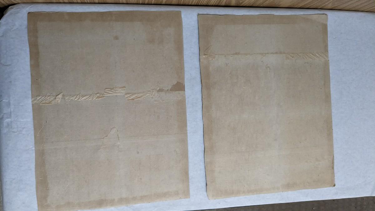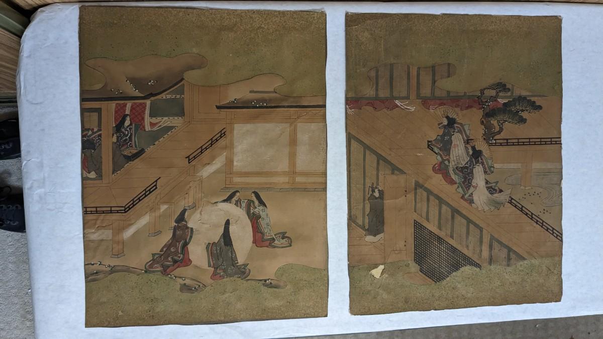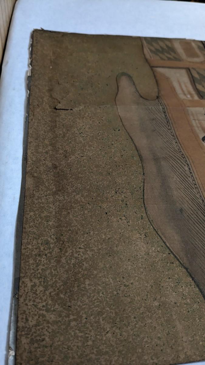 12"x6" peach lustre style glaze with phenomenal raised imagery, marked on bottom, please see photos. Includes gorgeous 18"x14" rice paper art that shows very clear signs of age, though none are marked. Some damage is noted to these pieces, please make sure to note in photos. bdrm1