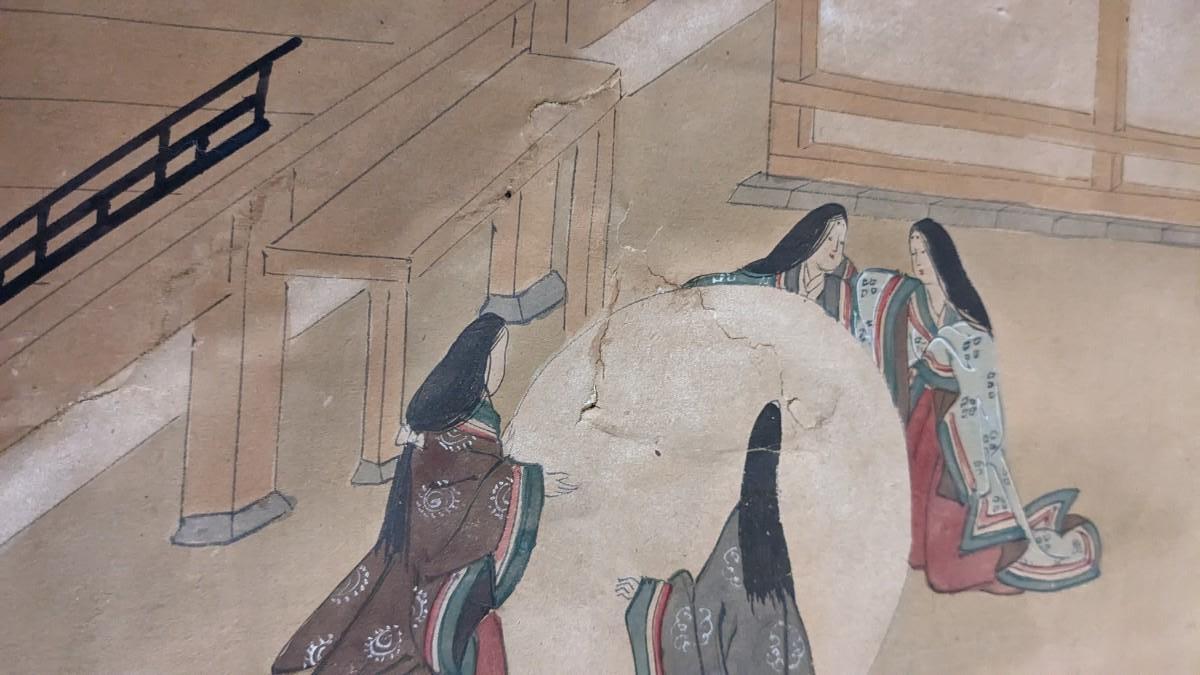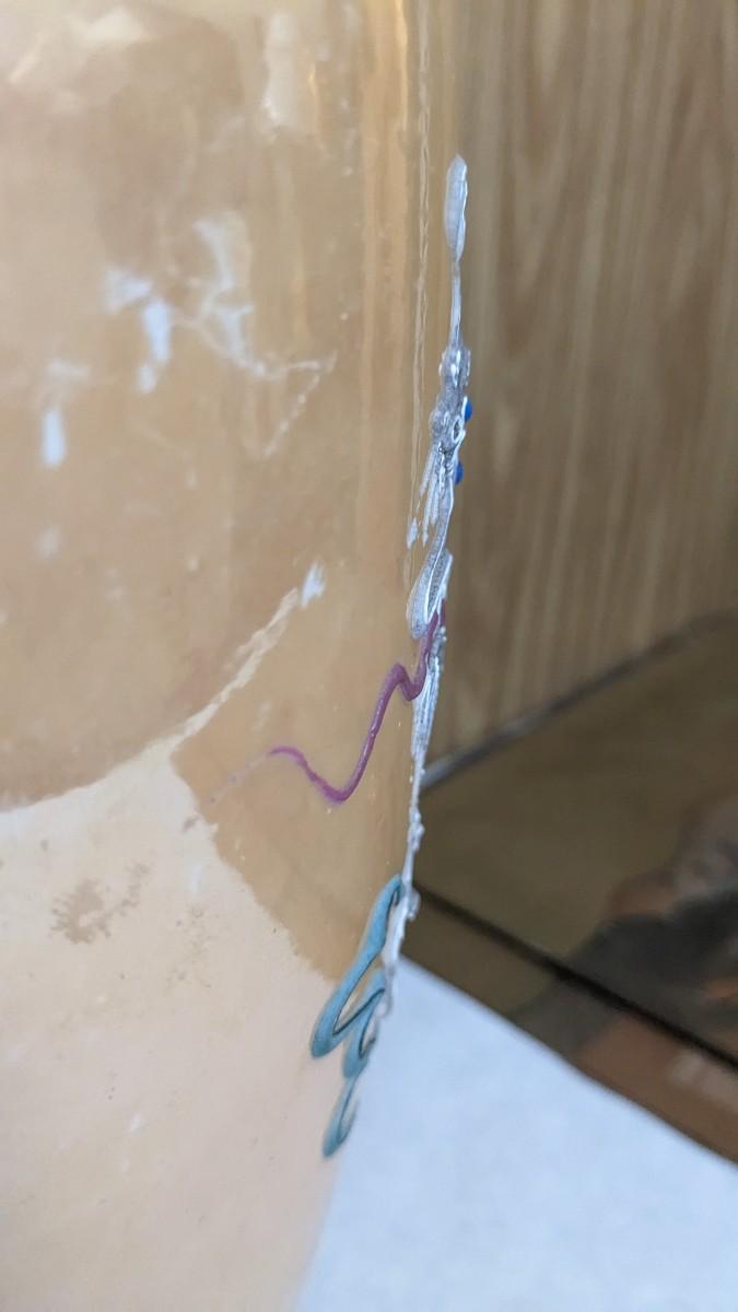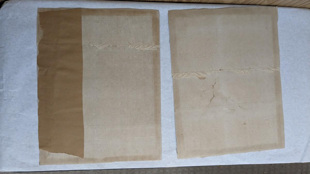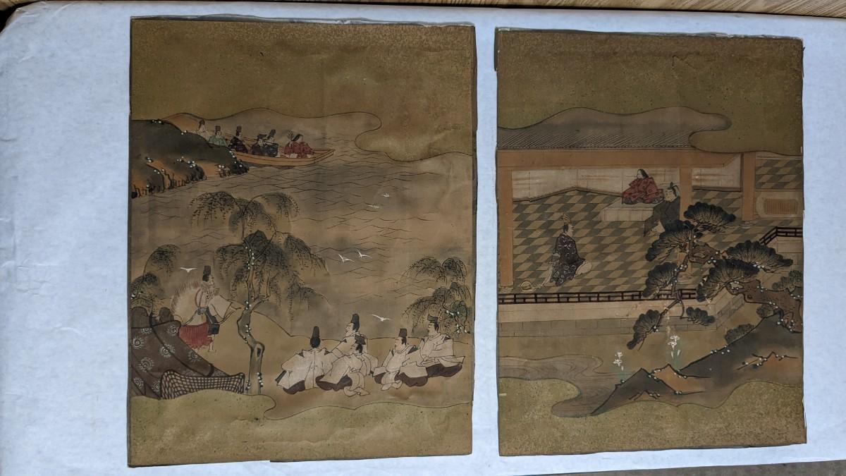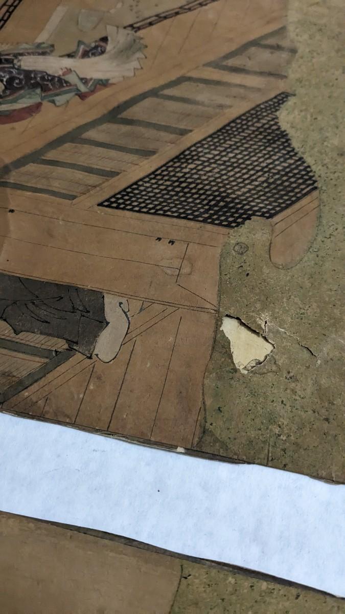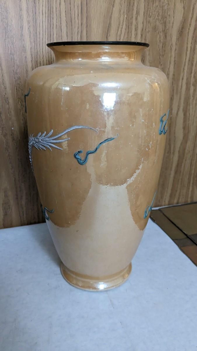 12"x6" peach lustre style glaze with phenomenal raised imagery, marked on bottom, please see photos. Includes gorgeous 18"x14" rice paper art that shows very clear signs of age, though none are marked. Some damage is noted to these pieces, please make sure to note in photos. bdrm1