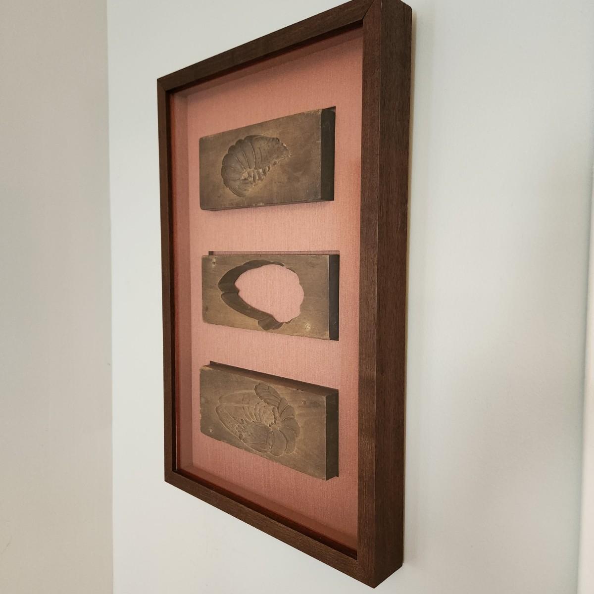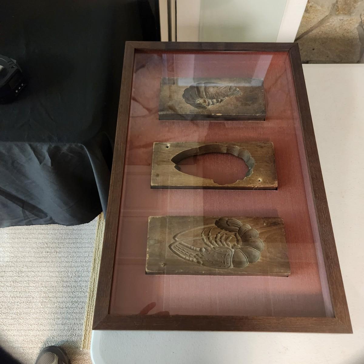 The lower two-piece Kashigata mold is carved with a strikingly detailed image of a shrimp and the upper one is a prawn.