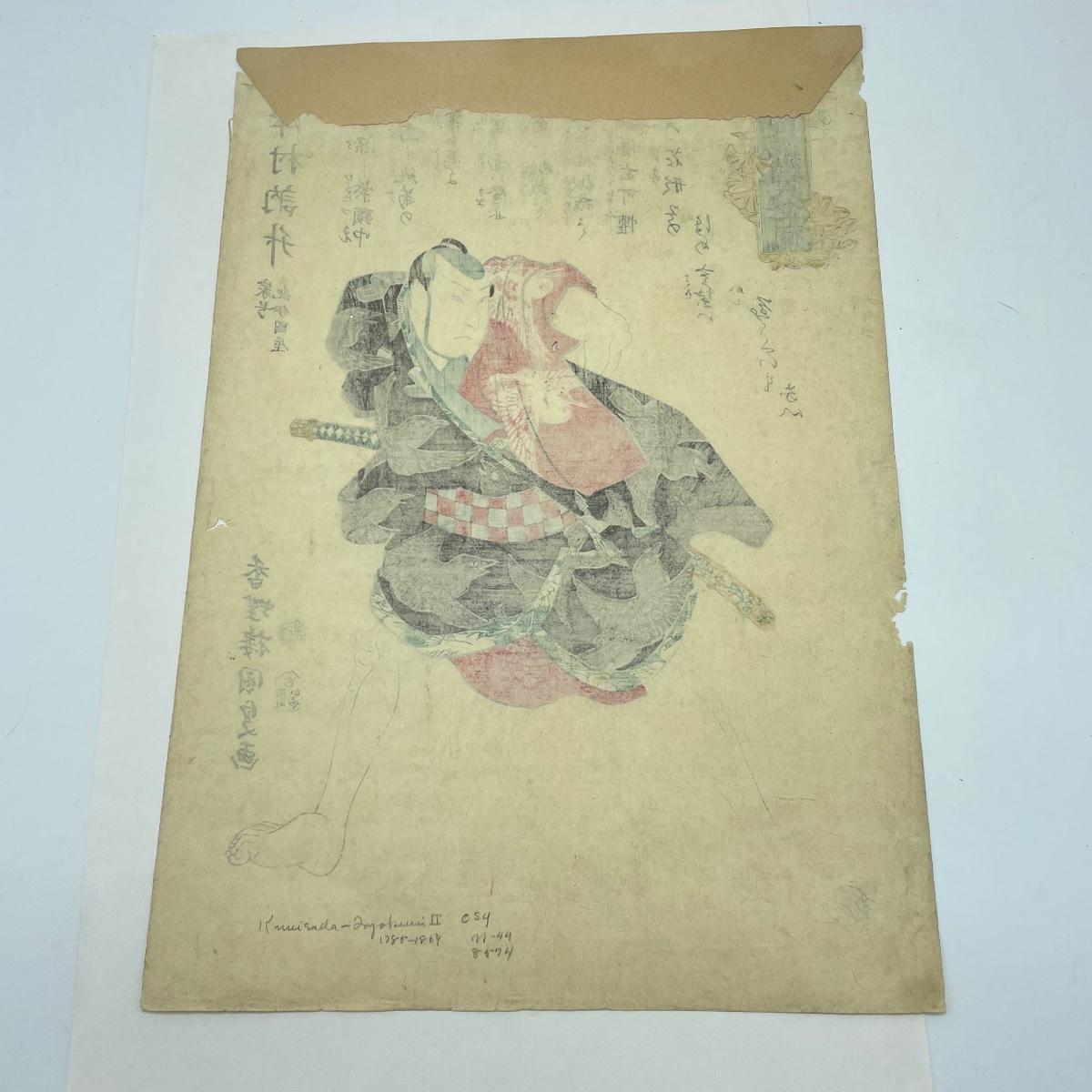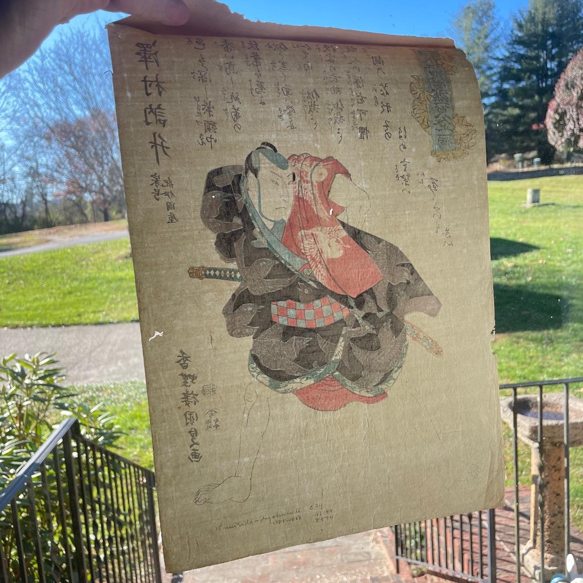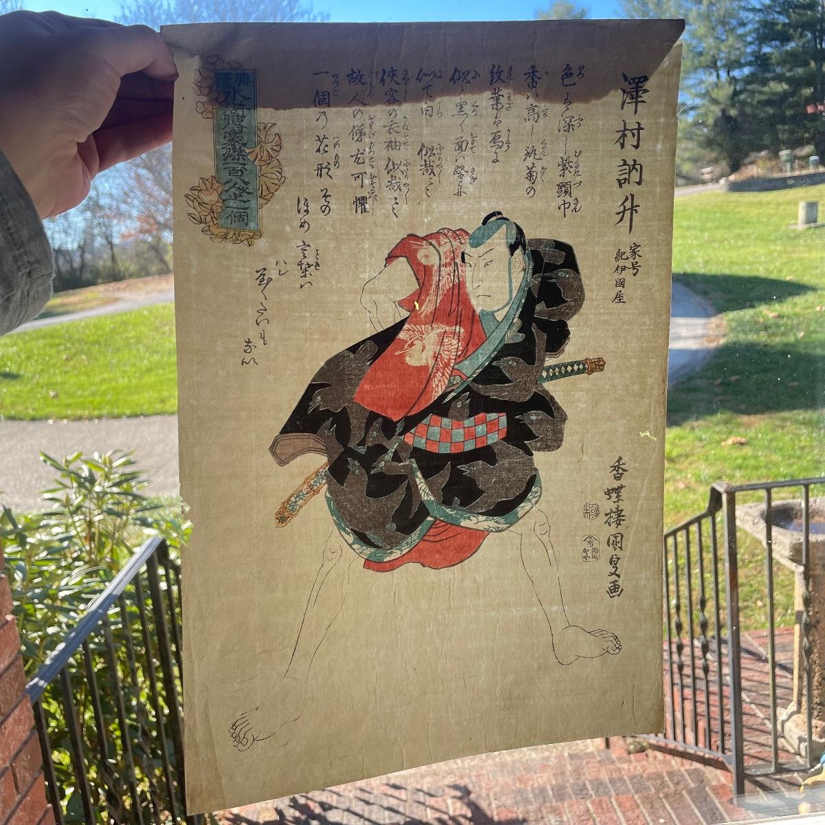 Sword wielding Samurai woodblock art. Piece measures 15” x 10.25” with fibers present. Sides of paper show minor blemishes. There is a pencil signature on the back. See images. Shipping available.