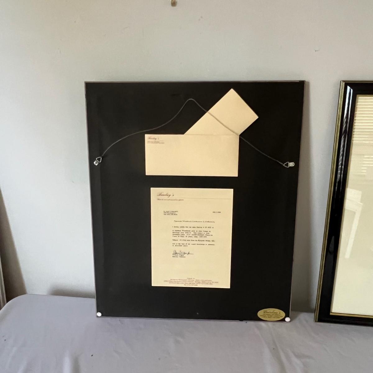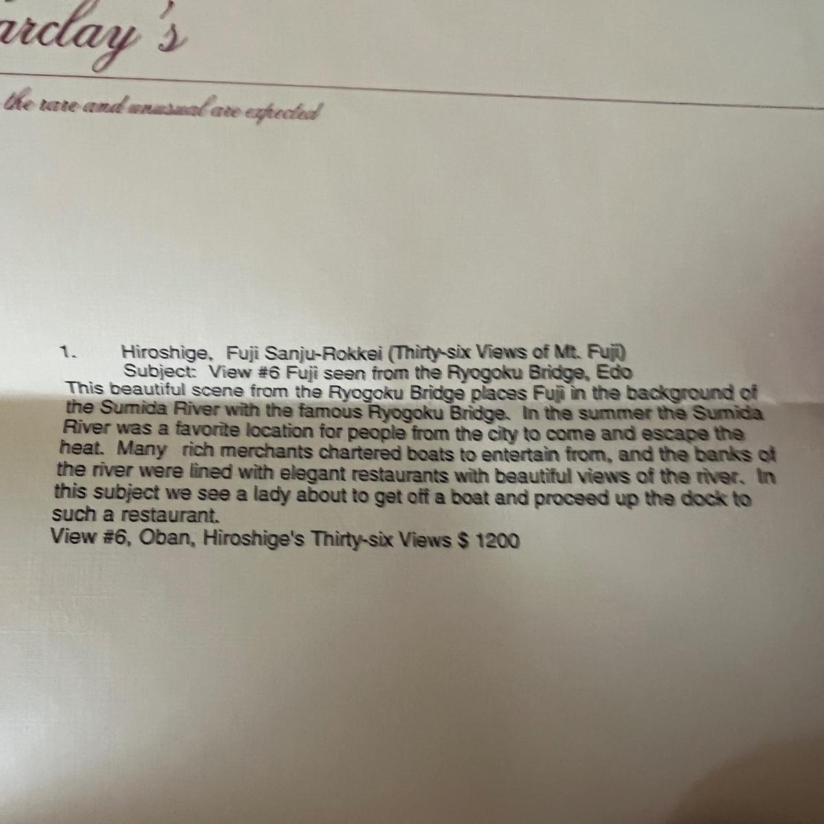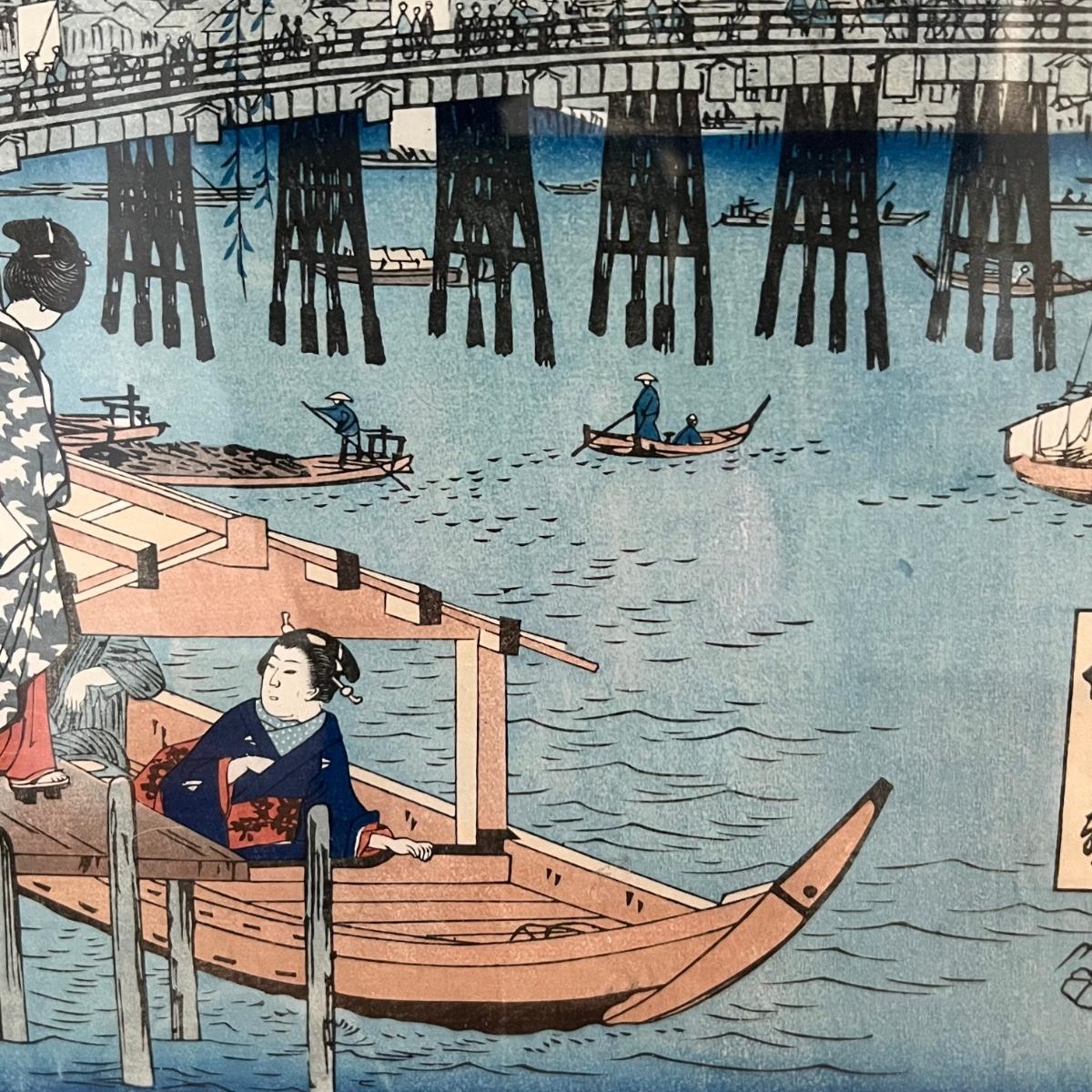 This print in Oman format from Hiroshige’s series Fuji Sanjay-Rokkei, 36 views of Fuji. This print is #6 Fuji seen from the Ryogoku Bridge. Another print from a series by Hiroshige that is in a matching frame is available in this sale. Beautiful frame is a black lacquer like wooden frame and under glass.