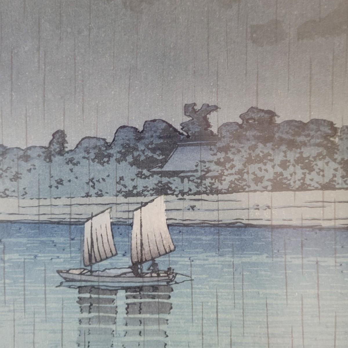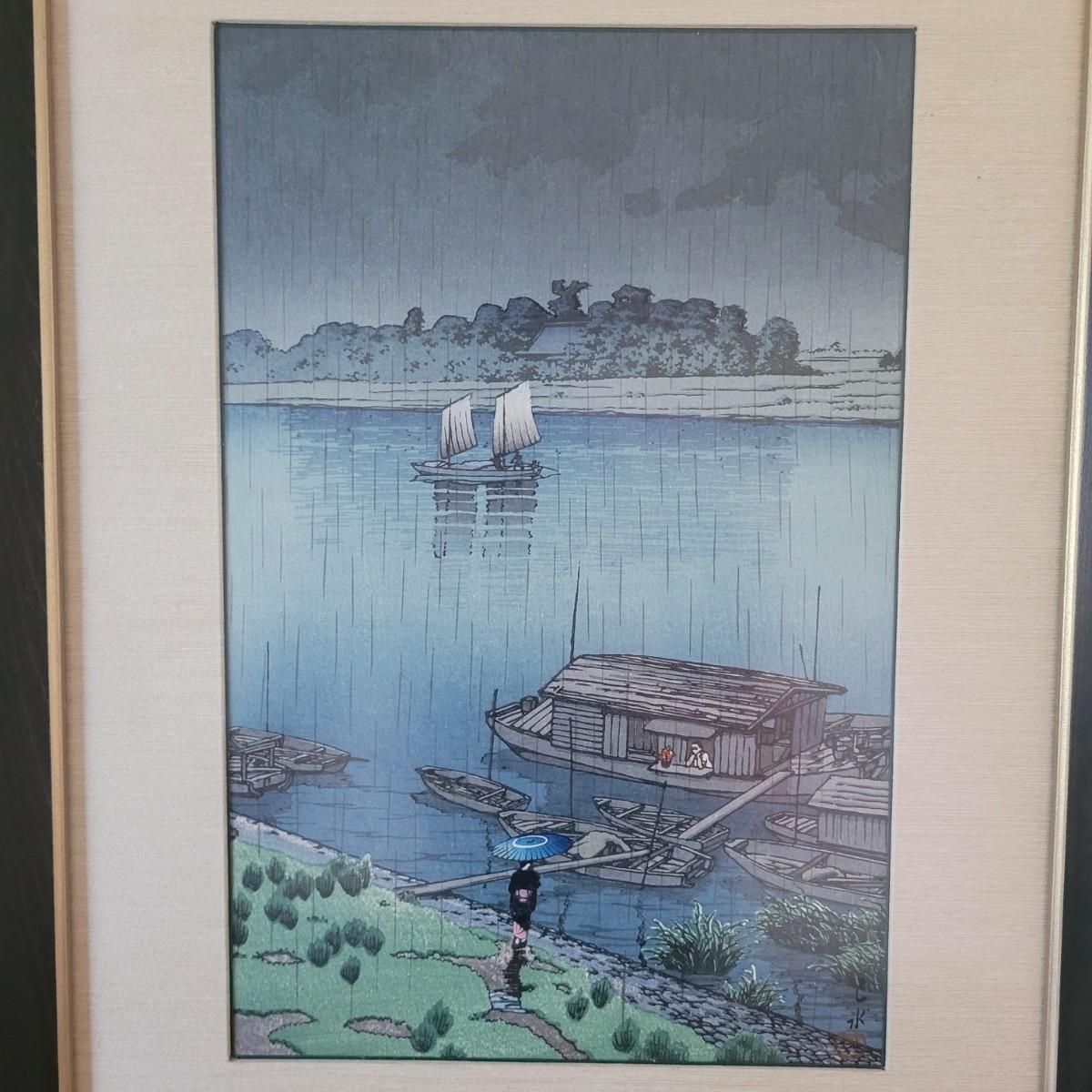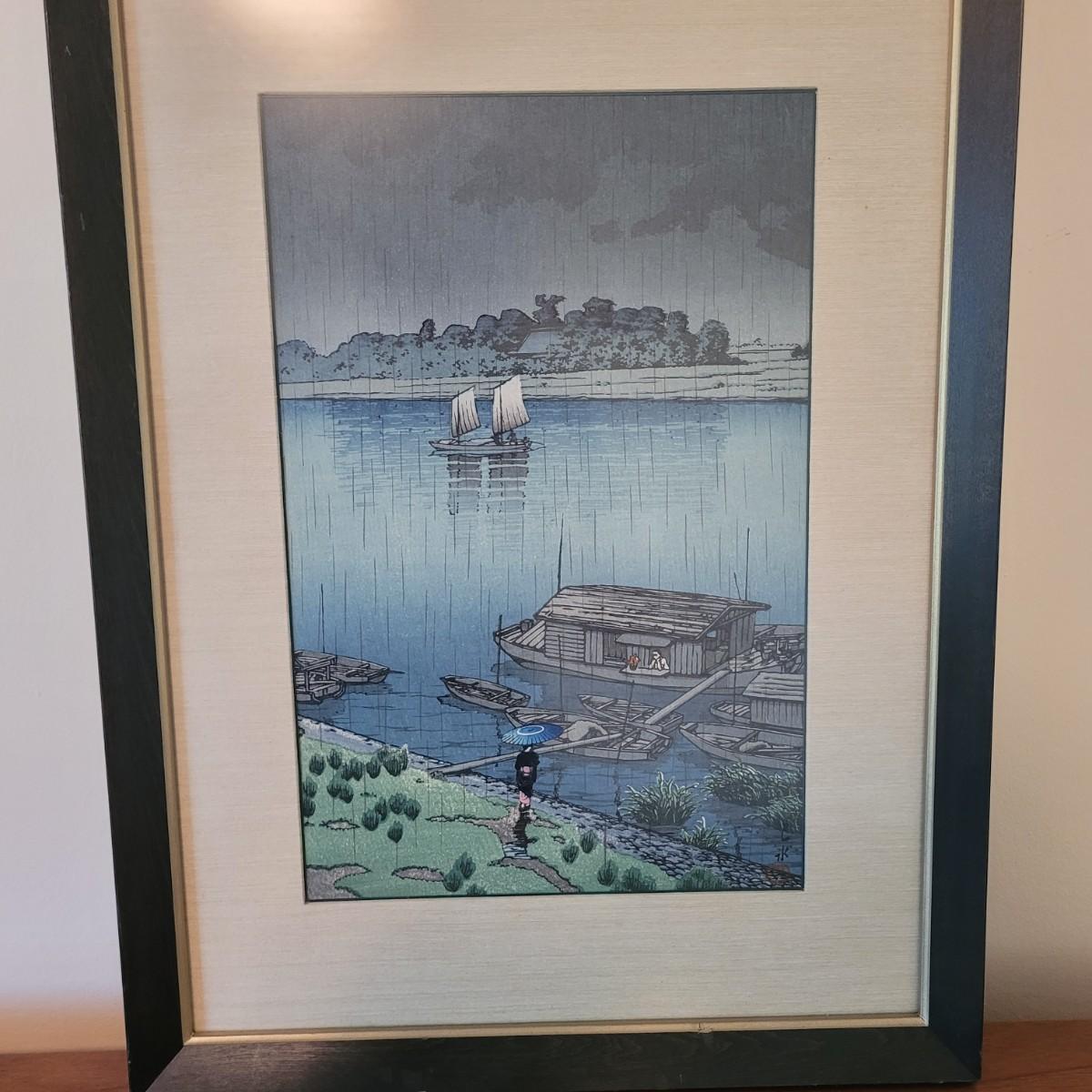 This lot appears to includes two unique pieces of what appears to be Japanese woodprint wall art. The first piece titled "May Rain on Arakawa River" depicts fishing boats on the river during a spring rain. The second piece titled "Akashi Port" depicts a bustling port with fishermen, shops, and beautiful reflections emanating from the water surface. These pieces are matted under plexiglass and framed in wood. Individually, the frames measure 16" x 21"H.