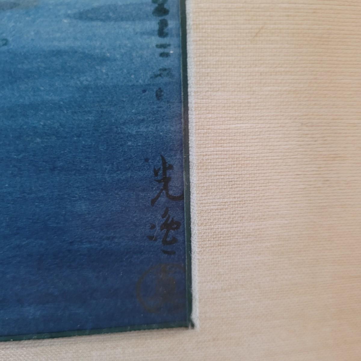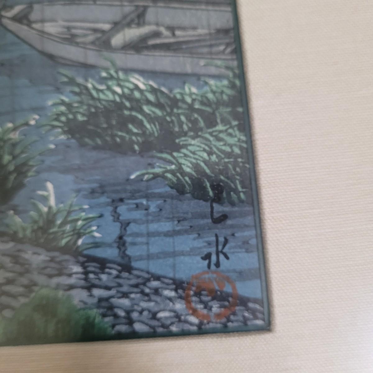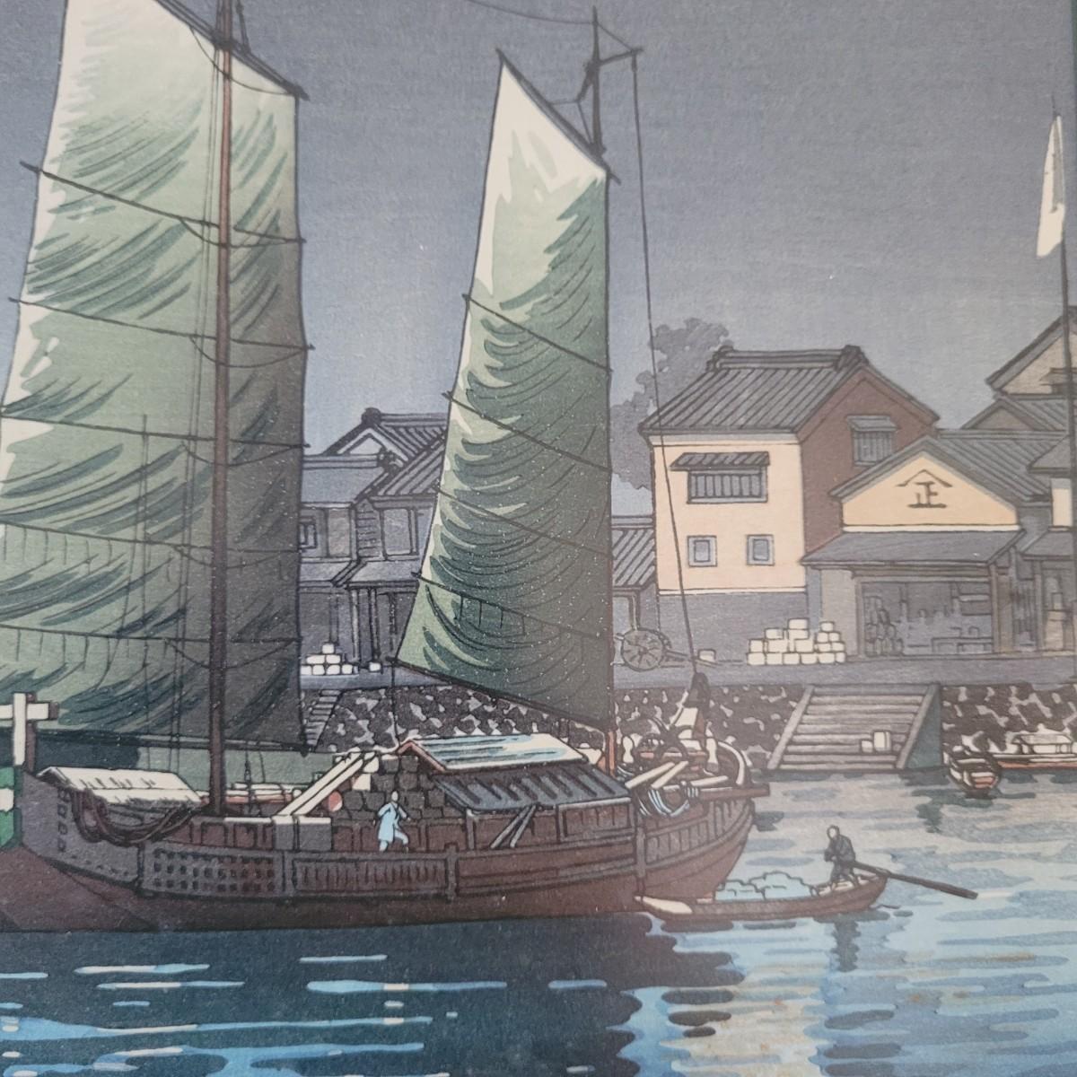 This lot appears to includes two unique pieces of what appears to be Japanese woodprint wall art. The first piece titled "May Rain on Arakawa River" depicts fishing boats on the river during a spring rain. The second piece titled "Akashi Port" depicts a bustling port with fishermen, shops, and beautiful reflections emanating from the water surface. These pieces are matted under plexiglass and framed in wood. Individually, the frames measure 16" x 21"H.
