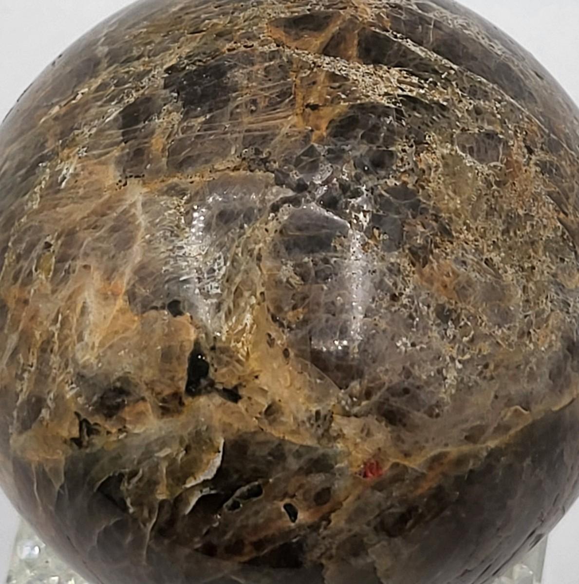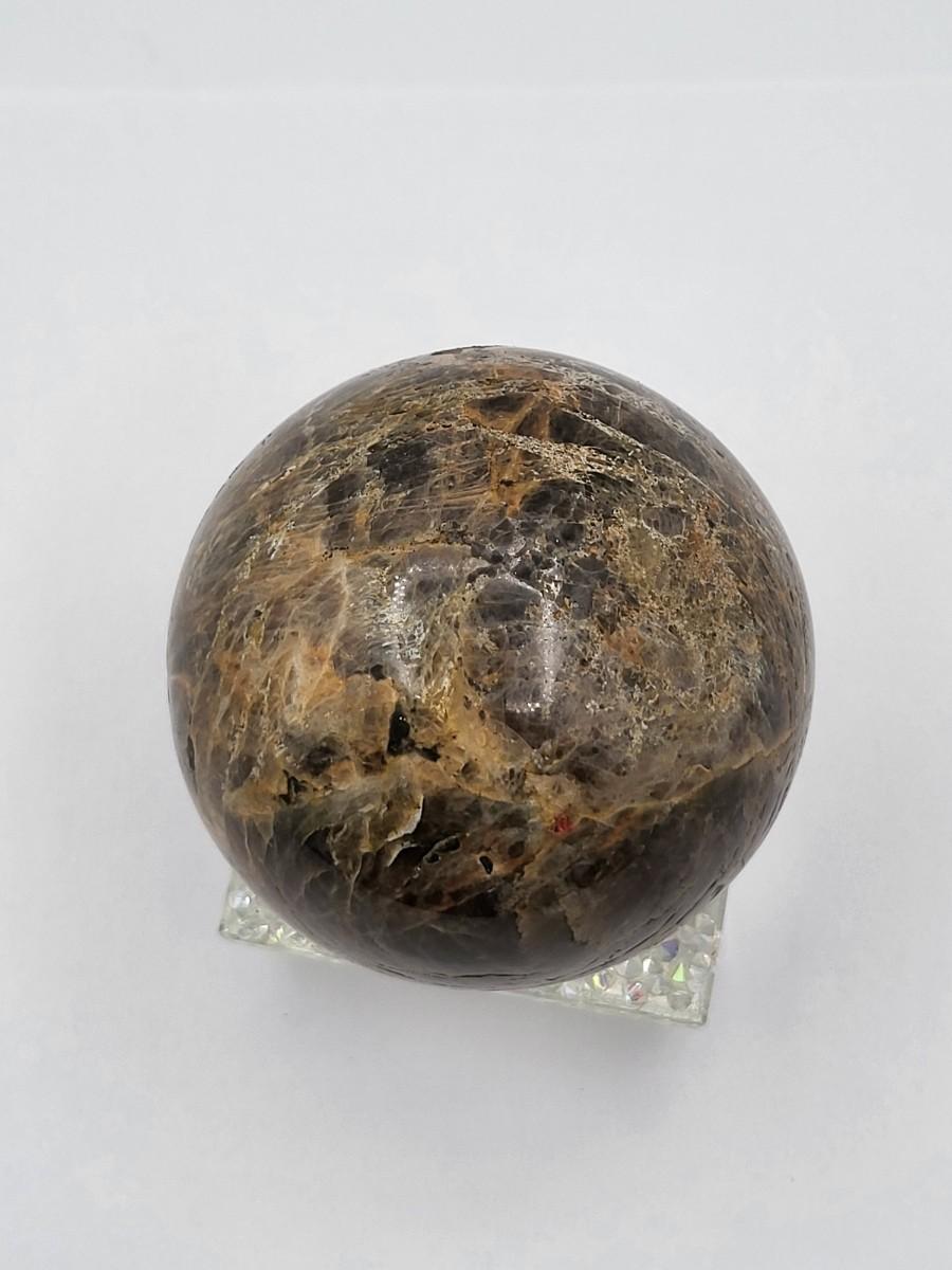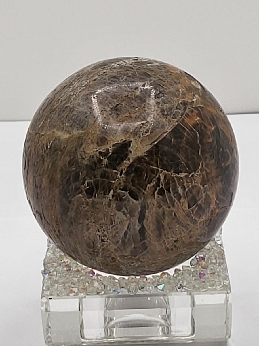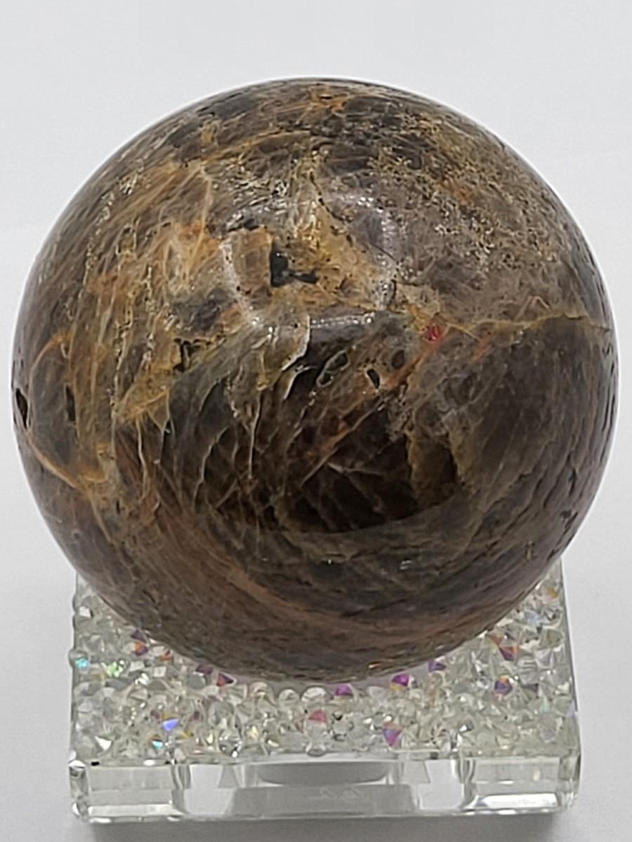 Unique marbling, polished 3" brown moonstone quartz sphere. Weighs 1.3 pounds.