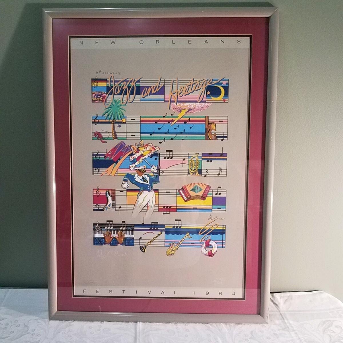 Jazz and Heritage Festival Poster. 1984, by Philip Bascle, 15th Anniversary. Approx 25.5"w x 35" h plastic frame