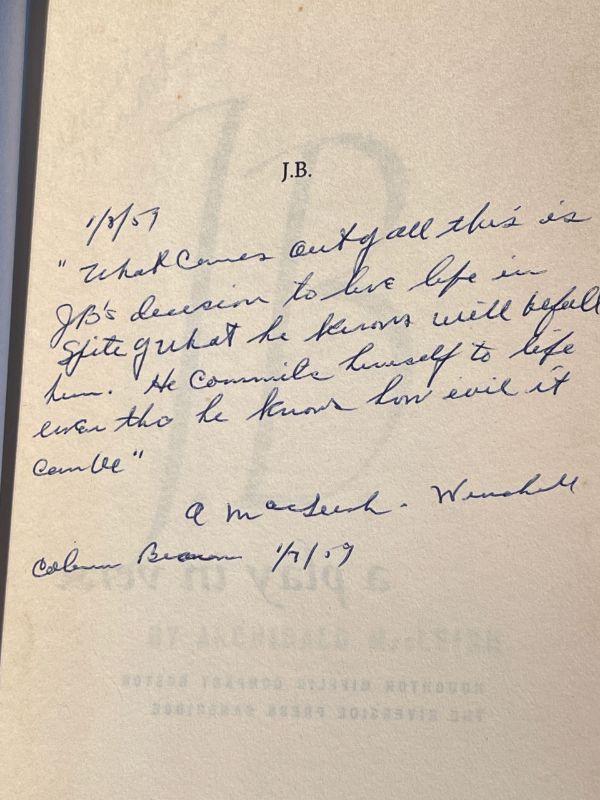 “A play in Verse.” This hardbound copy of the American Classic has a rather long and elaborate inscription, and is signed by the playwright on the title page.