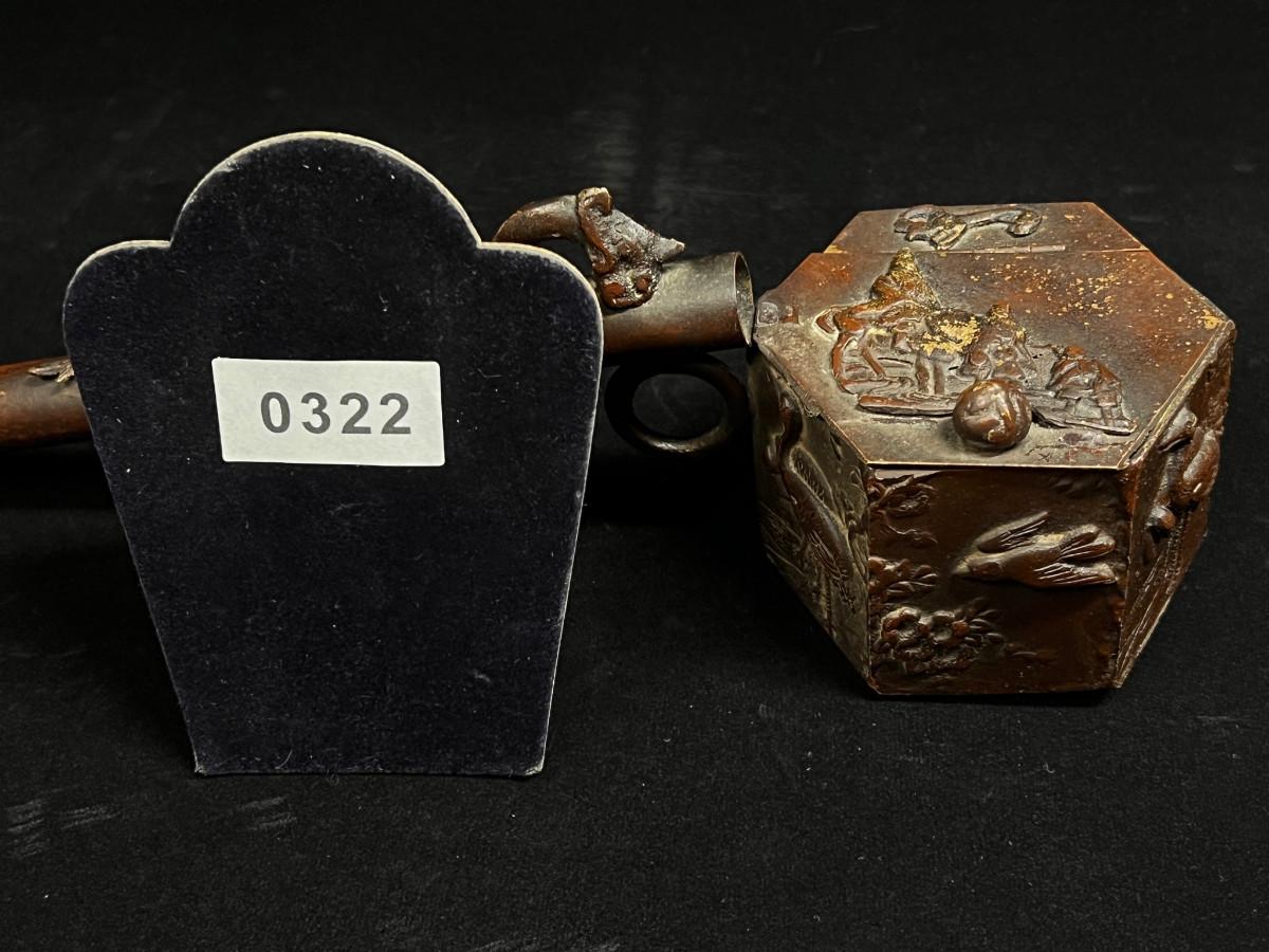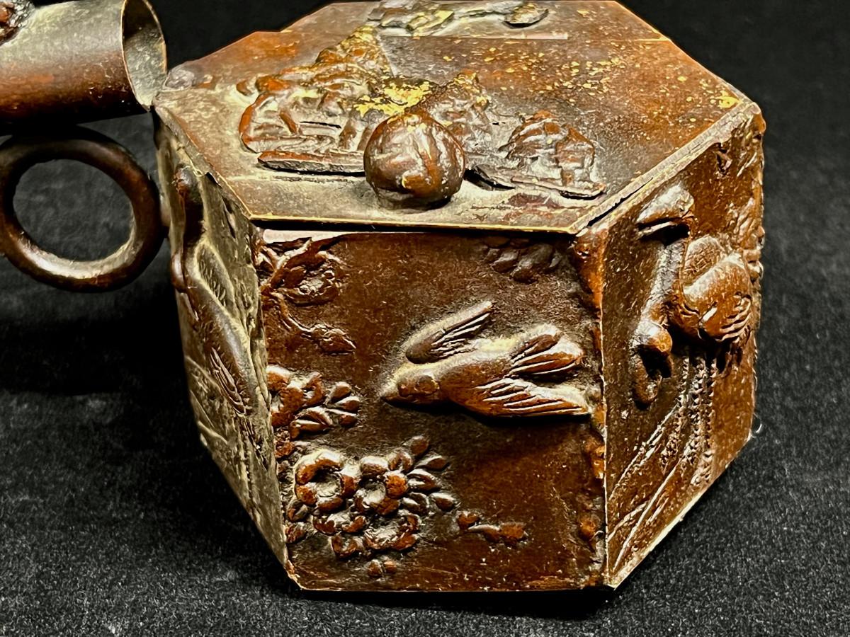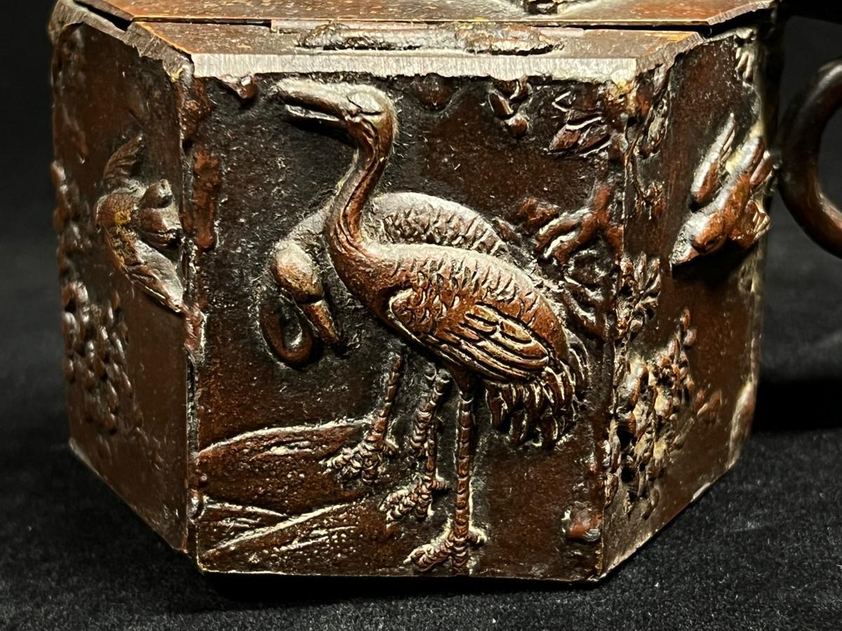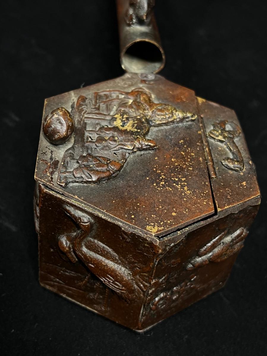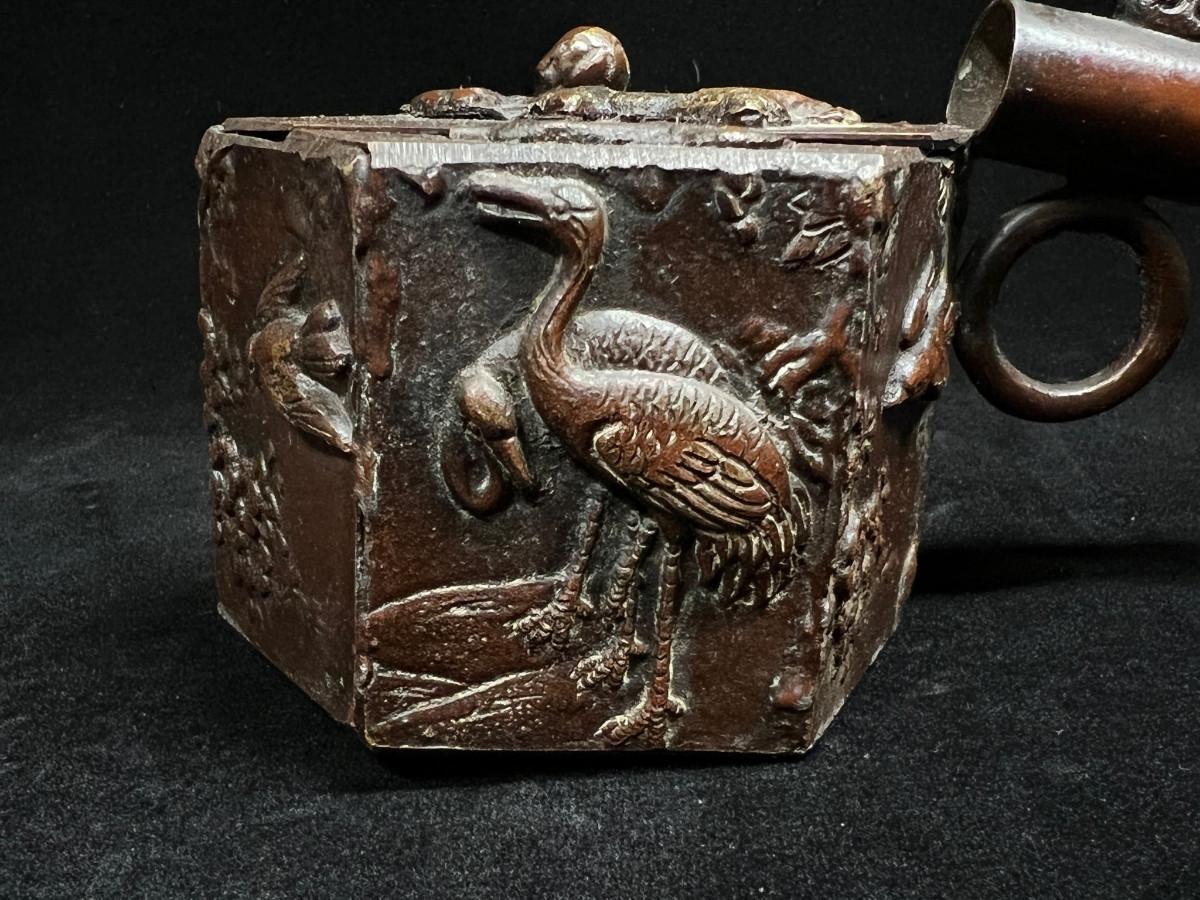 Antique bronze Chinese brushpot, lidded reservoir with traditional details - birds, cranes and nature cast into the design. This is a cool piece.
